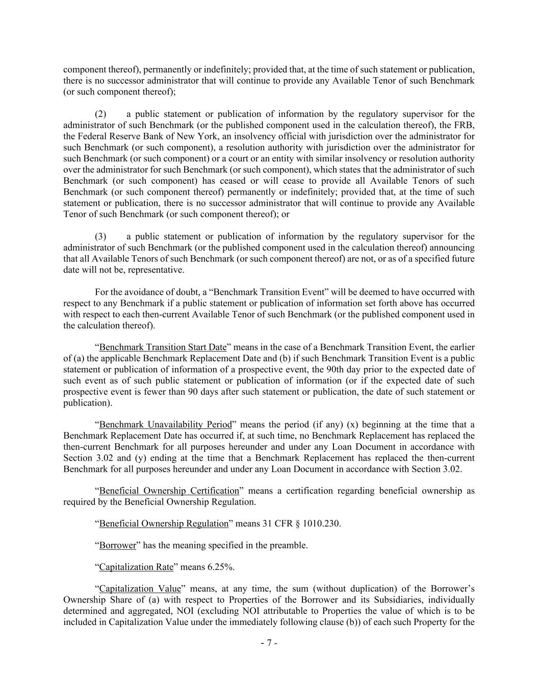 - 7 - component thereof), permanently or indefinitely; provided that, at the time of such statement or publication, there is no successor administrator that will continue to provide any Available Tenor of such Benchmark (or such component thereof); (2) a public statement or publication of information by the regulatory supervisor for the administrator of such Benchmark (or the published component used in the calculation thereof), the FRB, the Federal Reserve Bank of New York, an insolvency official with jurisdiction over the administrator for such Benchmark (or such component), a resolution authority with jurisdiction over the administrator for such Benchmark (or such component) or a court or an entity with similar insolvency or resolution authority over the administrator for such Benchmark (or such component), which states that the administrator of such Benchmark (or such component) has ceased or will cease to provide all Available Tenors of such Benchmark (or such component thereof) permanently or indefinitely; provided that, at the time of such statement or publication, there is no successor administrator that will continue to provide any Available Tenor of such Benchmark (or such component thereof); or (3) a public statement or publication of information by the regulatory supervisor for the administrator of such Benchmark (or the published component used in the calculation thereof) announcing that all Available Tenors of such Benchmark (or such component thereof) are not, or as of a specified future date will not be, representative. For the avoidance of doubt, a “Benchmark Transition Event” will be deemed to have occurred with respect to any Benchmark if a public statement or publication of information set forth above has occurred with respect to each then-current Available Tenor of such Benchmark (or the published component used in the calculation thereof). “Benchmark Transition Start Date” means in the case of a Benchmark Transition Event, the earlier of (a) the applicable Benchmark Replacement Date and (b) if such Benchmark Transition Event is a public statement or publication of information of a prospective event, the 90th day prior to the expected date of such event as of such public statement or publication of information (or if the expected date of such prospective event is fewer than 90 days after such statement or publication, the date of such statement or publication). “Benchmark Unavailability Period” means the period (if any) (x) beginning at the time that a Benchmark Replacement Date has occurred if, at such time, no Benchmark Replacement has replaced the then-current Benchmark for all purposes hereunder and under any Loan Document in accordance with Section 3.02 and (y) ending at the time that a Benchmark Replacement has replaced the then-current Benchmark for all purposes hereunder and under any Loan Document in accordance with Section 3.02. “Beneficial Ownership Certification” means a certification regarding beneficial ownership as required by the Beneficial Ownership Regulation. “Beneficial Ownership Regulation” means 31 CFR § 1010.230. “Borrower” has the meaning specified in the preamble. “Capitalization Rate” means 6.25%. “Capitalization Value” means, at any time, the sum (without duplication) of the Borrower’s Ownership Share of (a) with respect to Properties of the Borrower and its Subsidiaries, individually determined and aggregated, NOI (excluding NOI attributable to Properties the value of which is to be included in Capitalization Value under the immediately following clause (b)) of each such Property for the