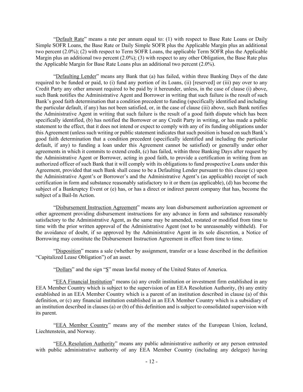 - 12 - “Default Rate” means a rate per annum equal to: (1) with respect to Base Rate Loans or Daily Simple SOFR Loans, the Base Rate or Daily Simple SOFR plus the Applicable Margin plus an additional two percent (2.0%); (2) with respect to Term SOFR Loans, the applicable Term SOFR plus the Applicable Margin plus an additional two percent (2.0%); (3) with respect to any other Obligation, the Base Rate plus the Applicable Margin for Base Rate Loans plus an additional two percent (2.0%). “Defaulting Lender” means any Bank that (a) has failed, within three Banking Days of the date required to be funded or paid, to (i) fund any portion of its Loans, (ii) [reserved] or (iii) pay over to any Credit Party any other amount required to be paid by it hereunder, unless, in the case of clause (i) above, such Bank notifies the Administrative Agent and Borrower in writing that such failure is the result of such Bank’s good faith determination that a condition precedent to funding (specifically identified and including the particular default, if any) has not been satisfied, or, in the case of clause (iii) above, such Bank notifies the Administrative Agent in writing that such failure is the result of a good faith dispute which has been specifically identified, (b) has notified the Borrower or any Credit Party in writing, or has made a public statement to the effect, that it does not intend or expect to comply with any of its funding obligations under this Agreement (unless such writing or public statement indicates that such position is based on such Bank’s good faith determination that a condition precedent (specifically identified and including the particular default, if any) to funding a loan under this Agreement cannot be satisfied) or generally under other agreements in which it commits to extend credit, (c) has failed, within three Banking Days after request by the Administrative Agent or Borrower, acting in good faith, to provide a certification in writing from an authorized officer of such Bank that it will comply with its obligations to fund prospective Loans under this Agreement, provided that such Bank shall cease to be a Defaulting Lender pursuant to this clause (c) upon the Administrative Agent’s or Borrower’s and the Administrative Agent’s (as applicable) receipt of such certification in form and substance reasonably satisfactory to it or them (as applicable), (d) has become the subject of a Bankruptcy Event or (e) has, or has a direct or indirect parent company that has, become the subject of a Bail-In Action. “Disbursement Instruction Agreement” means any loan disbursement authorization agreement or other agreement providing disbursement instructions for any advance in form and substance reasonably satisfactory to the Administrative Agent, as the same may be amended, restated or modified from time to time with the prior written approval of the Administrative Agent (not to be unreasonably withheld). For the avoidance of doubt, if so approved by the Administrative Agent in its sole discretion, a Notice of Borrowing may constitute the Disbursement Instruction Agreement in effect from time to time. “Disposition” means a sale (whether by assignment, transfer or a lease described in the definition “Capitalized Lease Obligation”) of an asset. “Dollars” and the sign “$” mean lawful money of the United States of America. “EEA Financial Institution” means (a) any credit institution or investment firm established in any EEA Member Country which is subject to the supervision of an EEA Resolution Authority, (b) any entity established in an EEA Member Country which is a parent of an institution described in clause (a) of this definition, or (c) any financial institution established in an EEA Member Country which is a subsidiary of an institution described in clauses (a) or (b) of this definition and is subject to consolidated supervision with its parent. “EEA Member Country” means any of the member states of the European Union, Iceland, Liechtenstein, and Norway. “EEA Resolution Authority” means any public administrative authority or any person entrusted with public administrative authority of any EEA Member Country (including any delegee) having