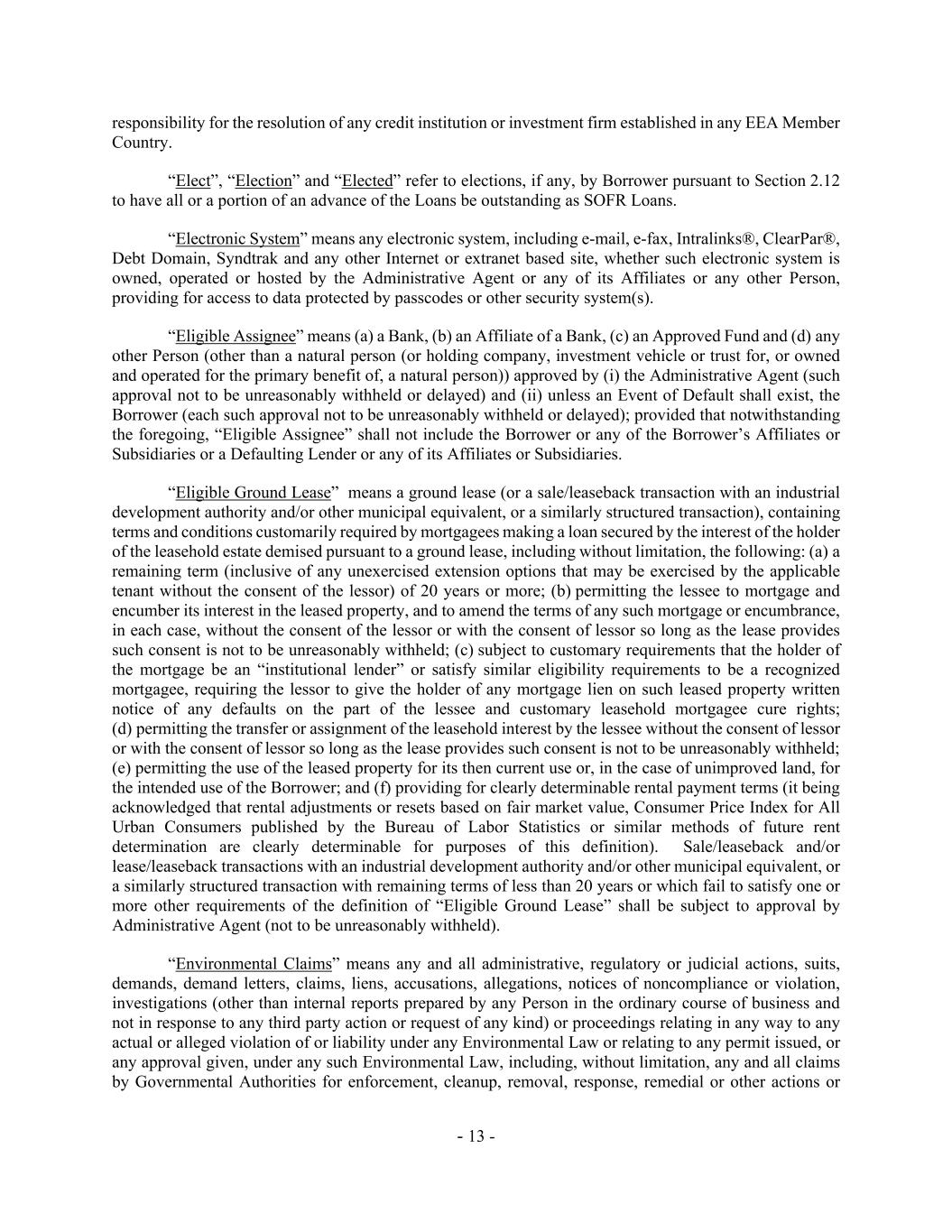 - 13 - responsibility for the resolution of any credit institution or investment firm established in any EEA Member Country. “Elect”, “Election” and “Elected” refer to elections, if any, by Borrower pursuant to Section 2.12 to have all or a portion of an advance of the Loans be outstanding as SOFR Loans. “Electronic System” means any electronic system, including e-mail, e-fax, Intralinks®, ClearPar®, Debt Domain, Syndtrak and any other Internet or extranet based site, whether such electronic system is owned, operated or hosted by the Administrative Agent or any of its Affiliates or any other Person, providing for access to data protected by passcodes or other security system(s). “Eligible Assignee” means (a) a Bank, (b) an Affiliate of a Bank, (c) an Approved Fund and (d) any other Person (other than a natural person (or holding company, investment vehicle or trust for, or owned and operated for the primary benefit of, a natural person)) approved by (i) the Administrative Agent (such approval not to be unreasonably withheld or delayed) and (ii) unless an Event of Default shall exist, the Borrower (each such approval not to be unreasonably withheld or delayed); provided that notwithstanding the foregoing, “Eligible Assignee” shall not include the Borrower or any of the Borrower’s Affiliates or Subsidiaries or a Defaulting Lender or any of its Affiliates or Subsidiaries. “Eligible Ground Lease” means a ground lease (or a sale/leaseback transaction with an industrial development authority and/or other municipal equivalent, or a similarly structured transaction), containing terms and conditions customarily required by mortgagees making a loan secured by the interest of the holder of the leasehold estate demised pursuant to a ground lease, including without limitation, the following: (a) a remaining term (inclusive of any unexercised extension options that may be exercised by the applicable tenant without the consent of the lessor) of 20 years or more; (b) permitting the lessee to mortgage and encumber its interest in the leased property, and to amend the terms of any such mortgage or encumbrance, in each case, without the consent of the lessor or with the consent of lessor so long as the lease provides such consent is not to be unreasonably withheld; (c) subject to customary requirements that the holder of the mortgage be an “institutional lender” or satisfy similar eligibility requirements to be a recognized mortgagee, requiring the lessor to give the holder of any mortgage lien on such leased property written notice of any defaults on the part of the lessee and customary leasehold mortgagee cure rights; (d) permitting the transfer or assignment of the leasehold interest by the lessee without the consent of lessor or with the consent of lessor so long as the lease provides such consent is not to be unreasonably withheld; (e) permitting the use of the leased property for its then current use or, in the case of unimproved land, for the intended use of the Borrower; and (f) providing for clearly determinable rental payment terms (it being acknowledged that rental adjustments or resets based on fair market value, Consumer Price Index for All Urban Consumers published by the Bureau of Labor Statistics or similar methods of future rent determination are clearly determinable for purposes of this definition). Sale/leaseback and/or lease/leaseback transactions with an industrial development authority and/or other municipal equivalent, or a similarly structured transaction with remaining terms of less than 20 years or which fail to satisfy one or more other requirements of the definition of “Eligible Ground Lease” shall be subject to approval by Administrative Agent (not to be unreasonably withheld). “Environmental Claims” means any and all administrative, regulatory or judicial actions, suits, demands, demand letters, claims, liens, accusations, allegations, notices of noncompliance or violation, investigations (other than internal reports prepared by any Person in the ordinary course of business and not in response to any third party action or request of any kind) or proceedings relating in any way to any actual or alleged violation of or liability under any Environmental Law or relating to any permit issued, or any approval given, under any such Environmental Law, including, without limitation, any and all claims by Governmental Authorities for enforcement, cleanup, removal, response, remedial or other actions or