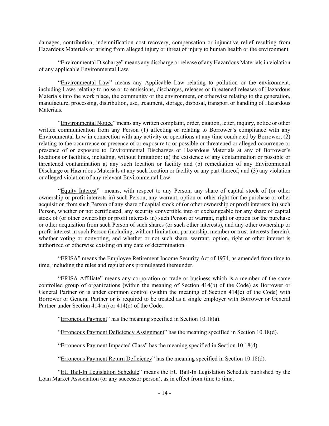 - 14 - damages, contribution, indemnification cost recovery, compensation or injunctive relief resulting from Hazardous Materials or arising from alleged injury or threat of injury to human health or the environment “Environmental Discharge” means any discharge or release of any Hazardous Materials in violation of any applicable Environmental Law. “Environmental Law” means any Applicable Law relating to pollution or the environment, including Laws relating to noise or to emissions, discharges, releases or threatened releases of Hazardous Materials into the work place, the community or the environment, or otherwise relating to the generation, manufacture, processing, distribution, use, treatment, storage, disposal, transport or handling of Hazardous Materials. “Environmental Notice” means any written complaint, order, citation, letter, inquiry, notice or other written communication from any Person (1) affecting or relating to Borrower’s compliance with any Environmental Law in connection with any activity or operations at any time conducted by Borrower, (2) relating to the occurrence or presence of or exposure to or possible or threatened or alleged occurrence or presence of or exposure to Environmental Discharges or Hazardous Materials at any of Borrower’s locations or facilities, including, without limitation: (a) the existence of any contamination or possible or threatened contamination at any such location or facility and (b) remediation of any Environmental Discharge or Hazardous Materials at any such location or facility or any part thereof; and (3) any violation or alleged violation of any relevant Environmental Law. “Equity Interest” means, with respect to any Person, any share of capital stock of (or other ownership or profit interests in) such Person, any warrant, option or other right for the purchase or other acquisition from such Person of any share of capital stock of (or other ownership or profit interests in) such Person, whether or not certificated, any security convertible into or exchangeable for any share of capital stock of (or other ownership or profit interests in) such Person or warrant, right or option for the purchase or other acquisition from such Person of such shares (or such other interests), and any other ownership or profit interest in such Person (including, without limitation, partnership, member or trust interests therein), whether voting or nonvoting, and whether or not such share, warrant, option, right or other interest is authorized or otherwise existing on any date of determination. “ERISA” means the Employee Retirement Income Security Act of 1974, as amended from time to time, including the rules and regulations promulgated thereunder. “ERISA Affiliate” means any corporation or trade or business which is a member of the same controlled group of organizations (within the meaning of Section 414(b) of the Code) as Borrower or General Partner or is under common control (within the meaning of Section 414(c) of the Code) with Borrower or General Partner or is required to be treated as a single employer with Borrower or General Partner under Section 414(m) or 414(o) of the Code. “Erroneous Payment” has the meaning specified in Section 10.18(a). “Erroneous Payment Deficiency Assignment” has the meaning specified in Section 10.18(d). “Erroneous Payment Impacted Class” has the meaning specified in Section 10.18(d). “Erroneous Payment Return Deficiency” has the meaning specified in Section 10.18(d). “EU Bail-In Legislation Schedule” means the EU Bail-In Legislation Schedule published by the Loan Market Association (or any successor person), as in effect from time to time.