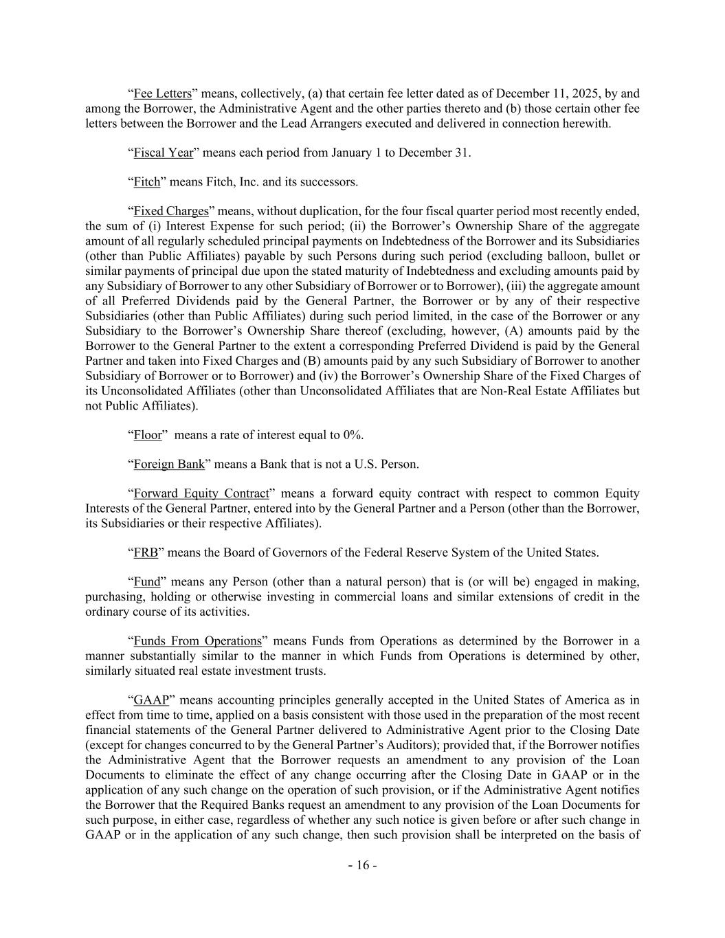 - 16 - “Fee Letters” means, collectively, (a) that certain fee letter dated as of December 11, 2025, by and among the Borrower, the Administrative Agent and the other parties thereto and (b) those certain other fee letters between the Borrower and the Lead Arrangers executed and delivered in connection herewith. “Fiscal Year” means each period from January 1 to December 31. “Fitch” means Fitch, Inc. and its successors. “Fixed Charges” means, without duplication, for the four fiscal quarter period most recently ended, the sum of (i) Interest Expense for such period; (ii) the Borrower’s Ownership Share of the aggregate amount of all regularly scheduled principal payments on Indebtedness of the Borrower and its Subsidiaries (other than Public Affiliates) payable by such Persons during such period (excluding balloon, bullet or similar payments of principal due upon the stated maturity of Indebtedness and excluding amounts paid by any Subsidiary of Borrower to any other Subsidiary of Borrower or to Borrower), (iii) the aggregate amount of all Preferred Dividends paid by the General Partner, the Borrower or by any of their respective Subsidiaries (other than Public Affiliates) during such period limited, in the case of the Borrower or any Subsidiary to the Borrower’s Ownership Share thereof (excluding, however, (A) amounts paid by the Borrower to the General Partner to the extent a corresponding Preferred Dividend is paid by the General Partner and taken into Fixed Charges and (B) amounts paid by any such Subsidiary of Borrower to another Subsidiary of Borrower or to Borrower) and (iv) the Borrower’s Ownership Share of the Fixed Charges of its Unconsolidated Affiliates (other than Unconsolidated Affiliates that are Non-Real Estate Affiliates but not Public Affiliates). “Floor” means a rate of interest equal to 0%. “Foreign Bank” means a Bank that is not a U.S. Person. “Forward Equity Contract” means a forward equity contract with respect to common Equity Interests of the General Partner, entered into by the General Partner and a Person (other than the Borrower, its Subsidiaries or their respective Affiliates). “FRB” means the Board of Governors of the Federal Reserve System of the United States. “Fund” means any Person (other than a natural person) that is (or will be) engaged in making, purchasing, holding or otherwise investing in commercial loans and similar extensions of credit in the ordinary course of its activities. “Funds From Operations” means Funds from Operations as determined by the Borrower in a manner substantially similar to the manner in which Funds from Operations is determined by other, similarly situated real estate investment trusts. “GAAP” means accounting principles generally accepted in the United States of America as in effect from time to time, applied on a basis consistent with those used in the preparation of the most recent financial statements of the General Partner delivered to Administrative Agent prior to the Closing Date (except for changes concurred to by the General Partner’s Auditors); provided that, if the Borrower notifies the Administrative Agent that the Borrower requests an amendment to any provision of the Loan Documents to eliminate the effect of any change occurring after the Closing Date in GAAP or in the application of any such change on the operation of such provision, or if the Administrative Agent notifies the Borrower that the Required Banks request an amendment to any provision of the Loan Documents for such purpose, in either case, regardless of whether any such notice is given before or after such change in GAAP or in the application of any such change, then such provision shall be interpreted on the basis of