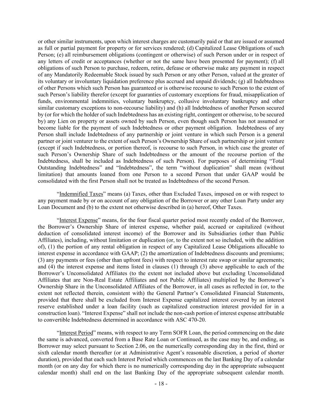 - 18 - or other similar instruments, upon which interest charges are customarily paid or that are issued or assumed as full or partial payment for property or for services rendered; (d) Capitalized Lease Obligations of such Person; (e) all reimbursement obligations (contingent or otherwise) of such Person under or in respect of any letters of credit or acceptances (whether or not the same have been presented for payment); (f) all obligations of such Person to purchase, redeem, retire, defease or otherwise make any payment in respect of any Mandatorily Redeemable Stock issued by such Person or any other Person, valued at the greater of its voluntary or involuntary liquidation preference plus accrued and unpaid dividends; (g) all Indebtedness of other Persons which such Person has guaranteed or is otherwise recourse to such Person to the extent of such Person’s liability therefor (except for guaranties of customary exceptions for fraud, misapplication of funds, environmental indemnities, voluntary bankruptcy, collusive involuntary bankruptcy and other similar customary exceptions to non-recourse liability) and (h) all Indebtedness of another Person secured by (or for which the holder of such Indebtedness has an existing right, contingent or otherwise, to be secured by) any Lien on property or assets owned by such Person, even though such Person has not assumed or become liable for the payment of such Indebtedness or other payment obligation. Indebtedness of any Person shall include Indebtedness of any partnership or joint venture in which such Person is a general partner or joint venturer to the extent of such Person’s Ownership Share of such partnership or joint venture (except if such Indebtedness, or portion thereof, is recourse to such Person, in which case the greater of such Person’s Ownership Share of such Indebtedness or the amount of the recourse portion of the Indebtedness, shall be included as Indebtedness of such Person). For purposes of determining “Total Outstanding Indebtedness” and “Indebtedness”, the term “without duplication” shall mean (without limitation) that amounts loaned from one Person to a second Person that under GAAP would be consolidated with the first Person shall not be treated as Indebtedness of the second Person. “Indemnified Taxes” means (a) Taxes, other than Excluded Taxes, imposed on or with respect to any payment made by or on account of any obligation of the Borrower or any other Loan Party under any Loan Document and (b) to the extent not otherwise described in (a) hereof, Other Taxes. “Interest Expense” means, for the four fiscal quarter period most recently ended of the Borrower, the Borrower’s Ownership Share of interest expense, whether paid, accrued or capitalized (without deduction of consolidated interest income) of the Borrower and its Subsidiaries (other than Public Affiliates), including, without limitation or duplication (or, to the extent not so included, with the addition of), (1) the portion of any rental obligation in respect of any Capitalized Lease Obligations allocable to interest expense in accordance with GAAP; (2) the amortization of Indebtedness discounts and premiums; (3) any payments or fees (other than upfront fees) with respect to interest rate swap or similar agreements; and (4) the interest expense and items listed in clauses (1) through (3) above applicable to each of the Borrower’s Unconsolidated Affiliates (to the extent not included above but excluding Unconsolidated Affiliates that are Non-Real Estate Affiliates and not Public Affiliates) multiplied by the Borrower’s Ownership Share in the Unconsolidated Affiliates of the Borrower, in all cases as reflected in (or, to the extent not reflected therein, consistent with) the General Partner’s Consolidated Financial Statements, provided that there shall be excluded from Interest Expense capitalized interest covered by an interest reserve established under a loan facility (such as capitalized construction interest provided for in a construction loan). “Interest Expense” shall not include the non-cash portion of interest expense attributable to convertible Indebtedness determined in accordance with ASC 470-20. “Interest Period” means, with respect to any Term SOFR Loan, the period commencing on the date the same is advanced, converted from a Base Rate Loan or Continued, as the case may be, and ending, as Borrower may select pursuant to Section 2.06, on the numerically corresponding day in the first, third or sixth calendar month thereafter (or at Administrative Agent’s reasonable discretion, a period of shorter duration), provided that each such Interest Period which commences on the last Banking Day of a calendar month (or on any day for which there is no numerically corresponding day in the appropriate subsequent calendar month) shall end on the last Banking Day of the appropriate subsequent calendar month.