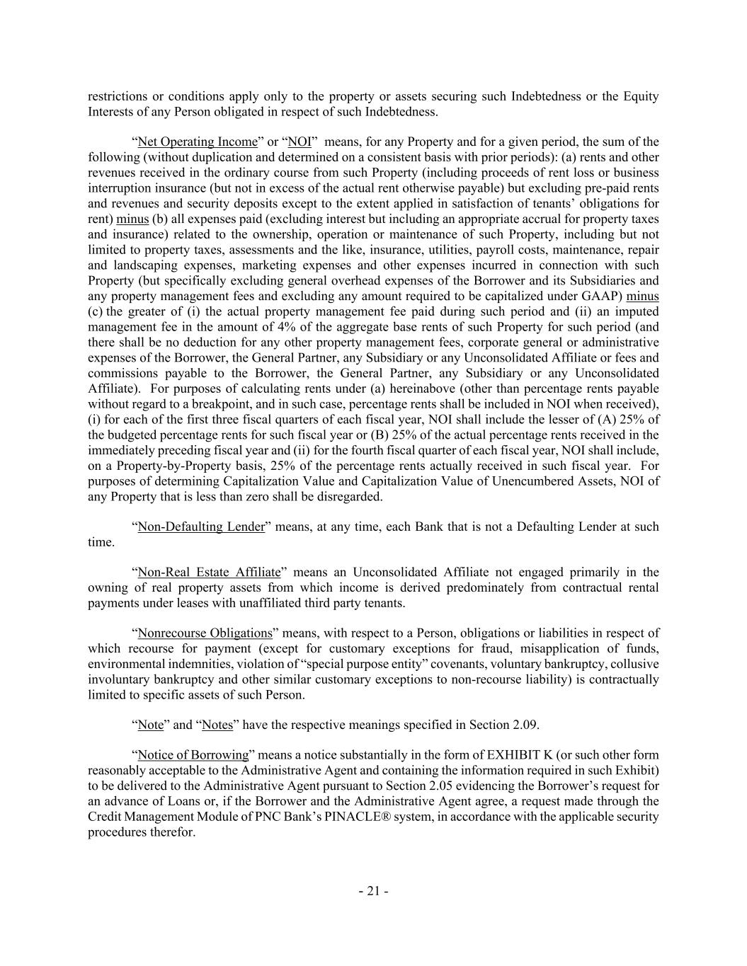 - 21 - restrictions or conditions apply only to the property or assets securing such Indebtedness or the Equity Interests of any Person obligated in respect of such Indebtedness. “Net Operating Income” or “NOI” means, for any Property and for a given period, the sum of the following (without duplication and determined on a consistent basis with prior periods): (a) rents and other revenues received in the ordinary course from such Property (including proceeds of rent loss or business interruption insurance (but not in excess of the actual rent otherwise payable) but excluding pre-paid rents and revenues and security deposits except to the extent applied in satisfaction of tenants’ obligations for rent) minus (b) all expenses paid (excluding interest but including an appropriate accrual for property taxes and insurance) related to the ownership, operation or maintenance of such Property, including but not limited to property taxes, assessments and the like, insurance, utilities, payroll costs, maintenance, repair and landscaping expenses, marketing expenses and other expenses incurred in connection with such Property (but specifically excluding general overhead expenses of the Borrower and its Subsidiaries and any property management fees and excluding any amount required to be capitalized under GAAP) minus (c) the greater of (i) the actual property management fee paid during such period and (ii) an imputed management fee in the amount of 4% of the aggregate base rents of such Property for such period (and there shall be no deduction for any other property management fees, corporate general or administrative expenses of the Borrower, the General Partner, any Subsidiary or any Unconsolidated Affiliate or fees and commissions payable to the Borrower, the General Partner, any Subsidiary or any Unconsolidated Affiliate). For purposes of calculating rents under (a) hereinabove (other than percentage rents payable without regard to a breakpoint, and in such case, percentage rents shall be included in NOI when received), (i) for each of the first three fiscal quarters of each fiscal year, NOI shall include the lesser of (A) 25% of the budgeted percentage rents for such fiscal year or (B) 25% of the actual percentage rents received in the immediately preceding fiscal year and (ii) for the fourth fiscal quarter of each fiscal year, NOI shall include, on a Property-by-Property basis, 25% of the percentage rents actually received in such fiscal year. For purposes of determining Capitalization Value and Capitalization Value of Unencumbered Assets, NOI of any Property that is less than zero shall be disregarded. “Non-Defaulting Lender” means, at any time, each Bank that is not a Defaulting Lender at such time. “Non-Real Estate Affiliate” means an Unconsolidated Affiliate not engaged primarily in the owning of real property assets from which income is derived predominately from contractual rental payments under leases with unaffiliated third party tenants. “Nonrecourse Obligations” means, with respect to a Person, obligations or liabilities in respect of which recourse for payment (except for customary exceptions for fraud, misapplication of funds, environmental indemnities, violation of “special purpose entity” covenants, voluntary bankruptcy, collusive involuntary bankruptcy and other similar customary exceptions to non-recourse liability) is contractually limited to specific assets of such Person. “Note” and “Notes” have the respective meanings specified in Section 2.09. “Notice of Borrowing” means a notice substantially in the form of EXHIBIT K (or such other form reasonably acceptable to the Administrative Agent and containing the information required in such Exhibit) to be delivered to the Administrative Agent pursuant to Section 2.05 evidencing the Borrower’s request for an advance of Loans or, if the Borrower and the Administrative Agent agree, a request made through the Credit Management Module of PNC Bank’s PINACLE® system, in accordance with the applicable security procedures therefor.