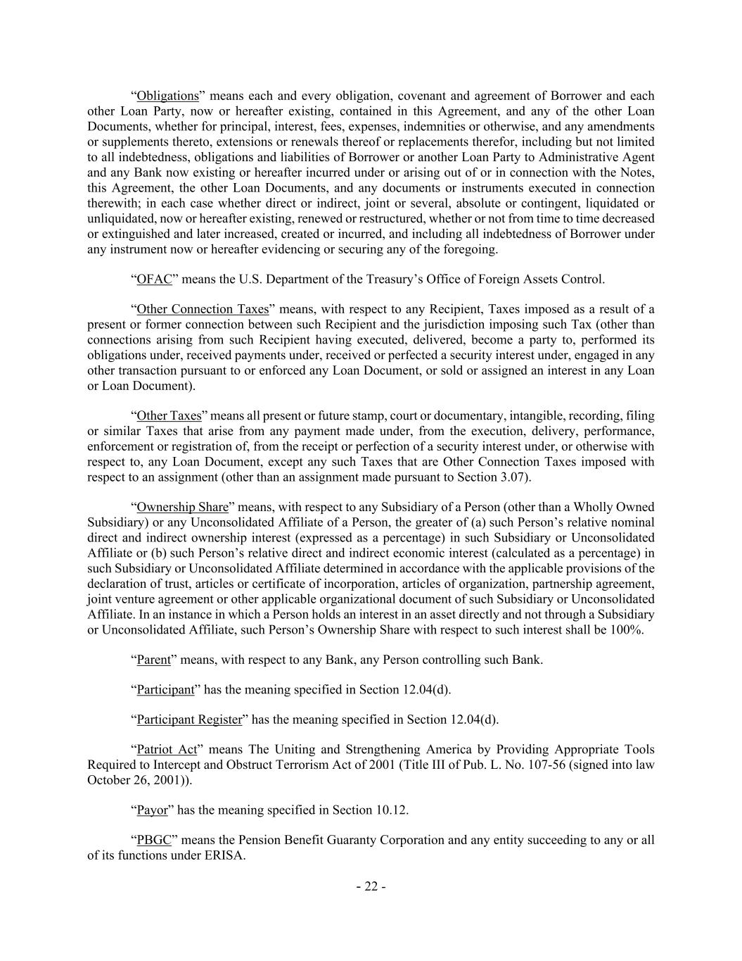 - 22 - “Obligations” means each and every obligation, covenant and agreement of Borrower and each other Loan Party, now or hereafter existing, contained in this Agreement, and any of the other Loan Documents, whether for principal, interest, fees, expenses, indemnities or otherwise, and any amendments or supplements thereto, extensions or renewals thereof or replacements therefor, including but not limited to all indebtedness, obligations and liabilities of Borrower or another Loan Party to Administrative Agent and any Bank now existing or hereafter incurred under or arising out of or in connection with the Notes, this Agreement, the other Loan Documents, and any documents or instruments executed in connection therewith; in each case whether direct or indirect, joint or several, absolute or contingent, liquidated or unliquidated, now or hereafter existing, renewed or restructured, whether or not from time to time decreased or extinguished and later increased, created or incurred, and including all indebtedness of Borrower under any instrument now or hereafter evidencing or securing any of the foregoing. “OFAC” means the U.S. Department of the Treasury’s Office of Foreign Assets Control. “Other Connection Taxes” means, with respect to any Recipient, Taxes imposed as a result of a present or former connection between such Recipient and the jurisdiction imposing such Tax (other than connections arising from such Recipient having executed, delivered, become a party to, performed its obligations under, received payments under, received or perfected a security interest under, engaged in any other transaction pursuant to or enforced any Loan Document, or sold or assigned an interest in any Loan or Loan Document). “Other Taxes” means all present or future stamp, court or documentary, intangible, recording, filing or similar Taxes that arise from any payment made under, from the execution, delivery, performance, enforcement or registration of, from the receipt or perfection of a security interest under, or otherwise with respect to, any Loan Document, except any such Taxes that are Other Connection Taxes imposed with respect to an assignment (other than an assignment made pursuant to Section 3.07). “Ownership Share” means, with respect to any Subsidiary of a Person (other than a Wholly Owned Subsidiary) or any Unconsolidated Affiliate of a Person, the greater of (a) such Person’s relative nominal direct and indirect ownership interest (expressed as a percentage) in such Subsidiary or Unconsolidated Affiliate or (b) such Person’s relative direct and indirect economic interest (calculated as a percentage) in such Subsidiary or Unconsolidated Affiliate determined in accordance with the applicable provisions of the declaration of trust, articles or certificate of incorporation, articles of organization, partnership agreement, joint venture agreement or other applicable organizational document of such Subsidiary or Unconsolidated Affiliate. In an instance in which a Person holds an interest in an asset directly and not through a Subsidiary or Unconsolidated Affiliate, such Person’s Ownership Share with respect to such interest shall be 100%. “Parent” means, with respect to any Bank, any Person controlling such Bank. “Participant” has the meaning specified in Section 12.04(d). “Participant Register” has the meaning specified in Section 12.04(d). “Patriot Act” means The Uniting and Strengthening America by Providing Appropriate Tools Required to Intercept and Obstruct Terrorism Act of 2001 (Title III of Pub. L. No. 107-56 (signed into law October 26, 2001)). “Payor” has the meaning specified in Section 10.12. “PBGC” means the Pension Benefit Guaranty Corporation and any entity succeeding to any or all of its functions under ERISA.