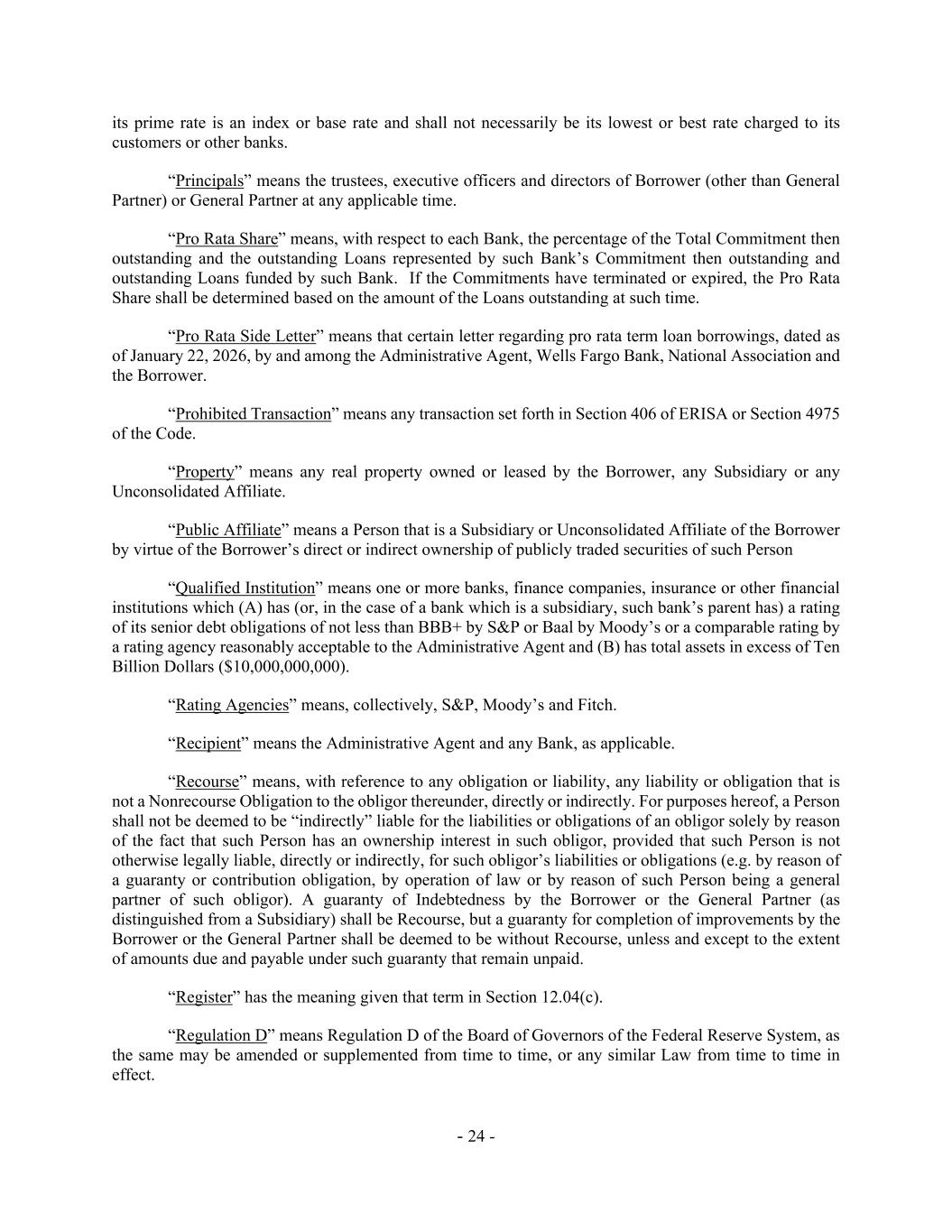 - 24 - its prime rate is an index or base rate and shall not necessarily be its lowest or best rate charged to its customers or other banks. “Principals” means the trustees, executive officers and directors of Borrower (other than General Partner) or General Partner at any applicable time. “Pro Rata Share” means, with respect to each Bank, the percentage of the Total Commitment then outstanding and the outstanding Loans represented by such Bank’s Commitment then outstanding and outstanding Loans funded by such Bank. If the Commitments have terminated or expired, the Pro Rata Share shall be determined based on the amount of the Loans outstanding at such time. “Pro Rata Side Letter” means that certain letter regarding pro rata term loan borrowings, dated as of January 22, 2026, by and among the Administrative Agent, Wells Fargo Bank, National Association and the Borrower. “Prohibited Transaction” means any transaction set forth in Section 406 of ERISA or Section 4975 of the Code. “Property” means any real property owned or leased by the Borrower, any Subsidiary or any Unconsolidated Affiliate. “Public Affiliate” means a Person that is a Subsidiary or Unconsolidated Affiliate of the Borrower by virtue of the Borrower’s direct or indirect ownership of publicly traded securities of such Person “Qualified Institution” means one or more banks, finance companies, insurance or other financial institutions which (A) has (or, in the case of a bank which is a subsidiary, such bank’s parent has) a rating of its senior debt obligations of not less than BBB+ by S&P or Baal by Moody’s or a comparable rating by a rating agency reasonably acceptable to the Administrative Agent and (B) has total assets in excess of Ten Billion Dollars ($10,000,000,000). “Rating Agencies” means, collectively, S&P, Moody’s and Fitch. “Recipient” means the Administrative Agent and any Bank, as applicable. “Recourse” means, with reference to any obligation or liability, any liability or obligation that is not a Nonrecourse Obligation to the obligor thereunder, directly or indirectly. For purposes hereof, a Person shall not be deemed to be “indirectly” liable for the liabilities or obligations of an obligor solely by reason of the fact that such Person has an ownership interest in such obligor, provided that such Person is not otherwise legally liable, directly or indirectly, for such obligor’s liabilities or obligations (e.g. by reason of a guaranty or contribution obligation, by operation of law or by reason of such Person being a general partner of such obligor). A guaranty of Indebtedness by the Borrower or the General Partner (as distinguished from a Subsidiary) shall be Recourse, but a guaranty for completion of improvements by the Borrower or the General Partner shall be deemed to be without Recourse, unless and except to the extent of amounts due and payable under such guaranty that remain unpaid. “Register” has the meaning given that term in Section 12.04(c). “Regulation D” means Regulation D of the Board of Governors of the Federal Reserve System, as the same may be amended or supplemented from time to time, or any similar Law from time to time in effect.