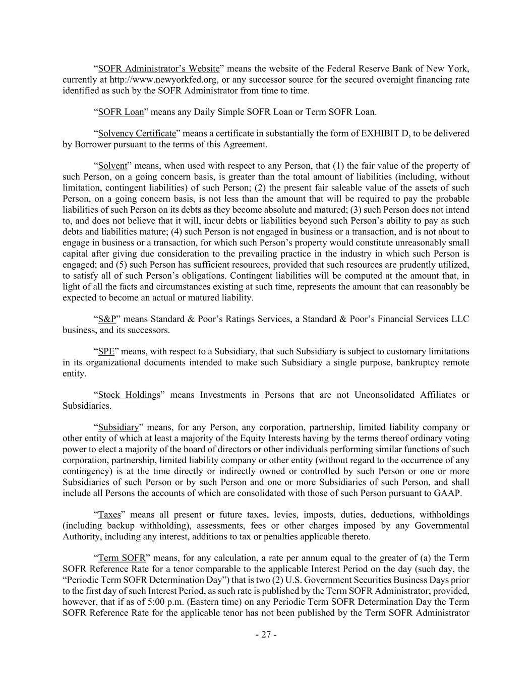 - 27 - “SOFR Administrator’s Website” means the website of the Federal Reserve Bank of New York, currently at http://www.newyorkfed.org, or any successor source for the secured overnight financing rate identified as such by the SOFR Administrator from time to time. “SOFR Loan” means any Daily Simple SOFR Loan or Term SOFR Loan. “Solvency Certificate” means a certificate in substantially the form of EXHIBIT D, to be delivered by Borrower pursuant to the terms of this Agreement. “Solvent” means, when used with respect to any Person, that (1) the fair value of the property of such Person, on a going concern basis, is greater than the total amount of liabilities (including, without limitation, contingent liabilities) of such Person; (2) the present fair saleable value of the assets of such Person, on a going concern basis, is not less than the amount that will be required to pay the probable liabilities of such Person on its debts as they become absolute and matured; (3) such Person does not intend to, and does not believe that it will, incur debts or liabilities beyond such Person’s ability to pay as such debts and liabilities mature; (4) such Person is not engaged in business or a transaction, and is not about to engage in business or a transaction, for which such Person’s property would constitute unreasonably small capital after giving due consideration to the prevailing practice in the industry in which such Person is engaged; and (5) such Person has sufficient resources, provided that such resources are prudently utilized, to satisfy all of such Person’s obligations. Contingent liabilities will be computed at the amount that, in light of all the facts and circumstances existing at such time, represents the amount that can reasonably be expected to become an actual or matured liability. “S&P” means Standard & Poor’s Ratings Services, a Standard & Poor’s Financial Services LLC business, and its successors. “SPE” means, with respect to a Subsidiary, that such Subsidiary is subject to customary limitations in its organizational documents intended to make such Subsidiary a single purpose, bankruptcy remote entity. “Stock Holdings” means Investments in Persons that are not Unconsolidated Affiliates or Subsidiaries. “Subsidiary” means, for any Person, any corporation, partnership, limited liability company or other entity of which at least a majority of the Equity Interests having by the terms thereof ordinary voting power to elect a majority of the board of directors or other individuals performing similar functions of such corporation, partnership, limited liability company or other entity (without regard to the occurrence of any contingency) is at the time directly or indirectly owned or controlled by such Person or one or more Subsidiaries of such Person or by such Person and one or more Subsidiaries of such Person, and shall include all Persons the accounts of which are consolidated with those of such Person pursuant to GAAP. “Taxes” means all present or future taxes, levies, imposts, duties, deductions, withholdings (including backup withholding), assessments, fees or other charges imposed by any Governmental Authority, including any interest, additions to tax or penalties applicable thereto. “Term SOFR” means, for any calculation, a rate per annum equal to the greater of (a) the Term SOFR Reference Rate for a tenor comparable to the applicable Interest Period on the day (such day, the “Periodic Term SOFR Determination Day”) that is two (2) U.S. Government Securities Business Days prior to the first day of such Interest Period, as such rate is published by the Term SOFR Administrator; provided, however, that if as of 5:00 p.m. (Eastern time) on any Periodic Term SOFR Determination Day the Term SOFR Reference Rate for the applicable tenor has not been published by the Term SOFR Administrator