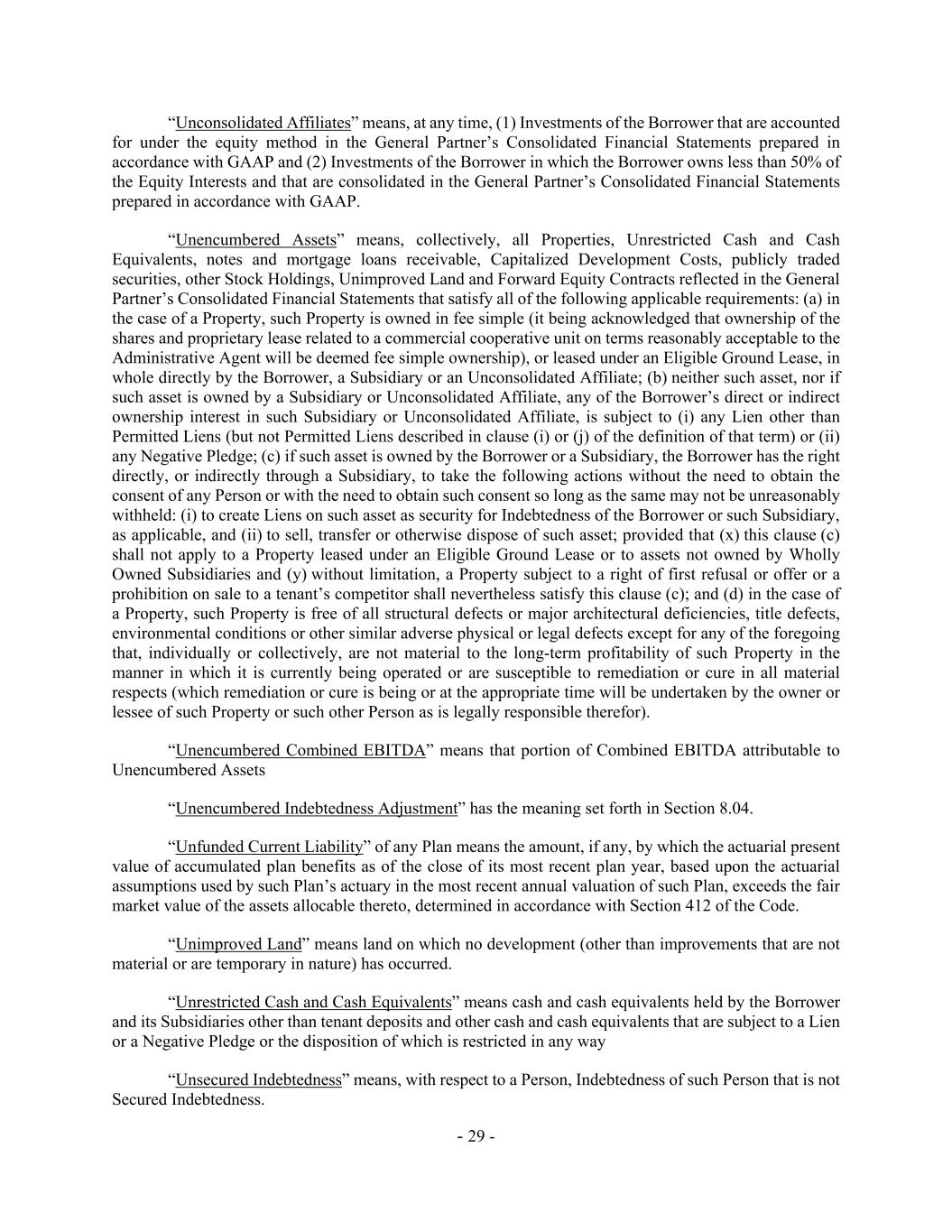 - 29 - “Unconsolidated Affiliates” means, at any time, (1) Investments of the Borrower that are accounted for under the equity method in the General Partner’s Consolidated Financial Statements prepared in accordance with GAAP and (2) Investments of the Borrower in which the Borrower owns less than 50% of the Equity Interests and that are consolidated in the General Partner’s Consolidated Financial Statements prepared in accordance with GAAP. “Unencumbered Assets” means, collectively, all Properties, Unrestricted Cash and Cash Equivalents, notes and mortgage loans receivable, Capitalized Development Costs, publicly traded securities, other Stock Holdings, Unimproved Land and Forward Equity Contracts reflected in the General Partner’s Consolidated Financial Statements that satisfy all of the following applicable requirements: (a) in the case of a Property, such Property is owned in fee simple (it being acknowledged that ownership of the shares and proprietary lease related to a commercial cooperative unit on terms reasonably acceptable to the Administrative Agent will be deemed fee simple ownership), or leased under an Eligible Ground Lease, in whole directly by the Borrower, a Subsidiary or an Unconsolidated Affiliate; (b) neither such asset, nor if such asset is owned by a Subsidiary or Unconsolidated Affiliate, any of the Borrower’s direct or indirect ownership interest in such Subsidiary or Unconsolidated Affiliate, is subject to (i) any Lien other than Permitted Liens (but not Permitted Liens described in clause (i) or (j) of the definition of that term) or (ii) any Negative Pledge; (c) if such asset is owned by the Borrower or a Subsidiary, the Borrower has the right directly, or indirectly through a Subsidiary, to take the following actions without the need to obtain the consent of any Person or with the need to obtain such consent so long as the same may not be unreasonably withheld: (i) to create Liens on such asset as security for Indebtedness of the Borrower or such Subsidiary, as applicable, and (ii) to sell, transfer or otherwise dispose of such asset; provided that (x) this clause (c) shall not apply to a Property leased under an Eligible Ground Lease or to assets not owned by Wholly Owned Subsidiaries and (y) without limitation, a Property subject to a right of first refusal or offer or a prohibition on sale to a tenant’s competitor shall nevertheless satisfy this clause (c); and (d) in the case of a Property, such Property is free of all structural defects or major architectural deficiencies, title defects, environmental conditions or other similar adverse physical or legal defects except for any of the foregoing that, individually or collectively, are not material to the long-term profitability of such Property in the manner in which it is currently being operated or are susceptible to remediation or cure in all material respects (which remediation or cure is being or at the appropriate time will be undertaken by the owner or lessee of such Property or such other Person as is legally responsible therefor). “Unencumbered Combined EBITDA” means that portion of Combined EBITDA attributable to Unencumbered Assets “Unencumbered Indebtedness Adjustment” has the meaning set forth in Section 8.04. “Unfunded Current Liability” of any Plan means the amount, if any, by which the actuarial present value of accumulated plan benefits as of the close of its most recent plan year, based upon the actuarial assumptions used by such Plan’s actuary in the most recent annual valuation of such Plan, exceeds the fair market value of the assets allocable thereto, determined in accordance with Section 412 of the Code. “Unimproved Land” means land on which no development (other than improvements that are not material or are temporary in nature) has occurred. “Unrestricted Cash and Cash Equivalents” means cash and cash equivalents held by the Borrower and its Subsidiaries other than tenant deposits and other cash and cash equivalents that are subject to a Lien or a Negative Pledge or the disposition of which is restricted in any way “Unsecured Indebtedness” means, with respect to a Person, Indebtedness of such Person that is not Secured Indebtedness.