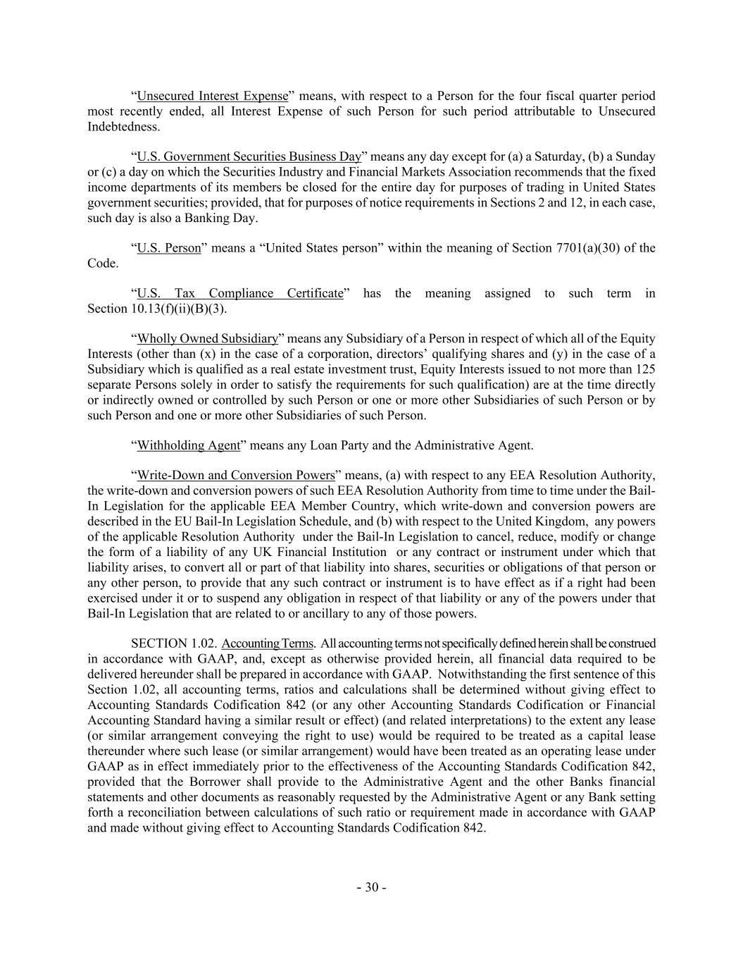 - 30 - “Unsecured Interest Expense” means, with respect to a Person for the four fiscal quarter period most recently ended, all Interest Expense of such Person for such period attributable to Unsecured Indebtedness. “U.S. Government Securities Business Day” means any day except for (a) a Saturday, (b) a Sunday or (c) a day on which the Securities Industry and Financial Markets Association recommends that the fixed income departments of its members be closed for the entire day for purposes of trading in United States government securities; provided, that for purposes of notice requirements in Sections 2 and 12, in each case, such day is also a Banking Day. “U.S. Person” means a “United States person” within the meaning of Section 7701(a)(30) of the Code. “U.S. Tax Compliance Certificate” has the meaning assigned to such term in Section 10.13(f)(ii)(B)(3). “Wholly Owned Subsidiary” means any Subsidiary of a Person in respect of which all of the Equity Interests (other than (x) in the case of a corporation, directors’ qualifying shares and (y) in the case of a Subsidiary which is qualified as a real estate investment trust, Equity Interests issued to not more than 125 separate Persons solely in order to satisfy the requirements for such qualification) are at the time directly or indirectly owned or controlled by such Person or one or more other Subsidiaries of such Person or by such Person and one or more other Subsidiaries of such Person. “Withholding Agent” means any Loan Party and the Administrative Agent. “Write-Down and Conversion Powers” means, (a) with respect to any EEA Resolution Authority, the write-down and conversion powers of such EEA Resolution Authority from time to time under the Bail- In Legislation for the applicable EEA Member Country, which write-down and conversion powers are described in the EU Bail-In Legislation Schedule, and (b) with respect to the United Kingdom, any powers of the applicable Resolution Authority under the Bail-In Legislation to cancel, reduce, modify or change the form of a liability of any UK Financial Institution or any contract or instrument under which that liability arises, to convert all or part of that liability into shares, securities or obligations of that person or any other person, to provide that any such contract or instrument is to have effect as if a right had been exercised under it or to suspend any obligation in respect of that liability or any of the powers under that Bail-In Legislation that are related to or ancillary to any of those powers. SECTION 1.02. Accounting Terms. All accounting terms not specifically defined herein shall be construed in accordance with GAAP, and, except as otherwise provided herein, all financial data required to be delivered hereunder shall be prepared in accordance with GAAP. Notwithstanding the first sentence of this Section 1.02, all accounting terms, ratios and calculations shall be determined without giving effect to Accounting Standards Codification 842 (or any other Accounting Standards Codification or Financial Accounting Standard having a similar result or effect) (and related interpretations) to the extent any lease (or similar arrangement conveying the right to use) would be required to be treated as a capital lease thereunder where such lease (or similar arrangement) would have been treated as an operating lease under GAAP as in effect immediately prior to the effectiveness of the Accounting Standards Codification 842, provided that the Borrower shall provide to the Administrative Agent and the other Banks financial statements and other documents as reasonably requested by the Administrative Agent or any Bank setting forth a reconciliation between calculations of such ratio or requirement made in accordance with GAAP and made without giving effect to Accounting Standards Codification 842.