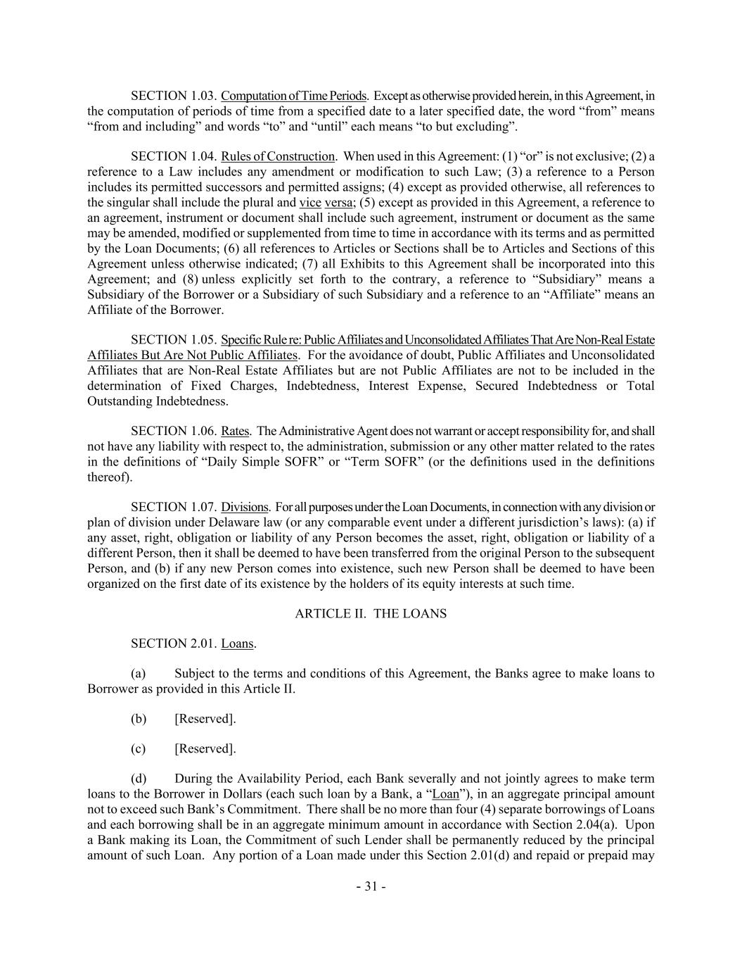 - 31 - SECTION 1.03. Computation of Time Periods. Except as otherwise provided herein, in this Agreement, in the computation of periods of time from a specified date to a later specified date, the word “from” means “from and including” and words “to” and “until” each means “to but excluding”. SECTION 1.04. Rules of Construction. When used in this Agreement: (1) “or” is not exclusive; (2) a reference to a Law includes any amendment or modification to such Law; (3) a reference to a Person includes its permitted successors and permitted assigns; (4) except as provided otherwise, all references to the singular shall include the plural and vice versa; (5) except as provided in this Agreement, a reference to an agreement, instrument or document shall include such agreement, instrument or document as the same may be amended, modified or supplemented from time to time in accordance with its terms and as permitted by the Loan Documents; (6) all references to Articles or Sections shall be to Articles and Sections of this Agreement unless otherwise indicated; (7) all Exhibits to this Agreement shall be incorporated into this Agreement; and (8) unless explicitly set forth to the contrary, a reference to “Subsidiary” means a Subsidiary of the Borrower or a Subsidiary of such Subsidiary and a reference to an “Affiliate” means an Affiliate of the Borrower. SECTION 1.05. Specific Rule re: Public Affiliates and Unconsolidated Affiliates That Are Non-Real Estate Affiliates But Are Not Public Affiliates. For the avoidance of doubt, Public Affiliates and Unconsolidated Affiliates that are Non-Real Estate Affiliates but are not Public Affiliates are not to be included in the determination of Fixed Charges, Indebtedness, Interest Expense, Secured Indebtedness or Total Outstanding Indebtedness. SECTION 1.06. Rates. The Administrative Agent does not warrant or accept responsibility for, and shall not have any liability with respect to, the administration, submission or any other matter related to the rates in the definitions of “Daily Simple SOFR” or “Term SOFR” (or the definitions used in the definitions thereof). SECTION 1.07. Divisions. For all purposes under the Loan Documents, in connection with any division or plan of division under Delaware law (or any comparable event under a different jurisdiction’s laws): (a) if any asset, right, obligation or liability of any Person becomes the asset, right, obligation or liability of a different Person, then it shall be deemed to have been transferred from the original Person to the subsequent Person, and (b) if any new Person comes into existence, such new Person shall be deemed to have been organized on the first date of its existence by the holders of its equity interests at such time. ARTICLE II. THE LOANS SECTION 2.01. Loans. (a) Subject to the terms and conditions of this Agreement, the Banks agree to make loans to Borrower as provided in this Article II. (b) [Reserved]. (c) [Reserved]. (d) During the Availability Period, each Bank severally and not jointly agrees to make term loans to the Borrower in Dollars (each such loan by a Bank, a “Loan”), in an aggregate principal amount not to exceed such Bank’s Commitment. There shall be no more than four (4) separate borrowings of Loans and each borrowing shall be in an aggregate minimum amount in accordance with Section 2.04(a). Upon a Bank making its Loan, the Commitment of such Lender shall be permanently reduced by the principal amount of such Loan. Any portion of a Loan made under this Section 2.01(d) and repaid or prepaid may