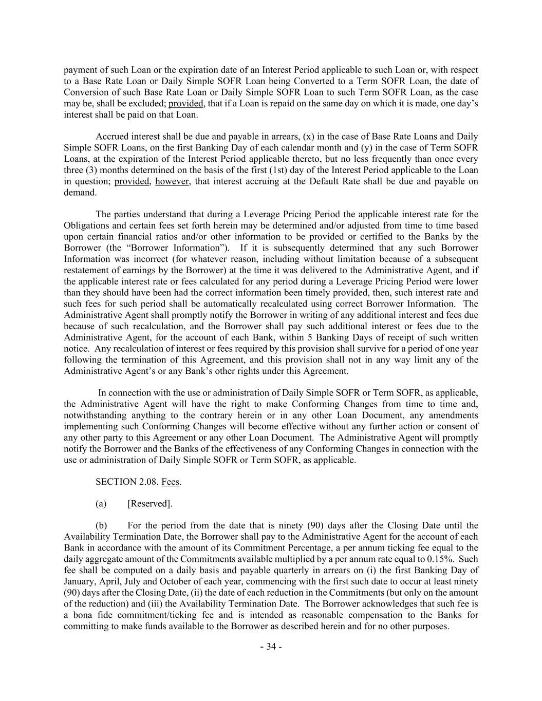 - 34 - payment of such Loan or the expiration date of an Interest Period applicable to such Loan or, with respect to a Base Rate Loan or Daily Simple SOFR Loan being Converted to a Term SOFR Loan, the date of Conversion of such Base Rate Loan or Daily Simple SOFR Loan to such Term SOFR Loan, as the case may be, shall be excluded; provided, that if a Loan is repaid on the same day on which it is made, one day’s interest shall be paid on that Loan. Accrued interest shall be due and payable in arrears, (x) in the case of Base Rate Loans and Daily Simple SOFR Loans, on the first Banking Day of each calendar month and (y) in the case of Term SOFR Loans, at the expiration of the Interest Period applicable thereto, but no less frequently than once every three (3) months determined on the basis of the first (1st) day of the Interest Period applicable to the Loan in question; provided, however, that interest accruing at the Default Rate shall be due and payable on demand. The parties understand that during a Leverage Pricing Period the applicable interest rate for the Obligations and certain fees set forth herein may be determined and/or adjusted from time to time based upon certain financial ratios and/or other information to be provided or certified to the Banks by the Borrower (the “Borrower Information”). If it is subsequently determined that any such Borrower Information was incorrect (for whatever reason, including without limitation because of a subsequent restatement of earnings by the Borrower) at the time it was delivered to the Administrative Agent, and if the applicable interest rate or fees calculated for any period during a Leverage Pricing Period were lower than they should have been had the correct information been timely provided, then, such interest rate and such fees for such period shall be automatically recalculated using correct Borrower Information. The Administrative Agent shall promptly notify the Borrower in writing of any additional interest and fees due because of such recalculation, and the Borrower shall pay such additional interest or fees due to the Administrative Agent, for the account of each Bank, within 5 Banking Days of receipt of such written notice. Any recalculation of interest or fees required by this provision shall survive for a period of one year following the termination of this Agreement, and this provision shall not in any way limit any of the Administrative Agent’s or any Bank’s other rights under this Agreement. In connection with the use or administration of Daily Simple SOFR or Term SOFR, as applicable, the Administrative Agent will have the right to make Conforming Changes from time to time and, notwithstanding anything to the contrary herein or in any other Loan Document, any amendments implementing such Conforming Changes will become effective without any further action or consent of any other party to this Agreement or any other Loan Document. The Administrative Agent will promptly notify the Borrower and the Banks of the effectiveness of any Conforming Changes in connection with the use or administration of Daily Simple SOFR or Term SOFR, as applicable. SECTION 2.08. Fees. (a) [Reserved]. (b) For the period from the date that is ninety (90) days after the Closing Date until the Availability Termination Date, the Borrower shall pay to the Administrative Agent for the account of each Bank in accordance with the amount of its Commitment Percentage, a per annum ticking fee equal to the daily aggregate amount of the Commitments available multiplied by a per annum rate equal to 0.15%. Such fee shall be computed on a daily basis and payable quarterly in arrears on (i) the first Banking Day of January, April, July and October of each year, commencing with the first such date to occur at least ninety (90) days after the Closing Date, (ii) the date of each reduction in the Commitments (but only on the amount of the reduction) and (iii) the Availability Termination Date. The Borrower acknowledges that such fee is a bona fide commitment/ticking fee and is intended as reasonable compensation to the Banks for committing to make funds available to the Borrower as described herein and for no other purposes.