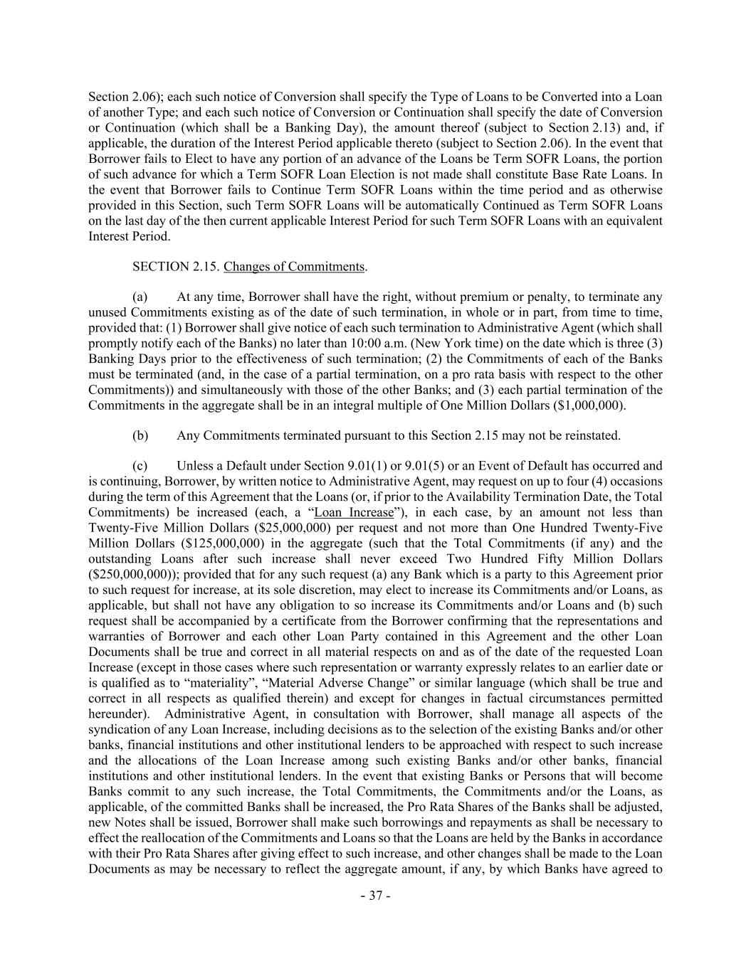 - 37 - Section 2.06); each such notice of Conversion shall specify the Type of Loans to be Converted into a Loan of another Type; and each such notice of Conversion or Continuation shall specify the date of Conversion or Continuation (which shall be a Banking Day), the amount thereof (subject to Section 2.13) and, if applicable, the duration of the Interest Period applicable thereto (subject to Section 2.06). In the event that Borrower fails to Elect to have any portion of an advance of the Loans be Term SOFR Loans, the portion of such advance for which a Term SOFR Loan Election is not made shall constitute Base Rate Loans. In the event that Borrower fails to Continue Term SOFR Loans within the time period and as otherwise provided in this Section, such Term SOFR Loans will be automatically Continued as Term SOFR Loans on the last day of the then current applicable Interest Period for such Term SOFR Loans with an equivalent Interest Period. SECTION 2.15. Changes of Commitments. (a) At any time, Borrower shall have the right, without premium or penalty, to terminate any unused Commitments existing as of the date of such termination, in whole or in part, from time to time, provided that: (1) Borrower shall give notice of each such termination to Administrative Agent (which shall promptly notify each of the Banks) no later than 10:00 a.m. (New York time) on the date which is three (3) Banking Days prior to the effectiveness of such termination; (2) the Commitments of each of the Banks must be terminated (and, in the case of a partial termination, on a pro rata basis with respect to the other Commitments)) and simultaneously with those of the other Banks; and (3) each partial termination of the Commitments in the aggregate shall be in an integral multiple of One Million Dollars ($1,000,000). (b) Any Commitments terminated pursuant to this Section 2.15 may not be reinstated. (c) Unless a Default under Section 9.01(1) or 9.01(5) or an Event of Default has occurred and is continuing, Borrower, by written notice to Administrative Agent, may request on up to four (4) occasions during the term of this Agreement that the Loans (or, if prior to the Availability Termination Date, the Total Commitments) be increased (each, a “Loan Increase”), in each case, by an amount not less than Twenty-Five Million Dollars ($25,000,000) per request and not more than One Hundred Twenty-Five Million Dollars ($125,000,000) in the aggregate (such that the Total Commitments (if any) and the outstanding Loans after such increase shall never exceed Two Hundred Fifty Million Dollars ($250,000,000)); provided that for any such request (a) any Bank which is a party to this Agreement prior to such request for increase, at its sole discretion, may elect to increase its Commitments and/or Loans, as applicable, but shall not have any obligation to so increase its Commitments and/or Loans and (b) such request shall be accompanied by a certificate from the Borrower confirming that the representations and warranties of Borrower and each other Loan Party contained in this Agreement and the other Loan Documents shall be true and correct in all material respects on and as of the date of the requested Loan Increase (except in those cases where such representation or warranty expressly relates to an earlier date or is qualified as to “materiality”, “Material Adverse Change” or similar language (which shall be true and correct in all respects as qualified therein) and except for changes in factual circumstances permitted hereunder). Administrative Agent, in consultation with Borrower, shall manage all aspects of the syndication of any Loan Increase, including decisions as to the selection of the existing Banks and/or other banks, financial institutions and other institutional lenders to be approached with respect to such increase and the allocations of the Loan Increase among such existing Banks and/or other banks, financial institutions and other institutional lenders. In the event that existing Banks or Persons that will become Banks commit to any such increase, the Total Commitments, the Commitments and/or the Loans, as applicable, of the committed Banks shall be increased, the Pro Rata Shares of the Banks shall be adjusted, new Notes shall be issued, Borrower shall make such borrowings and repayments as shall be necessary to effect the reallocation of the Commitments and Loans so that the Loans are held by the Banks in accordance with their Pro Rata Shares after giving effect to such increase, and other changes shall be made to the Loan Documents as may be necessary to reflect the aggregate amount, if any, by which Banks have agreed to
