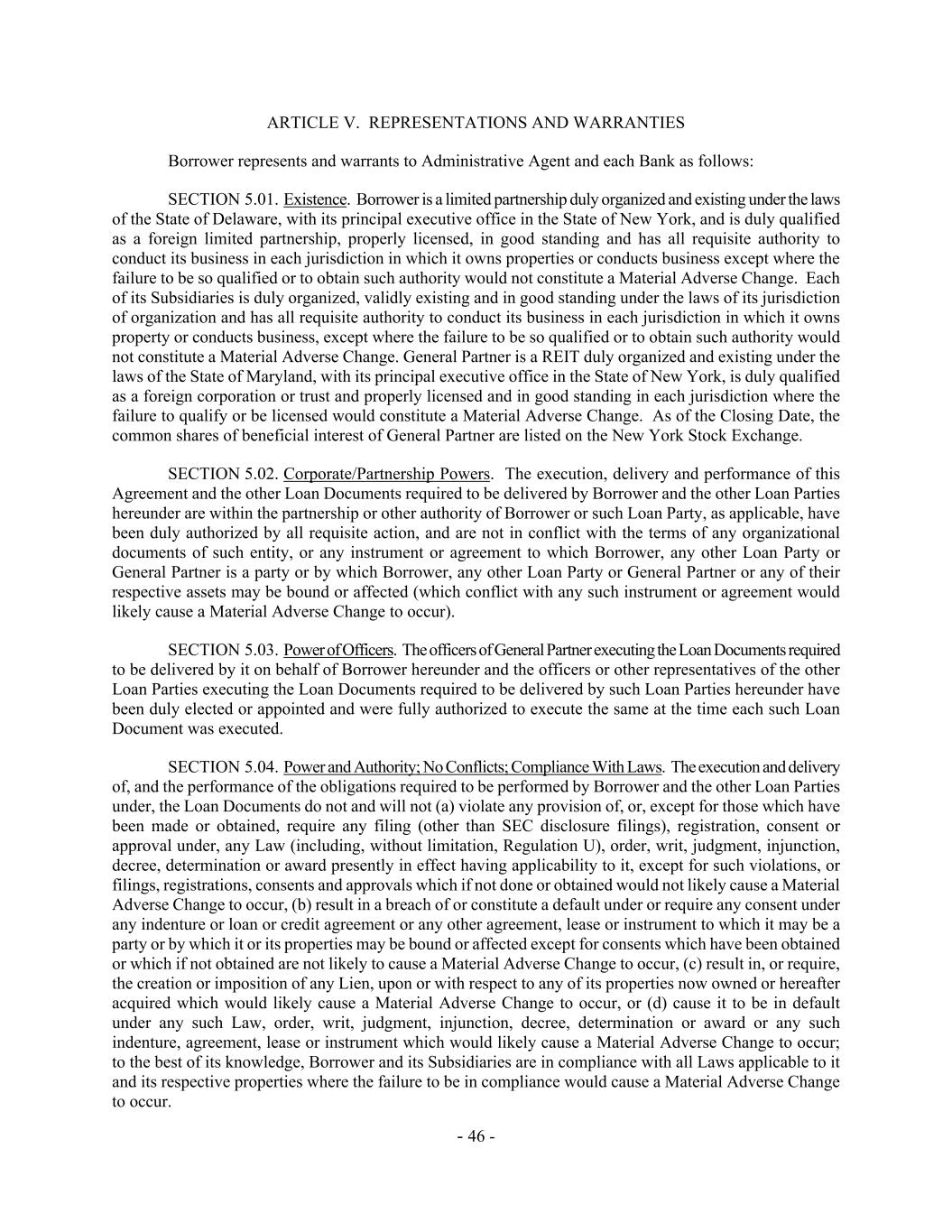 - 46 - ARTICLE V. REPRESENTATIONS AND WARRANTIES Borrower represents and warrants to Administrative Agent and each Bank as follows: SECTION 5.01. Existence. Borrower is a limited partnership duly organized and existing under the laws of the State of Delaware, with its principal executive office in the State of New York, and is duly qualified as a foreign limited partnership, properly licensed, in good standing and has all requisite authority to conduct its business in each jurisdiction in which it owns properties or conducts business except where the failure to be so qualified or to obtain such authority would not constitute a Material Adverse Change. Each of its Subsidiaries is duly organized, validly existing and in good standing under the laws of its jurisdiction of organization and has all requisite authority to conduct its business in each jurisdiction in which it owns property or conducts business, except where the failure to be so qualified or to obtain such authority would not constitute a Material Adverse Change. General Partner is a REIT duly organized and existing under the laws of the State of Maryland, with its principal executive office in the State of New York, is duly qualified as a foreign corporation or trust and properly licensed and in good standing in each jurisdiction where the failure to qualify or be licensed would constitute a Material Adverse Change. As of the Closing Date, the common shares of beneficial interest of General Partner are listed on the New York Stock Exchange. SECTION 5.02. Corporate/Partnership Powers. The execution, delivery and performance of this Agreement and the other Loan Documents required to be delivered by Borrower and the other Loan Parties hereunder are within the partnership or other authority of Borrower or such Loan Party, as applicable, have been duly authorized by all requisite action, and are not in conflict with the terms of any organizational documents of such entity, or any instrument or agreement to which Borrower, any other Loan Party or General Partner is a party or by which Borrower, any other Loan Party or General Partner or any of their respective assets may be bound or affected (which conflict with any such instrument or agreement would likely cause a Material Adverse Change to occur). SECTION 5.03. Power of Officers. The officers of General Partner executing the Loan Documents required to be delivered by it on behalf of Borrower hereunder and the officers or other representatives of the other Loan Parties executing the Loan Documents required to be delivered by such Loan Parties hereunder have been duly elected or appointed and were fully authorized to execute the same at the time each such Loan Document was executed. SECTION 5.04. Power and Authority; No Conflicts; Compliance With Laws. The execution and delivery of, and the performance of the obligations required to be performed by Borrower and the other Loan Parties under, the Loan Documents do not and will not (a) violate any provision of, or, except for those which have been made or obtained, require any filing (other than SEC disclosure filings), registration, consent or approval under, any Law (including, without limitation, Regulation U), order, writ, judgment, injunction, decree, determination or award presently in effect having applicability to it, except for such violations, or filings, registrations, consents and approvals which if not done or obtained would not likely cause a Material Adverse Change to occur, (b) result in a breach of or constitute a default under or require any consent under any indenture or loan or credit agreement or any other agreement, lease or instrument to which it may be a party or by which it or its properties may be bound or affected except for consents which have been obtained or which if not obtained are not likely to cause a Material Adverse Change to occur, (c) result in, or require, the creation or imposition of any Lien, upon or with respect to any of its properties now owned or hereafter acquired which would likely cause a Material Adverse Change to occur, or (d) cause it to be in default under any such Law, order, writ, judgment, injunction, decree, determination or award or any such indenture, agreement, lease or instrument which would likely cause a Material Adverse Change to occur; to the best of its knowledge, Borrower and its Subsidiaries are in compliance with all Laws applicable to it and its respective properties where the failure to be in compliance would cause a Material Adverse Change to occur.