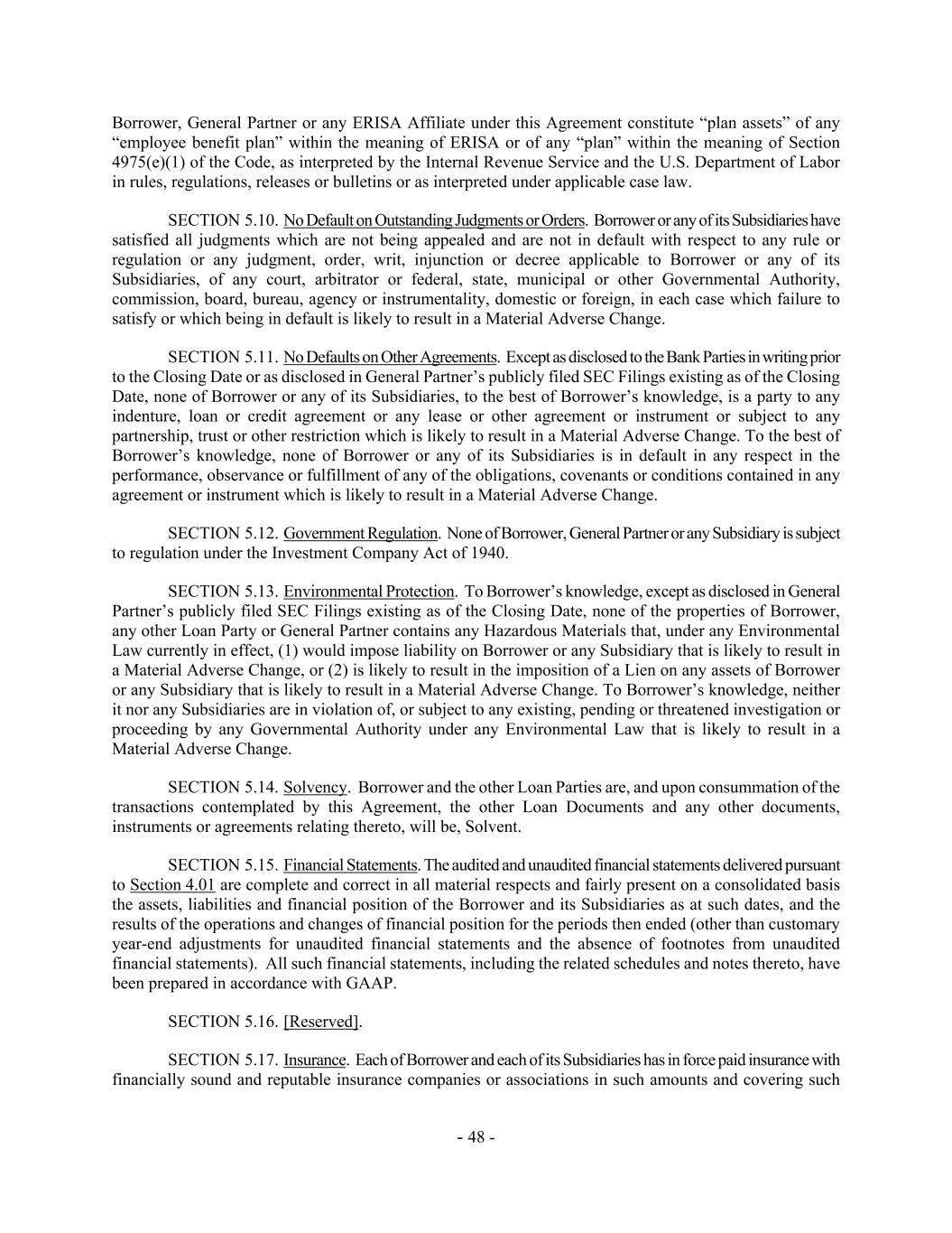 - 48 - Borrower, General Partner or any ERISA Affiliate under this Agreement constitute “plan assets” of any “employee benefit plan” within the meaning of ERISA or of any “plan” within the meaning of Section 4975(e)(1) of the Code, as interpreted by the Internal Revenue Service and the U.S. Department of Labor in rules, regulations, releases or bulletins or as interpreted under applicable case law. SECTION 5.10. No Default on Outstanding Judgments or Orders. Borrower or any of its Subsidiaries have satisfied all judgments which are not being appealed and are not in default with respect to any rule or regulation or any judgment, order, writ, injunction or decree applicable to Borrower or any of its Subsidiaries, of any court, arbitrator or federal, state, municipal or other Governmental Authority, commission, board, bureau, agency or instrumentality, domestic or foreign, in each case which failure to satisfy or which being in default is likely to result in a Material Adverse Change. SECTION 5.11. No Defaults on Other Agreements. Except as disclosed to the Bank Parties in writing prior to the Closing Date or as disclosed in General Partner’s publicly filed SEC Filings existing as of the Closing Date, none of Borrower or any of its Subsidiaries, to the best of Borrower’s knowledge, is a party to any indenture, loan or credit agreement or any lease or other agreement or instrument or subject to any partnership, trust or other restriction which is likely to result in a Material Adverse Change. To the best of Borrower’s knowledge, none of Borrower or any of its Subsidiaries is in default in any respect in the performance, observance or fulfillment of any of the obligations, covenants or conditions contained in any agreement or instrument which is likely to result in a Material Adverse Change. SECTION 5.12. Government Regulation. None of Borrower, General Partner or any Subsidiary is subject to regulation under the Investment Company Act of 1940. SECTION 5.13. Environmental Protection. To Borrower’s knowledge, except as disclosed in General Partner’s publicly filed SEC Filings existing as of the Closing Date, none of the properties of Borrower, any other Loan Party or General Partner contains any Hazardous Materials that, under any Environmental Law currently in effect, (1) would impose liability on Borrower or any Subsidiary that is likely to result in a Material Adverse Change, or (2) is likely to result in the imposition of a Lien on any assets of Borrower or any Subsidiary that is likely to result in a Material Adverse Change. To Borrower’s knowledge, neither it nor any Subsidiaries are in violation of, or subject to any existing, pending or threatened investigation or proceeding by any Governmental Authority under any Environmental Law that is likely to result in a Material Adverse Change. SECTION 5.14. Solvency. Borrower and the other Loan Parties are, and upon consummation of the transactions contemplated by this Agreement, the other Loan Documents and any other documents, instruments or agreements relating thereto, will be, Solvent. SECTION 5.15. Financial Statements. The audited and unaudited financial statements delivered pursuant to Section 4.01 are complete and correct in all material respects and fairly present on a consolidated basis the assets, liabilities and financial position of the Borrower and its Subsidiaries as at such dates, and the results of the operations and changes of financial position for the periods then ended (other than customary year-end adjustments for unaudited financial statements and the absence of footnotes from unaudited financial statements). All such financial statements, including the related schedules and notes thereto, have been prepared in accordance with GAAP. SECTION 5.16. [Reserved]. SECTION 5.17. Insurance. Each of Borrower and each of its Subsidiaries has in force paid insurance with financially sound and reputable insurance companies or associations in such amounts and covering such