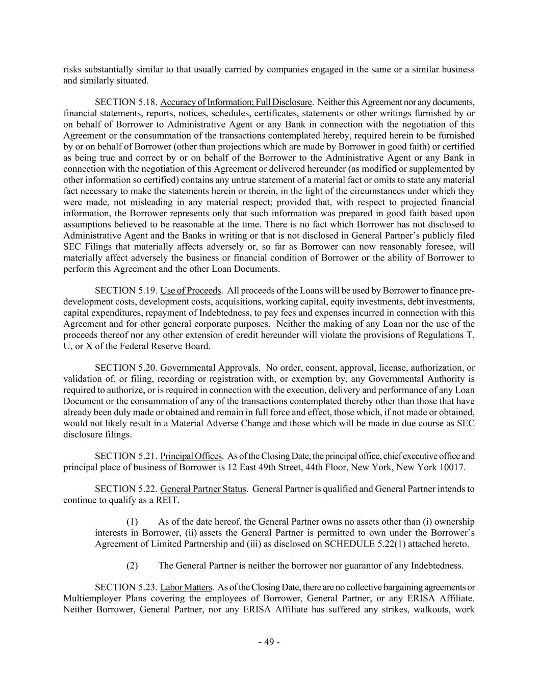- 49 - risks substantially similar to that usually carried by companies engaged in the same or a similar business and similarly situated. SECTION 5.18. Accuracy of Information; Full Disclosure. Neither this Agreement nor any documents, financial statements, reports, notices, schedules, certificates, statements or other writings furnished by or on behalf of Borrower to Administrative Agent or any Bank in connection with the negotiation of this Agreement or the consummation of the transactions contemplated hereby, required herein to be furnished by or on behalf of Borrower (other than projections which are made by Borrower in good faith) or certified as being true and correct by or on behalf of the Borrower to the Administrative Agent or any Bank in connection with the negotiation of this Agreement or delivered hereunder (as modified or supplemented by other information so certified) contains any untrue statement of a material fact or omits to state any material fact necessary to make the statements herein or therein, in the light of the circumstances under which they were made, not misleading in any material respect; provided that, with respect to projected financial information, the Borrower represents only that such information was prepared in good faith based upon assumptions believed to be reasonable at the time. There is no fact which Borrower has not disclosed to Administrative Agent and the Banks in writing or that is not disclosed in General Partner’s publicly filed SEC Filings that materially affects adversely or, so far as Borrower can now reasonably foresee, will materially affect adversely the business or financial condition of Borrower or the ability of Borrower to perform this Agreement and the other Loan Documents. SECTION 5.19. Use of Proceeds. All proceeds of the Loans will be used by Borrower to finance pre- development costs, development costs, acquisitions, working capital, equity investments, debt investments, capital expenditures, repayment of Indebtedness, to pay fees and expenses incurred in connection with this Agreement and for other general corporate purposes. Neither the making of any Loan nor the use of the proceeds thereof nor any other extension of credit hereunder will violate the provisions of Regulations T, U, or X of the Federal Reserve Board. SECTION 5.20. Governmental Approvals. No order, consent, approval, license, authorization, or validation of, or filing, recording or registration with, or exemption by, any Governmental Authority is required to authorize, or is required in connection with the execution, delivery and performance of any Loan Document or the consummation of any of the transactions contemplated thereby other than those that have already been duly made or obtained and remain in full force and effect, those which, if not made or obtained, would not likely result in a Material Adverse Change and those which will be made in due course as SEC disclosure filings. SECTION 5.21. Principal Offices. As of the Closing Date, the principal office, chief executive office and principal place of business of Borrower is 12 East 49th Street, 44th Floor, New York, New York 10017. SECTION 5.22. General Partner Status. General Partner is qualified and General Partner intends to continue to qualify as a REIT. (1) As of the date hereof, the General Partner owns no assets other than (i) ownership interests in Borrower, (ii) assets the General Partner is permitted to own under the Borrower’s Agreement of Limited Partnership and (iii) as disclosed on SCHEDULE 5.22(1) attached hereto. (2) The General Partner is neither the borrower nor guarantor of any Indebtedness. SECTION 5.23. Labor Matters. As of the Closing Date, there are no collective bargaining agreements or Multiemployer Plans covering the employees of Borrower, General Partner, or any ERISA Affiliate. Neither Borrower, General Partner, nor any ERISA Affiliate has suffered any strikes, walkouts, work