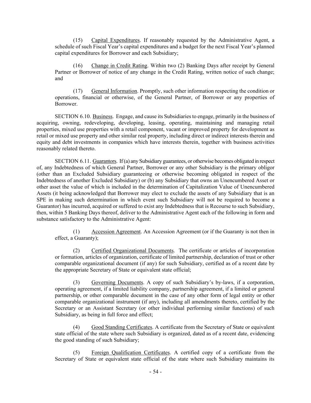 - 54 - (15) Capital Expenditures. If reasonably requested by the Administrative Agent, a schedule of such Fiscal Year’s capital expenditures and a budget for the next Fiscal Year’s planned capital expenditures for Borrower and each Subsidiary; (16) Change in Credit Rating. Within two (2) Banking Days after receipt by General Partner or Borrower of notice of any change in the Credit Rating, written notice of such change; and (17) General Information. Promptly, such other information respecting the condition or operations, financial or otherwise, of the General Partner, of Borrower or any properties of Borrower. SECTION 6.10. Business. Engage, and cause its Subsidiaries to engage, primarily in the business of acquiring, owning, redeveloping, developing, leasing, operating, maintaining and managing retail properties, mixed use properties with a retail component, vacant or improved property for development as retail or mixed use property and other similar real property, including direct or indirect interests therein and equity and debt investments in companies which have interests therein, together with business activities reasonably related thereto. SECTION 6.11. Guarantors. If (a) any Subsidiary guarantees, or otherwise becomes obligated in respect of, any Indebtedness of which General Partner, Borrower or any other Subsidiary is the primary obligor (other than an Excluded Subsidiary guaranteeing or otherwise becoming obligated in respect of the Indebtedness of another Excluded Subsidiary) or (b) any Subsidiary that owns an Unencumbered Asset or other asset the value of which is included in the determination of Capitalization Value of Unencumbered Assets (it being acknowledged that Borrower may elect to exclude the assets of any Subsidiary that is an SPE in making such determination in which event such Subsidiary will not be required to become a Guarantor) has incurred, acquired or suffered to exist any Indebtedness that is Recourse to such Subsidiary, then, within 5 Banking Days thereof, deliver to the Administrative Agent each of the following in form and substance satisfactory to the Administrative Agent: (1) Accession Agreement. An Accession Agreement (or if the Guaranty is not then in effect, a Guaranty); (2) Certified Organizational Documents. The certificate or articles of incorporation or formation, articles of organization, certificate of limited partnership, declaration of trust or other comparable organizational document (if any) for such Subsidiary, certified as of a recent date by the appropriate Secretary of State or equivalent state official; (3) Governing Documents. A copy of such Subsidiary’s by-laws, if a corporation, operating agreement, if a limited liability company, partnership agreement, if a limited or general partnership, or other comparable document in the case of any other form of legal entity or other comparable organizational instrument (if any), including all amendments thereto, certified by the Secretary or an Assistant Secretary (or other individual performing similar functions) of such Subsidiary, as being in full force and effect; (4) Good Standing Certificates. A certificate from the Secretary of State or equivalent state official of the state where such Subsidiary is organized, dated as of a recent date, evidencing the good standing of such Subsidiary; (5) Foreign Qualification Certificates. A certified copy of a certificate from the Secretary of State or equivalent state official of the state where such Subsidiary maintains its