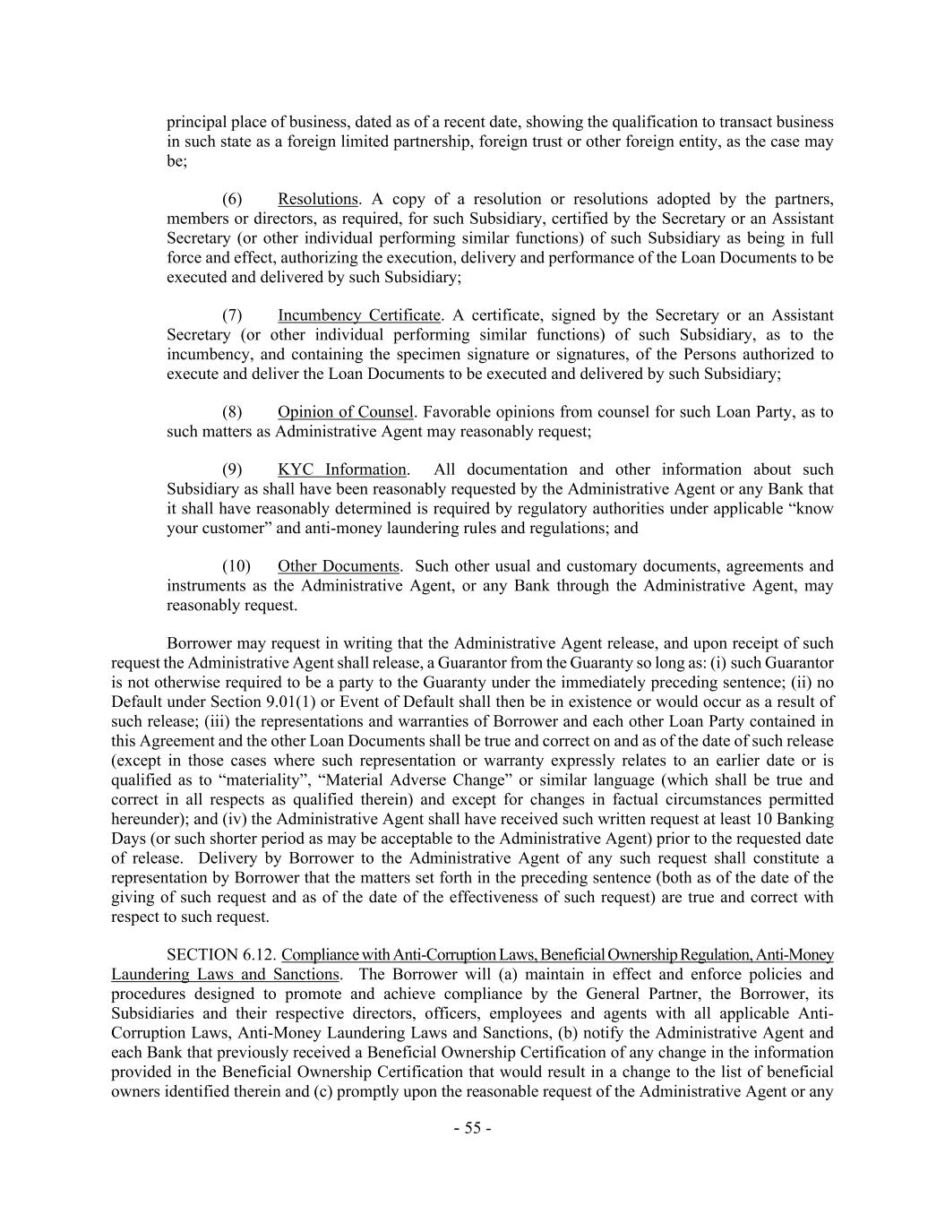 - 55 - principal place of business, dated as of a recent date, showing the qualification to transact business in such state as a foreign limited partnership, foreign trust or other foreign entity, as the case may be; (6) Resolutions. A copy of a resolution or resolutions adopted by the partners, members or directors, as required, for such Subsidiary, certified by the Secretary or an Assistant Secretary (or other individual performing similar functions) of such Subsidiary as being in full force and effect, authorizing the execution, delivery and performance of the Loan Documents to be executed and delivered by such Subsidiary; (7) Incumbency Certificate. A certificate, signed by the Secretary or an Assistant Secretary (or other individual performing similar functions) of such Subsidiary, as to the incumbency, and containing the specimen signature or signatures, of the Persons authorized to execute and deliver the Loan Documents to be executed and delivered by such Subsidiary; (8) Opinion of Counsel. Favorable opinions from counsel for such Loan Party, as to such matters as Administrative Agent may reasonably request; (9) KYC Information. All documentation and other information about such Subsidiary as shall have been reasonably requested by the Administrative Agent or any Bank that it shall have reasonably determined is required by regulatory authorities under applicable “know your customer” and anti-money laundering rules and regulations; and (10) Other Documents. Such other usual and customary documents, agreements and instruments as the Administrative Agent, or any Bank through the Administrative Agent, may reasonably request. Borrower may request in writing that the Administrative Agent release, and upon receipt of such request the Administrative Agent shall release, a Guarantor from the Guaranty so long as: (i) such Guarantor is not otherwise required to be a party to the Guaranty under the immediately preceding sentence; (ii) no Default under Section 9.01(1) or Event of Default shall then be in existence or would occur as a result of such release; (iii) the representations and warranties of Borrower and each other Loan Party contained in this Agreement and the other Loan Documents shall be true and correct on and as of the date of such release (except in those cases where such representation or warranty expressly relates to an earlier date or is qualified as to “materiality”, “Material Adverse Change” or similar language (which shall be true and correct in all respects as qualified therein) and except for changes in factual circumstances permitted hereunder); and (iv) the Administrative Agent shall have received such written request at least 10 Banking Days (or such shorter period as may be acceptable to the Administrative Agent) prior to the requested date of release. Delivery by Borrower to the Administrative Agent of any such request shall constitute a representation by Borrower that the matters set forth in the preceding sentence (both as of the date of the giving of such request and as of the date of the effectiveness of such request) are true and correct with respect to such request. SECTION 6.12. Compliance with Anti-Corruption Laws, Beneficial Ownership Regulation, Anti-Money Laundering Laws and Sanctions. The Borrower will (a) maintain in effect and enforce policies and procedures designed to promote and achieve compliance by the General Partner, the Borrower, its Subsidiaries and their respective directors, officers, employees and agents with all applicable Anti- Corruption Laws, Anti-Money Laundering Laws and Sanctions, (b) notify the Administrative Agent and each Bank that previously received a Beneficial Ownership Certification of any change in the information provided in the Beneficial Ownership Certification that would result in a change to the list of beneficial owners identified therein and (c) promptly upon the reasonable request of the Administrative Agent or any