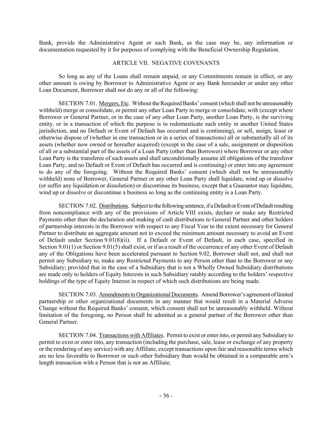 - 56 - Bank, provide the Administrative Agent or such Bank, as the case may be, any information or documentation requested by it for purposes of complying with the Beneficial Ownership Regulation. ARTICLE VII. NEGATIVE COVENANTS So long as any of the Loans shall remain unpaid, or any Commitments remain in effect, or any other amount is owing by Borrower to Administrative Agent or any Bank hereunder or under any other Loan Document, Borrower shall not do any or all of the following: SECTION 7.01. Mergers, Etc. Without the Required Banks’ consent (which shall not be unreasonably withheld) merge or consolidate, or permit any other Loan Party to merge or consolidate, with (except where Borrower or General Partner, or in the case of any other Loan Party, another Loan Party, is the surviving entity, or in a transaction of which the purpose is to redomesticate such entity in another United States jurisdiction, and no Default or Event of Default has occurred and is continuing), or sell, assign, lease or otherwise dispose of (whether in one transaction or in a series of transactions) all or substantially all of its assets (whether now owned or hereafter acquired) (except in the case of a sale, assignment or disposition of all or a substantial part of the assets of a Loan Party (other than Borrower) where Borrower or any other Loan Party is the transferee of such assets and shall unconditionally assume all obligations of the transferor Loan Party, and no Default or Event of Default has occurred and is continuing) or enter into any agreement to do any of the foregoing. Without the Required Banks’ consent (which shall not be unreasonably withheld) none of Borrower, General Partner or any other Loan Party shall liquidate, wind up or dissolve (or suffer any liquidation or dissolution) or discontinue its business, except that a Guarantor may liquidate, wind up or dissolve or discontinue a business so long as the continuing entity is a Loan Party. SECTION 7.02. Distributions. Subject to the following sentence, if a Default or Event of Default resulting from noncompliance with any of the provisions of Article VIII exists, declare or make any Restricted Payments other than the declaration and making of cash distributions to General Partner and other holders of partnership interests in the Borrower with respect to any Fiscal Year to the extent necessary for General Partner to distribute an aggregate amount not to exceed the minimum amount necessary to avoid an Event of Default under Section 9.01(8)(ii). If a Default or Event of Default, in each case, specified in Section 9.01(1) or Section 9.01(5) shall exist, or if as a result of the occurrence of any other Event of Default any of the Obligations have been accelerated pursuant to Section 9.02, Borrower shall not, and shall not permit any Subsidiary to, make any Restricted Payments to any Person other than to the Borrower or any Subsidiary; provided that in the case of a Subsidiary that is not a Wholly Owned Subsidiary distributions are made only to holders of Equity Interests in such Subsidiary ratably according to the holders’ respective holdings of the type of Equity Interest in respect of which such distributions are being made. SECTION 7.03. Amendments to Organizational Documents. Amend Borrower’s agreement of limited partnership or other organizational documents in any manner that would result in a Material Adverse Change without the Required Banks’ consent, which consent shall not be unreasonably withheld. Without limitation of the foregoing, no Person shall be admitted as a general partner of the Borrower other than General Partner. SECTION 7.04. Transactions with Affiliates. Permit to exist or enter into, or permit any Subsidiary to permit to exist or enter into, any transaction (including the purchase, sale, lease or exchange of any property or the rendering of any service) with any Affiliate, except transactions upon fair and reasonable terms which are no less favorable to Borrower or such other Subsidiary than would be obtained in a comparable arm’s length transaction with a Person that is not an Affiliate.