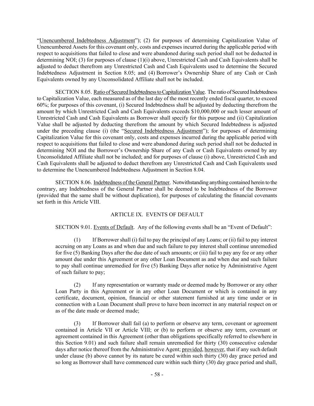 - 58 - “Unencumbered Indebtedness Adjustment”); (2) for purposes of determining Capitalization Value of Unencumbered Assets for this covenant only, costs and expenses incurred during the applicable period with respect to acquisitions that failed to close and were abandoned during such period shall not be deducted in determining NOI; (3) for purposes of clause (1)(i) above, Unrestricted Cash and Cash Equivalents shall be adjusted to deduct therefrom any Unrestricted Cash and Cash Equivalents used to determine the Secured Indebtedness Adjustment in Section 8.05; and (4) Borrower’s Ownership Share of any Cash or Cash Equivalents owned by any Unconsolidated Affiliate shall not be included. SECTION 8.05. Ratio of Secured Indebtedness to Capitalization Value. The ratio of Secured Indebtedness to Capitalization Value, each measured as of the last day of the most recently ended fiscal quarter, to exceed 60%; for purposes of this covenant, (i) Secured Indebtedness shall be adjusted by deducting therefrom the amount by which Unrestricted Cash and Cash Equivalents exceeds $10,000,000 or such lesser amount of Unrestricted Cash and Cash Equivalents as Borrower shall specify for this purpose and (ii) Capitalization Value shall be adjusted by deducting therefrom the amount by which Secured Indebtedness is adjusted under the preceding clause (i) (the “Secured Indebtedness Adjustment”); for purposes of determining Capitalization Value for this covenant only, costs and expenses incurred during the applicable period with respect to acquisitions that failed to close and were abandoned during such period shall not be deducted in determining NOI and the Borrower’s Ownership Share of any Cash or Cash Equivalents owned by any Unconsolidated Affiliate shall not be included; and for purposes of clause (i) above, Unrestricted Cash and Cash Equivalents shall be adjusted to deduct therefrom any Unrestricted Cash and Cash Equivalents used to determine the Unencumbered Indebtedness Adjustment in Section 8.04. SECTION 8.06. Indebtedness of the General Partner. Notwithstanding anything contained herein to the contrary, any Indebtedness of the General Partner shall be deemed to be Indebtedness of the Borrower (provided that the same shall be without duplication), for purposes of calculating the financial covenants set forth in this Article VIII. ARTICLE IX. EVENTS OF DEFAULT SECTION 9.01. Events of Default. Any of the following events shall be an “Event of Default”: (1) If Borrower shall (i) fail to pay the principal of any Loans; or (ii) fail to pay interest accruing on any Loans as and when due and such failure to pay interest shall continue unremedied for five (5) Banking Days after the due date of such amounts; or (iii) fail to pay any fee or any other amount due under this Agreement or any other Loan Document as and when due and such failure to pay shall continue unremedied for five (5) Banking Days after notice by Administrative Agent of such failure to pay; (2) If any representation or warranty made or deemed made by Borrower or any other Loan Party in this Agreement or in any other Loan Document or which is contained in any certificate, document, opinion, financial or other statement furnished at any time under or in connection with a Loan Document shall prove to have been incorrect in any material respect on or as of the date made or deemed made; (3) If Borrower shall fail (a) to perform or observe any term, covenant or agreement contained in Article VII or Article VIII; or (b) to perform or observe any term, covenant or agreement contained in this Agreement (other than obligations specifically referred to elsewhere in this Section 9.01) and such failure shall remain unremedied for thirty (30) consecutive calendar days after notice thereof from the Administrative Agent; provided, however, that if any such default under clause (b) above cannot by its nature be cured within such thirty (30) day grace period and so long as Borrower shall have commenced cure within such thirty (30) day grace period and shall,