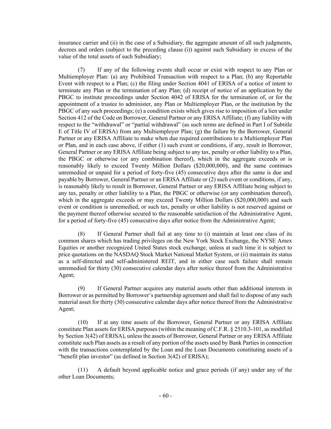 - 60 - insurance carrier and (ii) in the case of a Subsidiary, the aggregate amount of all such judgments, decrees and orders (subject to the preceding clause (i)) against such Subsidiary in excess of the value of the total assets of such Subsidiary; (7) If any of the following events shall occur or exist with respect to any Plan or Multiemployer Plan: (a) any Prohibited Transaction with respect to a Plan; (b) any Reportable Event with respect to a Plan; (c) the filing under Section 4041 of ERISA of a notice of intent to terminate any Plan or the termination of any Plan; (d) receipt of notice of an application by the PBGC to institute proceedings under Section 4042 of ERISA for the termination of, or for the appointment of a trustee to administer, any Plan or Multiemployer Plan, or the institution by the PBGC of any such proceedings; (e) a condition exists which gives rise to imposition of a lien under Section 412 of the Code on Borrower, General Partner or any ERISA Affiliate; (f) any liability with respect to the “withdrawal” or “partial withdrawal” (as such terms are defined in Part I of Subtitle E of Title IV of ERISA) from any Multiemployer Plan; (g) the failure by the Borrower, General Partner or any ERISA Affiliate to make when due required contributions to a Multiemployer Plan or Plan, and in each case above, if either (1) such event or conditions, if any, result in Borrower, General Partner or any ERISA Affiliate being subject to any tax, penalty or other liability to a Plan, the PBGC or otherwise (or any combination thereof), which in the aggregate exceeds or is reasonably likely to exceed Twenty Million Dollars ($20,000,000), and the same continues unremedied or unpaid for a period of forty-five (45) consecutive days after the same is due and payable by Borrower, General Partner or an ERISA Affiliate or (2) such event or conditions, if any, is reasonably likely to result in Borrower, General Partner or any ERISA Affiliate being subject to any tax, penalty or other liability to a Plan, the PBGC or otherwise (or any combination thereof), which in the aggregate exceeds or may exceed Twenty Million Dollars ($20,000,000) and such event or condition is unremedied, or such tax, penalty or other liability is not reserved against or the payment thereof otherwise secured to the reasonable satisfaction of the Administrative Agent, for a period of forty-five (45) consecutive days after notice from the Administrative Agent; (8) If General Partner shall fail at any time to (i) maintain at least one class of its common shares which has trading privileges on the New York Stock Exchange, the NYSE Amex Equities or another recognized United States stock exchange, unless at such time it is subject to price quotations on the NASDAQ Stock Market National Market System, or (ii) maintain its status as a self-directed and self-administered REIT, and in either case such failure shall remain unremedied for thirty (30) consecutive calendar days after notice thereof from the Administrative Agent; (9) If General Partner acquires any material assets other than additional interests in Borrower or as permitted by Borrower’s partnership agreement and shall fail to dispose of any such material asset for thirty (30) consecutive calendar days after notice thereof from the Administrative Agent; (10) If at any time assets of the Borrower, General Partner or any ERISA Affiliate constitute Plan assets for ERISA purposes (within the meaning of C.F.R. § 2510.3-101, as modified by Section 3(42) of ERISA), unless the assets of Borrower, General Partner or any ERISA Affiliate constitute such Plan assets as a result of any portion of the assets used by Bank Parties in connection with the transactions contemplated by the Loan and the Loan Documents constituting assets of a “benefit plan investor” (as defined in Section 3(42) of ERISA); (11) A default beyond applicable notice and grace periods (if any) under any of the other Loan Documents;
