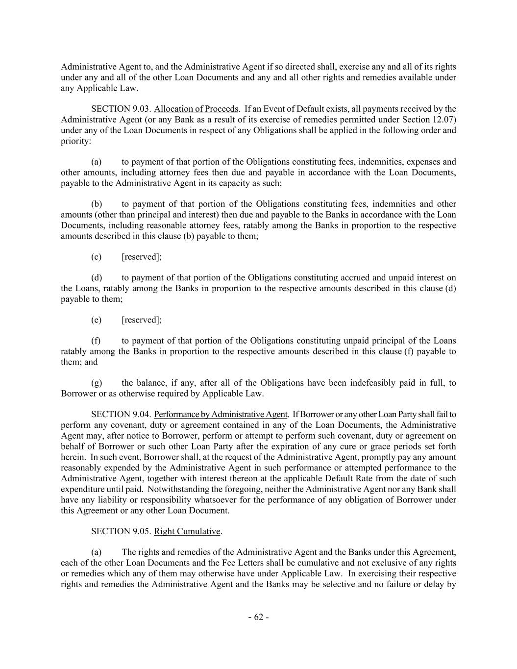 - 62 - Administrative Agent to, and the Administrative Agent if so directed shall, exercise any and all of its rights under any and all of the other Loan Documents and any and all other rights and remedies available under any Applicable Law. SECTION 9.03. Allocation of Proceeds. If an Event of Default exists, all payments received by the Administrative Agent (or any Bank as a result of its exercise of remedies permitted under Section 12.07) under any of the Loan Documents in respect of any Obligations shall be applied in the following order and priority: (a) to payment of that portion of the Obligations constituting fees, indemnities, expenses and other amounts, including attorney fees then due and payable in accordance with the Loan Documents, payable to the Administrative Agent in its capacity as such; (b) to payment of that portion of the Obligations constituting fees, indemnities and other amounts (other than principal and interest) then due and payable to the Banks in accordance with the Loan Documents, including reasonable attorney fees, ratably among the Banks in proportion to the respective amounts described in this clause (b) payable to them; (c) [reserved]; (d) to payment of that portion of the Obligations constituting accrued and unpaid interest on the Loans, ratably among the Banks in proportion to the respective amounts described in this clause (d) payable to them; (e) [reserved]; (f) to payment of that portion of the Obligations constituting unpaid principal of the Loans ratably among the Banks in proportion to the respective amounts described in this clause (f) payable to them; and (g) the balance, if any, after all of the Obligations have been indefeasibly paid in full, to Borrower or as otherwise required by Applicable Law. SECTION 9.04. Performance by Administrative Agent. If Borrower or any other Loan Party shall fail to perform any covenant, duty or agreement contained in any of the Loan Documents, the Administrative Agent may, after notice to Borrower, perform or attempt to perform such covenant, duty or agreement on behalf of Borrower or such other Loan Party after the expiration of any cure or grace periods set forth herein. In such event, Borrower shall, at the request of the Administrative Agent, promptly pay any amount reasonably expended by the Administrative Agent in such performance or attempted performance to the Administrative Agent, together with interest thereon at the applicable Default Rate from the date of such expenditure until paid. Notwithstanding the foregoing, neither the Administrative Agent nor any Bank shall have any liability or responsibility whatsoever for the performance of any obligation of Borrower under this Agreement or any other Loan Document. SECTION 9.05. Right Cumulative. (a) The rights and remedies of the Administrative Agent and the Banks under this Agreement, each of the other Loan Documents and the Fee Letters shall be cumulative and not exclusive of any rights or remedies which any of them may otherwise have under Applicable Law. In exercising their respective rights and remedies the Administrative Agent and the Banks may be selective and no failure or delay by