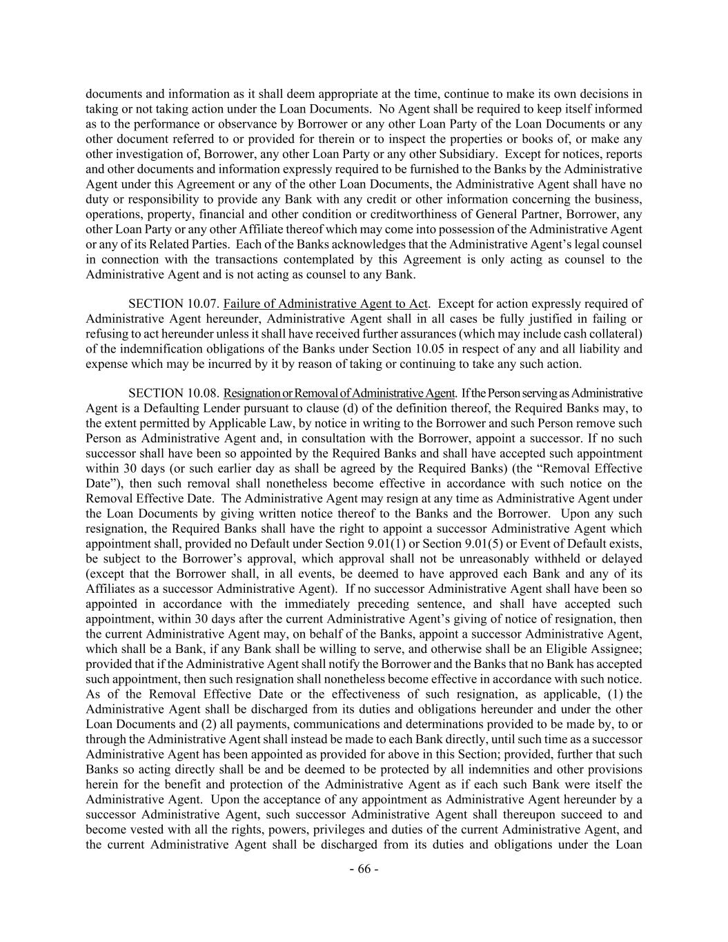 - 66 - documents and information as it shall deem appropriate at the time, continue to make its own decisions in taking or not taking action under the Loan Documents. No Agent shall be required to keep itself informed as to the performance or observance by Borrower or any other Loan Party of the Loan Documents or any other document referred to or provided for therein or to inspect the properties or books of, or make any other investigation of, Borrower, any other Loan Party or any other Subsidiary. Except for notices, reports and other documents and information expressly required to be furnished to the Banks by the Administrative Agent under this Agreement or any of the other Loan Documents, the Administrative Agent shall have no duty or responsibility to provide any Bank with any credit or other information concerning the business, operations, property, financial and other condition or creditworthiness of General Partner, Borrower, any other Loan Party or any other Affiliate thereof which may come into possession of the Administrative Agent or any of its Related Parties. Each of the Banks acknowledges that the Administrative Agent’s legal counsel in connection with the transactions contemplated by this Agreement is only acting as counsel to the Administrative Agent and is not acting as counsel to any Bank. SECTION 10.07. Failure of Administrative Agent to Act. Except for action expressly required of Administrative Agent hereunder, Administrative Agent shall in all cases be fully justified in failing or refusing to act hereunder unless it shall have received further assurances (which may include cash collateral) of the indemnification obligations of the Banks under Section 10.05 in respect of any and all liability and expense which may be incurred by it by reason of taking or continuing to take any such action. SECTION 10.08. Resignation or Removal of Administrative Agent. If the Person serving as Administrative Agent is a Defaulting Lender pursuant to clause (d) of the definition thereof, the Required Banks may, to the extent permitted by Applicable Law, by notice in writing to the Borrower and such Person remove such Person as Administrative Agent and, in consultation with the Borrower, appoint a successor. If no such successor shall have been so appointed by the Required Banks and shall have accepted such appointment within 30 days (or such earlier day as shall be agreed by the Required Banks) (the “Removal Effective Date”), then such removal shall nonetheless become effective in accordance with such notice on the Removal Effective Date. The Administrative Agent may resign at any time as Administrative Agent under the Loan Documents by giving written notice thereof to the Banks and the Borrower. Upon any such resignation, the Required Banks shall have the right to appoint a successor Administrative Agent which appointment shall, provided no Default under Section 9.01(1) or Section 9.01(5) or Event of Default exists, be subject to the Borrower’s approval, which approval shall not be unreasonably withheld or delayed (except that the Borrower shall, in all events, be deemed to have approved each Bank and any of its Affiliates as a successor Administrative Agent). If no successor Administrative Agent shall have been so appointed in accordance with the immediately preceding sentence, and shall have accepted such appointment, within 30 days after the current Administrative Agent’s giving of notice of resignation, then the current Administrative Agent may, on behalf of the Banks, appoint a successor Administrative Agent, which shall be a Bank, if any Bank shall be willing to serve, and otherwise shall be an Eligible Assignee; provided that if the Administrative Agent shall notify the Borrower and the Banks that no Bank has accepted such appointment, then such resignation shall nonetheless become effective in accordance with such notice. As of the Removal Effective Date or the effectiveness of such resignation, as applicable, (1) the Administrative Agent shall be discharged from its duties and obligations hereunder and under the other Loan Documents and (2) all payments, communications and determinations provided to be made by, to or through the Administrative Agent shall instead be made to each Bank directly, until such time as a successor Administrative Agent has been appointed as provided for above in this Section; provided, further that such Banks so acting directly shall be and be deemed to be protected by all indemnities and other provisions herein for the benefit and protection of the Administrative Agent as if each such Bank were itself the Administrative Agent. Upon the acceptance of any appointment as Administrative Agent hereunder by a successor Administrative Agent, such successor Administrative Agent shall thereupon succeed to and become vested with all the rights, powers, privileges and duties of the current Administrative Agent, and the current Administrative Agent shall be discharged from its duties and obligations under the Loan