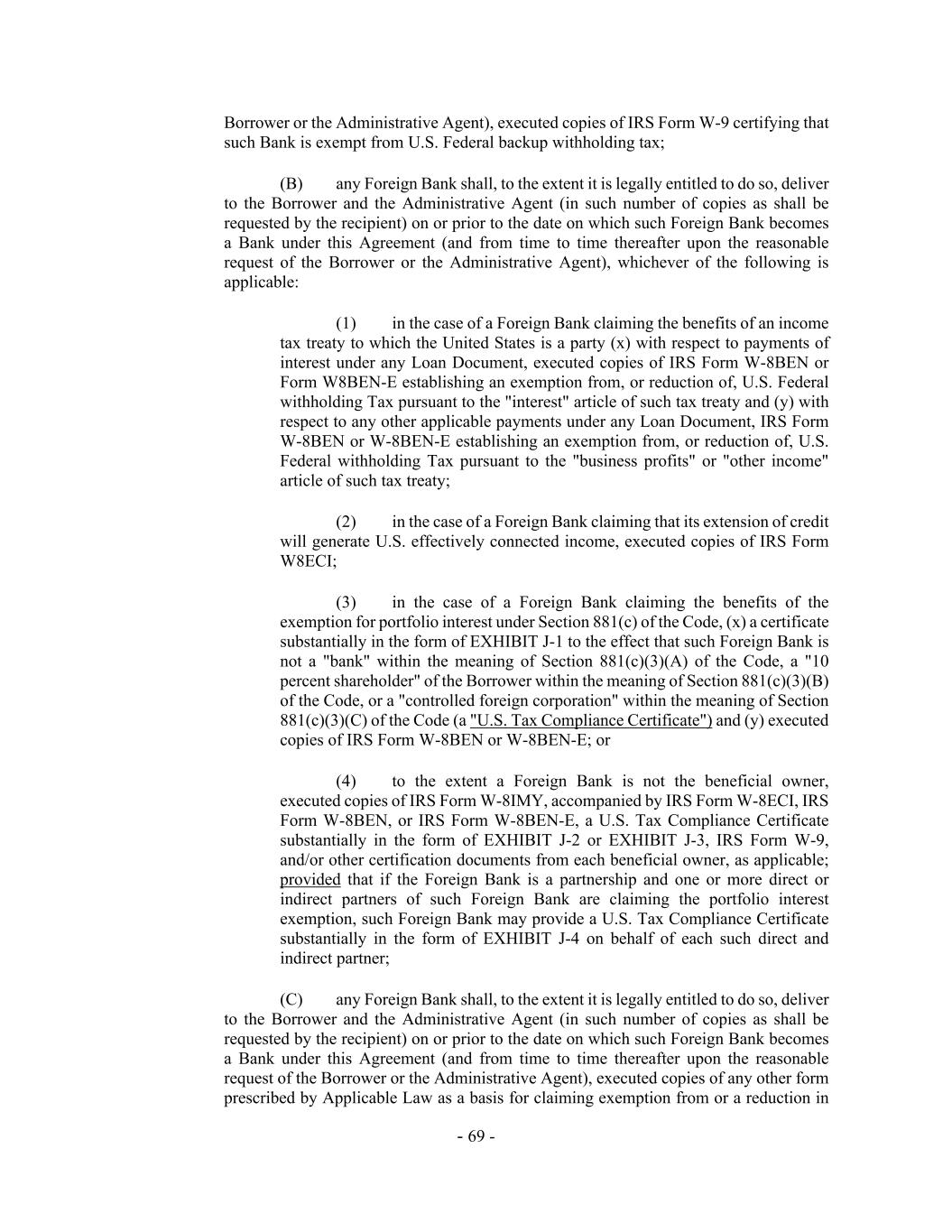 - 69 - Borrower or the Administrative Agent), executed copies of IRS Form W-9 certifying that such Bank is exempt from U.S. Federal backup withholding tax; (B) any Foreign Bank shall, to the extent it is legally entitled to do so, deliver to the Borrower and the Administrative Agent (in such number of copies as shall be requested by the recipient) on or prior to the date on which such Foreign Bank becomes a Bank under this Agreement (and from time to time thereafter upon the reasonable request of the Borrower or the Administrative Agent), whichever of the following is applicable: (1) in the case of a Foreign Bank claiming the benefits of an income tax treaty to which the United States is a party (x) with respect to payments of interest under any Loan Document, executed copies of IRS Form W-8BEN or Form W8BEN-E establishing an exemption from, or reduction of, U.S. Federal withholding Tax pursuant to the "interest" article of such tax treaty and (y) with respect to any other applicable payments under any Loan Document, IRS Form W-8BEN or W-8BEN-E establishing an exemption from, or reduction of, U.S. Federal withholding Tax pursuant to the "business profits" or "other income" article of such tax treaty; (2) in the case of a Foreign Bank claiming that its extension of credit will generate U.S. effectively connected income, executed copies of IRS Form W8ECI; (3) in the case of a Foreign Bank claiming the benefits of the exemption for portfolio interest under Section 881(c) of the Code, (x) a certificate substantially in the form of EXHIBIT J-1 to the effect that such Foreign Bank is not a "bank" within the meaning of Section 881(c)(3)(A) of the Code, a "10 percent shareholder" of the Borrower within the meaning of Section 881(c)(3)(B) of the Code, or a "controlled foreign corporation" within the meaning of Section 881(c)(3)(C) of the Code (a "U.S. Tax Compliance Certificate") and (y) executed copies of IRS Form W-8BEN or W-8BEN-E; or (4) to the extent a Foreign Bank is not the beneficial owner, executed copies of IRS Form W-8IMY, accompanied by IRS Form W-8ECI, IRS Form W-8BEN, or IRS Form W-8BEN-E, a U.S. Tax Compliance Certificate substantially in the form of EXHIBIT J-2 or EXHIBIT J-3, IRS Form W-9, and/or other certification documents from each beneficial owner, as applicable; provided that if the Foreign Bank is a partnership and one or more direct or indirect partners of such Foreign Bank are claiming the portfolio interest exemption, such Foreign Bank may provide a U.S. Tax Compliance Certificate substantially in the form of EXHIBIT J-4 on behalf of each such direct and indirect partner; (C) any Foreign Bank shall, to the extent it is legally entitled to do so, deliver to the Borrower and the Administrative Agent (in such number of copies as shall be requested by the recipient) on or prior to the date on which such Foreign Bank becomes a Bank under this Agreement (and from time to time thereafter upon the reasonable request of the Borrower or the Administrative Agent), executed copies of any other form prescribed by Applicable Law as a basis for claiming exemption from or a reduction in