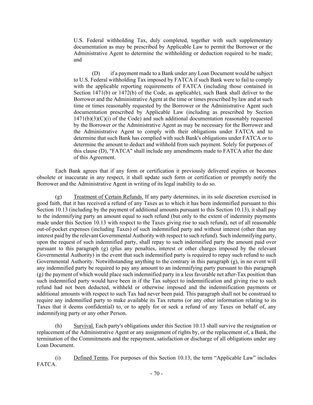 - 70 - U.S. Federal withholding Tax, duly completed, together with such supplementary documentation as may be prescribed by Applicable Law to permit the Borrower or the Administrative Agent to determine the withholding or deduction required to be made; and (D) if a payment made to a Bank under any Loan Document would be subject to U.S. Federal withholding Tax imposed by FATCA if such Bank were to fail to comply with the applicable reporting requirements of FATCA (including those contained in Section 1471(b) or 1472(b) of the Code, as applicable), such Bank shall deliver to the Borrower and the Administrative Agent at the time or times prescribed by law and at such time or times reasonably requested by the Borrower or the Administrative Agent such documentation prescribed by Applicable Law (including as prescribed by Section 1471(b)(3)(C)(i) of the Code) and such additional documentation reasonably requested by the Borrower or the Administrative Agent as may be necessary for the Borrower and the Administrative Agent to comply with their obligations under FATCA and to determine that such Bank has complied with such Bank's obligations under FATCA or to determine the amount to deduct and withhold from such payment. Solely for purposes of this clause (D), "FATCA" shall include any amendments made to FATCA after the date of this Agreement. Each Bank agrees that if any form or certification it previously delivered expires or becomes obsolete or inaccurate in any respect, it shall update such form or certification or promptly notify the Borrower and the Administrative Agent in writing of its legal inability to do so. (g) Treatment of Certain Refunds. If any party determines, in its sole discretion exercised in good faith, that it has received a refund of any Taxes as to which it has been indemnified pursuant to this Section 10.13 (including by the payment of additional amounts pursuant to this Section 10.13), it shall pay to the indemnifying party an amount equal to such refund (but only to the extent of indemnity payments made under this Section 10.13 with respect to the Taxes giving rise to such refund), net of all reasonable out-of-pocket expenses (including Taxes) of such indemnified party and without interest (other than any interest paid by the relevant Governmental Authority with respect to such refund). Such indemnifying party, upon the request of such indemnified party, shall repay to such indemnified party the amount paid over pursuant to this paragraph (g) (plus any penalties, interest or other charges imposed by the relevant Governmental Authority) in the event that such indemnified party is required to repay such refund to such Governmental Authority. Notwithstanding anything to the contrary in this paragraph (g), in no event will any indemnified party be required to pay any amount to an indemnifying party pursuant to this paragraph (g) the payment of which would place such indemnified party in a less favorable net after-Tax position than such indemnified party would have been in if the Tax subject to indemnification and giving rise to such refund had not been deducted, withheld or otherwise imposed and the indemnification payments or additional amounts with respect to such Tax had never been paid. This paragraph shall not be construed to require any indemnified party to make available its Tax returns (or any other information relating to its Taxes that it deems confidential) to, or to apply for or seek a refund of any Taxes on behalf of, any indemnifying party or any other Person. (h) Survival. Each party's obligations under this Section 10.13 shall survive the resignation or replacement of the Administrative Agent or any assignment of rights by, or the replacement of, a Bank, the termination of the Commitments and the repayment, satisfaction or discharge of all obligations under any Loan Document. (i) Defined Terms. For purposes of this Section 10.13, the term “Applicable Law” includes FATCA.