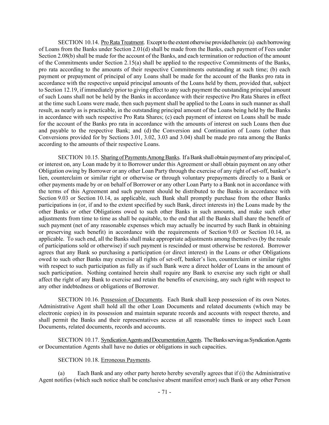 - 71 - SECTION 10.14. Pro Rata Treatment. Except to the extent otherwise provided herein: (a) each borrowing of Loans from the Banks under Section 2.01(d) shall be made from the Banks, each payment of Fees under Section 2.08(b) shall be made for the account of the Banks, and each termination or reduction of the amount of the Commitments under Section 2.15(a) shall be applied to the respective Commitments of the Banks, pro rata according to the amounts of their respective Commitments outstanding at such time; (b) each payment or prepayment of principal of any Loans shall be made for the account of the Banks pro rata in accordance with the respective unpaid principal amounts of the Loans held by them, provided that, subject to Section 12.19, if immediately prior to giving effect to any such payment the outstanding principal amount of such Loans shall not be held by the Banks in accordance with their respective Pro Rata Shares in effect at the time such Loans were made, then such payment shall be applied to the Loans in such manner as shall result, as nearly as is practicable, in the outstanding principal amount of the Loans being held by the Banks in accordance with such respective Pro Rata Shares; (c) each payment of interest on Loans shall be made for the account of the Banks pro rata in accordance with the amounts of interest on such Loans then due and payable to the respective Bank; and (d) the Conversion and Continuation of Loans (other than Conversions provided for by Sections 3.01, 3.02, 3.03 and 3.04) shall be made pro rata among the Banks according to the amounts of their respective Loans. SECTION 10.15. Sharing of Payments Among Banks. If a Bank shall obtain payment of any principal of, or interest on, any Loan made by it to Borrower under this Agreement or shall obtain payment on any other Obligation owing by Borrower or any other Loan Party through the exercise of any right of set-off, banker’s lien, counterclaim or similar right or otherwise or through voluntary prepayments directly to a Bank or other payments made by or on behalf of Borrower or any other Loan Party to a Bank not in accordance with the terms of this Agreement and such payment should be distributed to the Banks in accordance with Section 9.03 or Section 10.14, as applicable, such Bank shall promptly purchase from the other Banks participations in (or, if and to the extent specified by such Bank, direct interests in) the Loans made by the other Banks or other Obligations owed to such other Banks in such amounts, and make such other adjustments from time to time as shall be equitable, to the end that all the Banks shall share the benefit of such payment (net of any reasonable expenses which may actually be incurred by such Bank in obtaining or preserving such benefit) in accordance with the requirements of Section 9.03 or Section 10.14, as applicable. To such end, all the Banks shall make appropriate adjustments among themselves (by the resale of participations sold or otherwise) if such payment is rescinded or must otherwise be restored. Borrower agrees that any Bank so purchasing a participation (or direct interest) in the Loans or other Obligations owed to such other Banks may exercise all rights of set-off, banker’s lien, counterclaim or similar rights with respect to such participation as fully as if such Bank were a direct holder of Loans in the amount of such participation. Nothing contained herein shall require any Bank to exercise any such right or shall affect the right of any Bank to exercise and retain the benefits of exercising, any such right with respect to any other indebtedness or obligations of Borrower. SECTION 10.16. Possession of Documents. Each Bank shall keep possession of its own Notes. Administrative Agent shall hold all the other Loan Documents and related documents (which may be electronic copies) in its possession and maintain separate records and accounts with respect thereto, and shall permit the Banks and their representatives access at all reasonable times to inspect such Loan Documents, related documents, records and accounts. SECTION 10.17. Syndication Agents and Documentation Agents. The Banks serving as Syndication Agents or Documentation Agents shall have no duties or obligations in such capacities. SECTION 10.18. Erroneous Payments. (a) Each Bank and any other party hereto hereby severally agrees that if (i) the Administrative Agent notifies (which such notice shall be conclusive absent manifest error) such Bank or any other Person