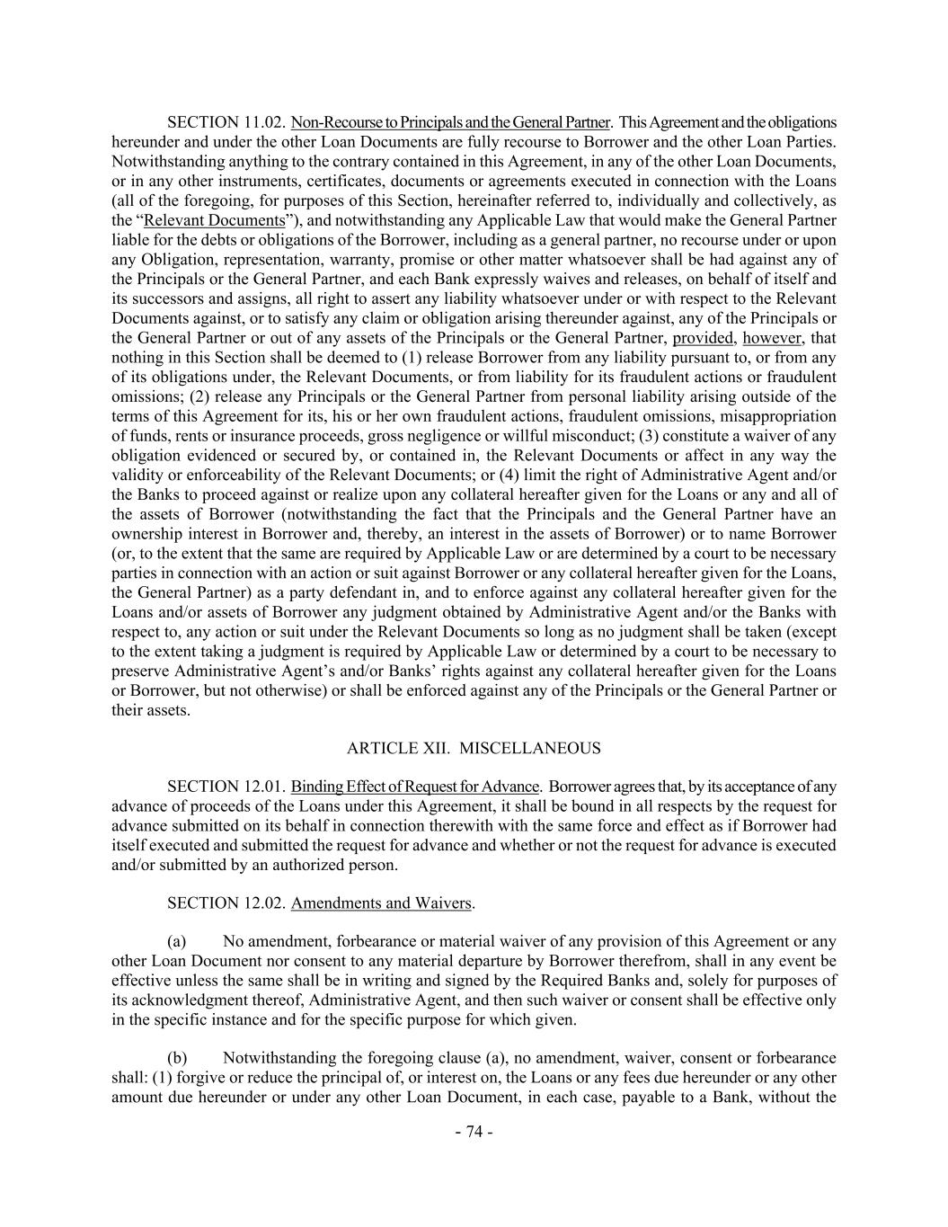 - 74 - SECTION 11.02. Non-Recourse to Principals and the General Partner. This Agreement and the obligations hereunder and under the other Loan Documents are fully recourse to Borrower and the other Loan Parties. Notwithstanding anything to the contrary contained in this Agreement, in any of the other Loan Documents, or in any other instruments, certificates, documents or agreements executed in connection with the Loans (all of the foregoing, for purposes of this Section, hereinafter referred to, individually and collectively, as the “Relevant Documents”), and notwithstanding any Applicable Law that would make the General Partner liable for the debts or obligations of the Borrower, including as a general partner, no recourse under or upon any Obligation, representation, warranty, promise or other matter whatsoever shall be had against any of the Principals or the General Partner, and each Bank expressly waives and releases, on behalf of itself and its successors and assigns, all right to assert any liability whatsoever under or with respect to the Relevant Documents against, or to satisfy any claim or obligation arising thereunder against, any of the Principals or the General Partner or out of any assets of the Principals or the General Partner, provided, however, that nothing in this Section shall be deemed to (1) release Borrower from any liability pursuant to, or from any of its obligations under, the Relevant Documents, or from liability for its fraudulent actions or fraudulent omissions; (2) release any Principals or the General Partner from personal liability arising outside of the terms of this Agreement for its, his or her own fraudulent actions, fraudulent omissions, misappropriation of funds, rents or insurance proceeds, gross negligence or willful misconduct; (3) constitute a waiver of any obligation evidenced or secured by, or contained in, the Relevant Documents or affect in any way the validity or enforceability of the Relevant Documents; or (4) limit the right of Administrative Agent and/or the Banks to proceed against or realize upon any collateral hereafter given for the Loans or any and all of the assets of Borrower (notwithstanding the fact that the Principals and the General Partner have an ownership interest in Borrower and, thereby, an interest in the assets of Borrower) or to name Borrower (or, to the extent that the same are required by Applicable Law or are determined by a court to be necessary parties in connection with an action or suit against Borrower or any collateral hereafter given for the Loans, the General Partner) as a party defendant in, and to enforce against any collateral hereafter given for the Loans and/or assets of Borrower any judgment obtained by Administrative Agent and/or the Banks with respect to, any action or suit under the Relevant Documents so long as no judgment shall be taken (except to the extent taking a judgment is required by Applicable Law or determined by a court to be necessary to preserve Administrative Agent’s and/or Banks’ rights against any collateral hereafter given for the Loans or Borrower, but not otherwise) or shall be enforced against any of the Principals or the General Partner or their assets. ARTICLE XII. MISCELLANEOUS SECTION 12.01. Binding Effect of Request for Advance. Borrower agrees that, by its acceptance of any advance of proceeds of the Loans under this Agreement, it shall be bound in all respects by the request for advance submitted on its behalf in connection therewith with the same force and effect as if Borrower had itself executed and submitted the request for advance and whether or not the request for advance is executed and/or submitted by an authorized person. SECTION 12.02. Amendments and Waivers. (a) No amendment, forbearance or material waiver of any provision of this Agreement or any other Loan Document nor consent to any material departure by Borrower therefrom, shall in any event be effective unless the same shall be in writing and signed by the Required Banks and, solely for purposes of its acknowledgment thereof, Administrative Agent, and then such waiver or consent shall be effective only in the specific instance and for the specific purpose for which given. (b) Notwithstanding the foregoing clause (a), no amendment, waiver, consent or forbearance shall: (1) forgive or reduce the principal of, or interest on, the Loans or any fees due hereunder or any other amount due hereunder or under any other Loan Document, in each case, payable to a Bank, without the