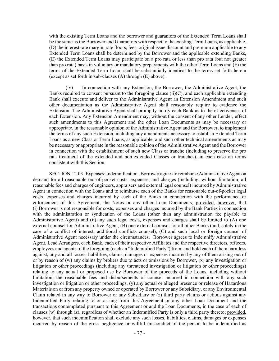 - 77 - with the existing Term Loans and the borrower and guarantors of the Extended Term Loans shall be the same as the Borrower and Guarantors with respect to the existing Term Loans, as applicable, (D) the interest rate margin, rate floors, fees, original issue discount and premium applicable to any Extended Term Loans shall be determined by the Borrower and the applicable extending Banks, (E) the Extended Term Loans may participate on a pro rata or less than pro rata (but not greater than pro rata) basis in voluntary or mandatory prepayments with the other Term Loans and (F) the terms of the Extended Term Loan, shall be substantially identical to the terms set forth herein (except as set forth in sub-clauses (A) through (E) above). (iv) In connection with any Extension, the Borrower, the Administrative Agent, the Banks required to consent pursuant to the foregoing clause (ii)(C), and each applicable extending Bank shall execute and deliver to the Administrative Agent an Extension Amendment and such other documentation as the Administrative Agent shall reasonably require to evidence the Extension. The Administrative Agent shall promptly notify each Bank as to the effectiveness of each Extension. Any Extension Amendment may, without the consent of any other Lender, effect such amendments to this Agreement and the other Loan Documents as may be necessary or appropriate, in the reasonable opinion of the Administrative Agent and the Borrower, to implement the terms of any such Extension, including any amendments necessary to establish Extended Term Loans as a new Class or Term Loans, as applicable, and such other technical amendments as may be necessary or appropriate in the reasonable opinion of the Administrative Agent and the Borrower in connection with the establishment of such new Class or tranche (including to preserve the pro rata treatment of the extended and non-extended Classes or tranches), in each case on terms consistent with this Section. SECTION 12.03. Expenses; Indemnification. Borrower agrees to reimburse Administrative Agent on demand for all reasonable out-of-pocket costs, expenses, and charges (including, without limitation, all reasonable fees and charges of engineers, appraisers and external legal counsel) incurred by Administrative Agent in connection with the Loans and to reimburse each of the Banks for reasonable out-of-pocket legal costs, expenses and charges incurred by each of the Banks in connection with the performance or enforcement of this Agreement, the Notes or any other Loan Documents; provided, however, that (i) Borrower is not responsible for costs, expenses and charges incurred by the Bank Parties in connection with the administration or syndication of the Loans (other than any administration fee payable to Administrative Agent) and (ii) any such legal costs, expenses and charges shall be limited to (A) one external counsel for Administrative Agent, (B) one external counsel for all other Banks (and, solely in the case of a conflict of interest, additional conflicts counsel), (C) and such local or foreign counsel of Administrative Agent necessary under the circumstances. Borrower agrees to indemnify Administrative Agent, Lead Arrangers, each Bank, each of their respective Affiliates and the respective directors, officers, employees and agents of the foregoing (each an “Indemnified Party”) from, and hold each of them harmless against, any and all losses, liabilities, claims, damages or expenses incurred by any of them arising out of or by reason of (w) any claims by brokers due to acts or omissions by Borrower, (x) any investigation or litigation or other proceedings (including any threatened investigation or litigation or other proceedings) relating to any actual or proposed use by Borrower of the proceeds of the Loans, including without limitation, the reasonable fees and disbursements of counsel incurred in connection with any such investigation or litigation or other proceedings, (y) any actual or alleged presence or release of Hazardous Materials on or from any property owned or operated by Borrower or any Subsidiary, or any Environmental Claim related in any way to Borrower or any Subsidiary or (z) third party claims or actions against any Indemnified Party relating to or arising from this Agreement or any other Loan Document and the transactions contemplated pursuant to this Agreement or and the Loan Documents, in the case of each of clauses (w) through (z), regardless of whether an Indemnified Party is only a third party thereto; provided, however, that such indemnification shall exclude any such losses, liabilities, claims, damages or expenses incurred by reason of the gross negligence or willful misconduct of the person to be indemnified as