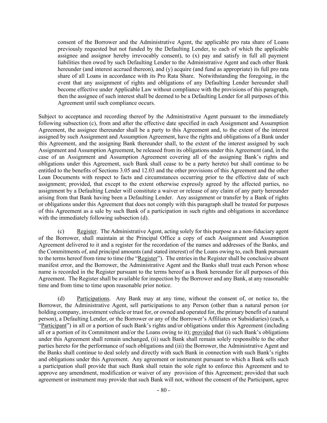- 80 - consent of the Borrower and the Administrative Agent, the applicable pro rata share of Loans previously requested but not funded by the Defaulting Lender, to each of which the applicable assignee and assignor hereby irrevocably consent), to (x) pay and satisfy in full all payment liabilities then owed by such Defaulting Lender to the Administrative Agent and each other Bank hereunder (and interest accrued thereon), and (y) acquire (and fund as appropriate) its full pro rata share of all Loans in accordance with its Pro Rata Share. Notwithstanding the foregoing, in the event that any assignment of rights and obligations of any Defaulting Lender hereunder shall become effective under Applicable Law without compliance with the provisions of this paragraph, then the assignee of such interest shall be deemed to be a Defaulting Lender for all purposes of this Agreement until such compliance occurs. Subject to acceptance and recording thereof by the Administrative Agent pursuant to the immediately following subsection (c), from and after the effective date specified in each Assignment and Assumption Agreement, the assignee thereunder shall be a party to this Agreement and, to the extent of the interest assigned by such Assignment and Assumption Agreement, have the rights and obligations of a Bank under this Agreement, and the assigning Bank thereunder shall, to the extent of the interest assigned by such Assignment and Assumption Agreement, be released from its obligations under this Agreement (and, in the case of an Assignment and Assumption Agreement covering all of the assigning Bank’s rights and obligations under this Agreement, such Bank shall cease to be a party hereto) but shall continue to be entitled to the benefits of Sections 3.05 and 12.03 and the other provisions of this Agreement and the other Loan Documents with respect to facts and circumstances occurring prior to the effective date of such assignment; provided, that except to the extent otherwise expressly agreed by the affected parties, no assignment by a Defaulting Lender will constitute a waiver or release of any claim of any party hereunder arising from that Bank having been a Defaulting Lender. Any assignment or transfer by a Bank of rights or obligations under this Agreement that does not comply with this paragraph shall be treated for purposes of this Agreement as a sale by such Bank of a participation in such rights and obligations in accordance with the immediately following subsection (d). (c) Register. The Administrative Agent, acting solely for this purpose as a non-fiduciary agent of the Borrower, shall maintain at the Principal Office a copy of each Assignment and Assumption Agreement delivered to it and a register for the recordation of the names and addresses of the Banks, and the Commitments of, and principal amounts (and stated interest) of the Loans owing to, each Bank pursuant to the terms hereof from time to time (the “Register”). The entries in the Register shall be conclusive absent manifest error, and the Borrower, the Administrative Agent and the Banks shall treat each Person whose name is recorded in the Register pursuant to the terms hereof as a Bank hereunder for all purposes of this Agreement. The Register shall be available for inspection by the Borrower and any Bank, at any reasonable time and from time to time upon reasonable prior notice. (d) Participations. Any Bank may at any time, without the consent of, or notice to, the Borrower, the Administrative Agent, sell participations to any Person (other than a natural person (or holding company, investment vehicle or trust for, or owned and operated for, the primary benefit of a natural person), a Defaulting Lender, or the Borrower or any of the Borrower’s Affiliates or Subsidiaries) (each, a “Participant”) in all or a portion of such Bank’s rights and/or obligations under this Agreement (including all or a portion of its Commitment and/or the Loans owing to it); provided that (i) such Bank’s obligations under this Agreement shall remain unchanged, (ii) such Bank shall remain solely responsible to the other parties hereto for the performance of such obligations and (iii) the Borrower, the Administrative Agent and the Banks shall continue to deal solely and directly with such Bank in connection with such Bank’s rights and obligations under this Agreement. Any agreement or instrument pursuant to which a Bank sells such a participation shall provide that such Bank shall retain the sole right to enforce this Agreement and to approve any amendment, modification or waiver of any provision of this Agreement; provided that such agreement or instrument may provide that such Bank will not, without the consent of the Participant, agree