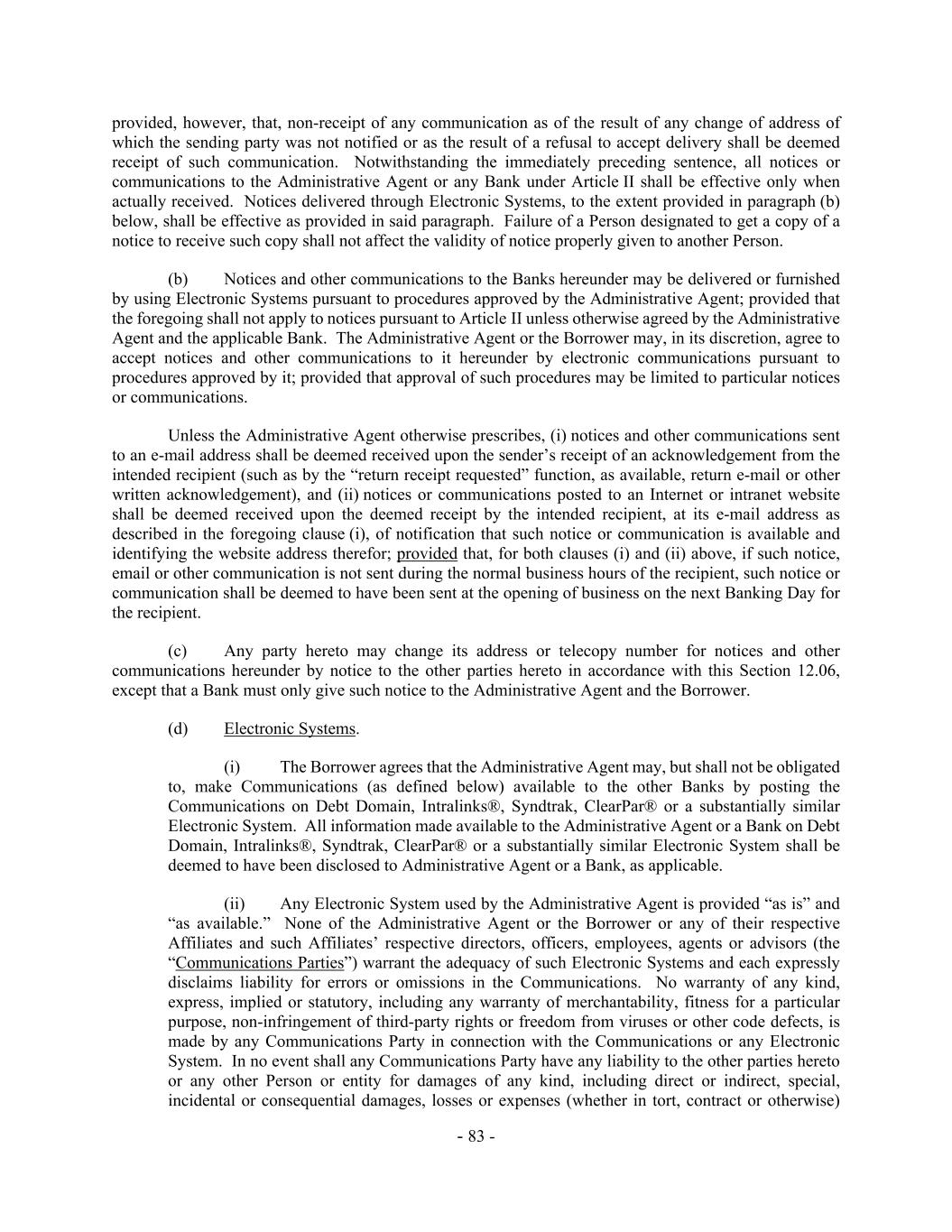 - 83 - provided, however, that, non-receipt of any communication as of the result of any change of address of which the sending party was not notified or as the result of a refusal to accept delivery shall be deemed receipt of such communication. Notwithstanding the immediately preceding sentence, all notices or communications to the Administrative Agent or any Bank under Article II shall be effective only when actually received. Notices delivered through Electronic Systems, to the extent provided in paragraph (b) below, shall be effective as provided in said paragraph. Failure of a Person designated to get a copy of a notice to receive such copy shall not affect the validity of notice properly given to another Person. (b) Notices and other communications to the Banks hereunder may be delivered or furnished by using Electronic Systems pursuant to procedures approved by the Administrative Agent; provided that the foregoing shall not apply to notices pursuant to Article II unless otherwise agreed by the Administrative Agent and the applicable Bank. The Administrative Agent or the Borrower may, in its discretion, agree to accept notices and other communications to it hereunder by electronic communications pursuant to procedures approved by it; provided that approval of such procedures may be limited to particular notices or communications. Unless the Administrative Agent otherwise prescribes, (i) notices and other communications sent to an e-mail address shall be deemed received upon the sender’s receipt of an acknowledgement from the intended recipient (such as by the “return receipt requested” function, as available, return e-mail or other written acknowledgement), and (ii) notices or communications posted to an Internet or intranet website shall be deemed received upon the deemed receipt by the intended recipient, at its e-mail address as described in the foregoing clause (i), of notification that such notice or communication is available and identifying the website address therefor; provided that, for both clauses (i) and (ii) above, if such notice, email or other communication is not sent during the normal business hours of the recipient, such notice or communication shall be deemed to have been sent at the opening of business on the next Banking Day for the recipient. (c) Any party hereto may change its address or telecopy number for notices and other communications hereunder by notice to the other parties hereto in accordance with this Section 12.06, except that a Bank must only give such notice to the Administrative Agent and the Borrower. (d) Electronic Systems. (i) The Borrower agrees that the Administrative Agent may, but shall not be obligated to, make Communications (as defined below) available to the other Banks by posting the Communications on Debt Domain, Intralinks®, Syndtrak, ClearPar® or a substantially similar Electronic System. All information made available to the Administrative Agent or a Bank on Debt Domain, Intralinks®, Syndtrak, ClearPar® or a substantially similar Electronic System shall be deemed to have been disclosed to Administrative Agent or a Bank, as applicable. (ii) Any Electronic System used by the Administrative Agent is provided “as is” and “as available.” None of the Administrative Agent or the Borrower or any of their respective Affiliates and such Affiliates’ respective directors, officers, employees, agents or advisors (the “Communications Parties”) warrant the adequacy of such Electronic Systems and each expressly disclaims liability for errors or omissions in the Communications. No warranty of any kind, express, implied or statutory, including any warranty of merchantability, fitness for a particular purpose, non-infringement of third-party rights or freedom from viruses or other code defects, is made by any Communications Party in connection with the Communications or any Electronic System. In no event shall any Communications Party have any liability to the other parties hereto or any other Person or entity for damages of any kind, including direct or indirect, special, incidental or consequential damages, losses or expenses (whether in tort, contract or otherwise)