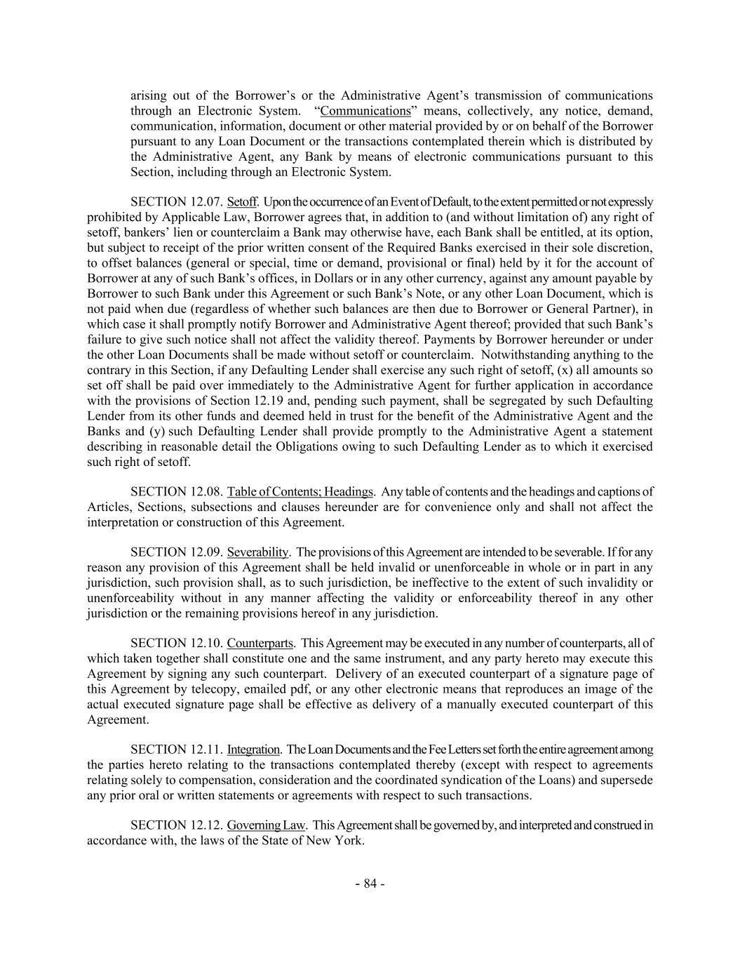 - 84 - arising out of the Borrower’s or the Administrative Agent’s transmission of communications through an Electronic System. “Communications” means, collectively, any notice, demand, communication, information, document or other material provided by or on behalf of the Borrower pursuant to any Loan Document or the transactions contemplated therein which is distributed by the Administrative Agent, any Bank by means of electronic communications pursuant to this Section, including through an Electronic System. SECTION 12.07. Setoff. Upon the occurrence of an Event of Default, to the extent permitted or not expressly prohibited by Applicable Law, Borrower agrees that, in addition to (and without limitation of) any right of setoff, bankers’ lien or counterclaim a Bank may otherwise have, each Bank shall be entitled, at its option, but subject to receipt of the prior written consent of the Required Banks exercised in their sole discretion, to offset balances (general or special, time or demand, provisional or final) held by it for the account of Borrower at any of such Bank’s offices, in Dollars or in any other currency, against any amount payable by Borrower to such Bank under this Agreement or such Bank’s Note, or any other Loan Document, which is not paid when due (regardless of whether such balances are then due to Borrower or General Partner), in which case it shall promptly notify Borrower and Administrative Agent thereof; provided that such Bank’s failure to give such notice shall not affect the validity thereof. Payments by Borrower hereunder or under the other Loan Documents shall be made without setoff or counterclaim. Notwithstanding anything to the contrary in this Section, if any Defaulting Lender shall exercise any such right of setoff, (x) all amounts so set off shall be paid over immediately to the Administrative Agent for further application in accordance with the provisions of Section 12.19 and, pending such payment, shall be segregated by such Defaulting Lender from its other funds and deemed held in trust for the benefit of the Administrative Agent and the Banks and (y) such Defaulting Lender shall provide promptly to the Administrative Agent a statement describing in reasonable detail the Obligations owing to such Defaulting Lender as to which it exercised such right of setoff. SECTION 12.08. Table of Contents; Headings. Any table of contents and the headings and captions of Articles, Sections, subsections and clauses hereunder are for convenience only and shall not affect the interpretation or construction of this Agreement. SECTION 12.09. Severability. The provisions of this Agreement are intended to be severable. If for any reason any provision of this Agreement shall be held invalid or unenforceable in whole or in part in any jurisdiction, such provision shall, as to such jurisdiction, be ineffective to the extent of such invalidity or unenforceability without in any manner affecting the validity or enforceability thereof in any other jurisdiction or the remaining provisions hereof in any jurisdiction. SECTION 12.10. Counterparts. This Agreement may be executed in any number of counterparts, all of which taken together shall constitute one and the same instrument, and any party hereto may execute this Agreement by signing any such counterpart. Delivery of an executed counterpart of a signature page of this Agreement by telecopy, emailed pdf, or any other electronic means that reproduces an image of the actual executed signature page shall be effective as delivery of a manually executed counterpart of this Agreement. SECTION 12.11. Integration. The Loan Documents and the Fee Letters set forth the entire agreement among the parties hereto relating to the transactions contemplated thereby (except with respect to agreements relating solely to compensation, consideration and the coordinated syndication of the Loans) and supersede any prior oral or written statements or agreements with respect to such transactions. SECTION 12.12. Governing Law. This Agreement shall be governed by, and interpreted and construed in accordance with, the laws of the State of New York.