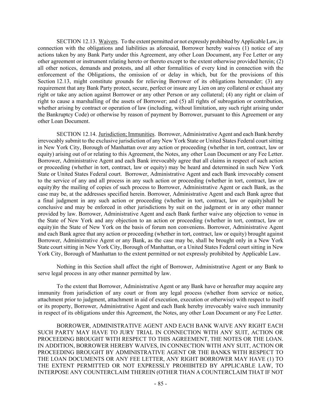 - 85 - SECTION 12.13. Waivers. To the extent permitted or not expressly prohibited by Applicable Law, in connection with the obligations and liabilities as aforesaid, Borrower hereby waives (1) notice of any actions taken by any Bank Party under this Agreement, any other Loan Document, any Fee Letter or any other agreement or instrument relating hereto or thereto except to the extent otherwise provided herein; (2) all other notices, demands and protests, and all other formalities of every kind in connection with the enforcement of the Obligations, the omission of or delay in which, but for the provisions of this Section 12.13, might constitute grounds for relieving Borrower of its obligations hereunder; (3) any requirement that any Bank Party protect, secure, perfect or insure any Lien on any collateral or exhaust any right or take any action against Borrower or any other Person or any collateral; (4) any right or claim of right to cause a marshalling of the assets of Borrower; and (5) all rights of subrogation or contribution, whether arising by contract or operation of law (including, without limitation, any such right arising under the Bankruptcy Code) or otherwise by reason of payment by Borrower, pursuant to this Agreement or any other Loan Document. SECTION 12.14. Jurisdiction; Immunities. Borrower, Administrative Agent and each Bank hereby irrevocably submit to the exclusive jurisdiction of any New York State or United States Federal court sitting in New York City, Borough of Manhattan over any action or proceeding (whether in tort, contract, law or equity) arising out of or relating to this Agreement, the Notes, any other Loan Document or any Fee Letter. Borrower, Administrative Agent and each Bank irrevocably agree that all claims in respect of such action or proceeding (whether in tort, contract, law or equity) may be heard and determined in such New York State or United States Federal court. Borrower, Administrative Agent and each Bank irrevocably consent to the service of any and all process in any such action or proceeding (whether in tort, contract, law or equity)by the mailing of copies of such process to Borrower, Administrative Agent or each Bank, as the case may be, at the addresses specified herein. Borrower, Administrative Agent and each Bank agree that a final judgment in any such action or proceeding (whether in tort, contract, law or equity)shall be conclusive and may be enforced in other jurisdictions by suit on the judgment or in any other manner provided by law. Borrower, Administrative Agent and each Bank further waive any objection to venue in the State of New York and any objection to an action or proceeding (whether in tort, contract, law or equity)in the State of New York on the basis of forum non conveniens. Borrower, Administrative Agent and each Bank agree that any action or proceeding (whether in tort, contract, law or equity) brought against Borrower, Administrative Agent or any Bank, as the case may be, shall be brought only in a New York State court sitting in New York City, Borough of Manhattan, or a United States Federal court sitting in New York City, Borough of Manhattan to the extent permitted or not expressly prohibited by Applicable Law. Nothing in this Section shall affect the right of Borrower, Administrative Agent or any Bank to serve legal process in any other manner permitted by law. To the extent that Borrower, Administrative Agent or any Bank have or hereafter may acquire any immunity from jurisdiction of any court or from any legal process (whether from service or notice, attachment prior to judgment, attachment in aid of execution, execution or otherwise) with respect to itself or its property, Borrower, Administrative Agent and each Bank hereby irrevocably waive such immunity in respect of its obligations under this Agreement, the Notes, any other Loan Document or any Fee Letter. BORROWER, ADMINISTRATIVE AGENT AND EACH BANK WAIVE ANY RIGHT EACH SUCH PARTY MAY HAVE TO JURY TRIAL IN CONNECTION WITH ANY SUIT, ACTION OR PROCEEDING BROUGHT WITH RESPECT TO THIS AGREEMENT, THE NOTES OR THE LOAN. IN ADDITION, BORROWER HEREBY WAIVES, IN CONNECTION WITH ANY SUIT, ACTION OR PROCEEDING BROUGHT BY ADMINISTRATIVE AGENT OR THE BANKS WITH RESPECT TO THE LOAN DOCUMENTS OR ANY FEE LETTER, ANY RIGHT BORROWER MAY HAVE (1) TO THE EXTENT PERMITTED OR NOT EXPRESSLY PROHIBITED BY APPLICABLE LAW, TO INTERPOSE ANY COUNTERCLAIM THEREIN (OTHER THAN A COUNTERCLAIM THAT IF NOT