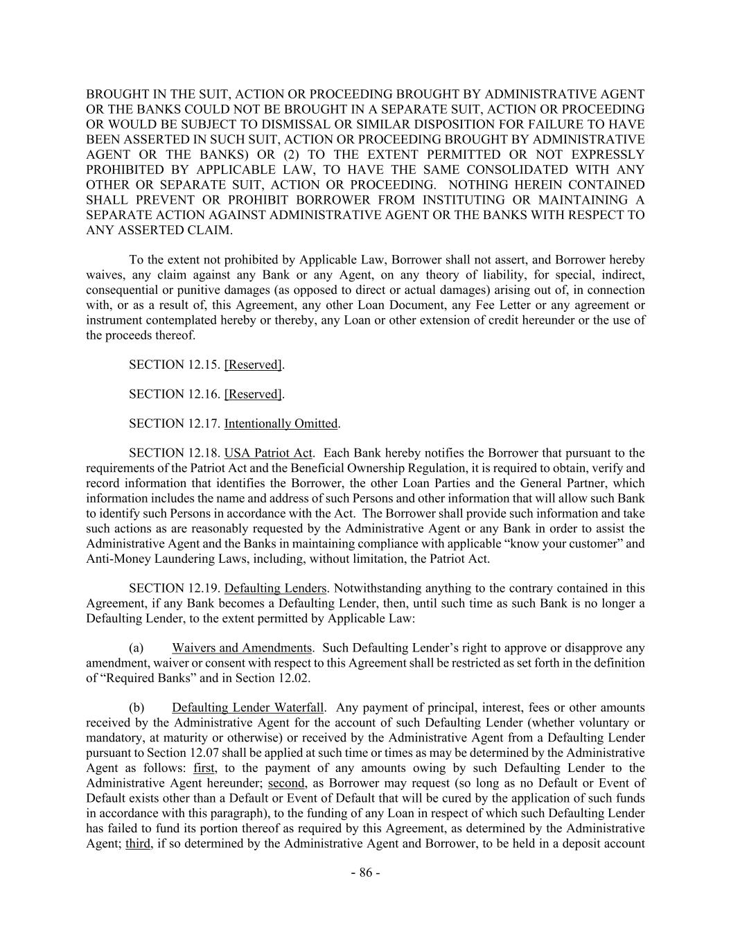 - 86 - BROUGHT IN THE SUIT, ACTION OR PROCEEDING BROUGHT BY ADMINISTRATIVE AGENT OR THE BANKS COULD NOT BE BROUGHT IN A SEPARATE SUIT, ACTION OR PROCEEDING OR WOULD BE SUBJECT TO DISMISSAL OR SIMILAR DISPOSITION FOR FAILURE TO HAVE BEEN ASSERTED IN SUCH SUIT, ACTION OR PROCEEDING BROUGHT BY ADMINISTRATIVE AGENT OR THE BANKS) OR (2) TO THE EXTENT PERMITTED OR NOT EXPRESSLY PROHIBITED BY APPLICABLE LAW, TO HAVE THE SAME CONSOLIDATED WITH ANY OTHER OR SEPARATE SUIT, ACTION OR PROCEEDING. NOTHING HEREIN CONTAINED SHALL PREVENT OR PROHIBIT BORROWER FROM INSTITUTING OR MAINTAINING A SEPARATE ACTION AGAINST ADMINISTRATIVE AGENT OR THE BANKS WITH RESPECT TO ANY ASSERTED CLAIM. To the extent not prohibited by Applicable Law, Borrower shall not assert, and Borrower hereby waives, any claim against any Bank or any Agent, on any theory of liability, for special, indirect, consequential or punitive damages (as opposed to direct or actual damages) arising out of, in connection with, or as a result of, this Agreement, any other Loan Document, any Fee Letter or any agreement or instrument contemplated hereby or thereby, any Loan or other extension of credit hereunder or the use of the proceeds thereof. SECTION 12.15. [Reserved]. SECTION 12.16. [Reserved]. SECTION 12.17. Intentionally Omitted. SECTION 12.18. USA Patriot Act. Each Bank hereby notifies the Borrower that pursuant to the requirements of the Patriot Act and the Beneficial Ownership Regulation, it is required to obtain, verify and record information that identifies the Borrower, the other Loan Parties and the General Partner, which information includes the name and address of such Persons and other information that will allow such Bank to identify such Persons in accordance with the Act. The Borrower shall provide such information and take such actions as are reasonably requested by the Administrative Agent or any Bank in order to assist the Administrative Agent and the Banks in maintaining compliance with applicable “know your customer” and Anti-Money Laundering Laws, including, without limitation, the Patriot Act. SECTION 12.19. Defaulting Lenders. Notwithstanding anything to the contrary contained in this Agreement, if any Bank becomes a Defaulting Lender, then, until such time as such Bank is no longer a Defaulting Lender, to the extent permitted by Applicable Law: (a) Waivers and Amendments. Such Defaulting Lender’s right to approve or disapprove any amendment, waiver or consent with respect to this Agreement shall be restricted as set forth in the definition of “Required Banks” and in Section 12.02. (b) Defaulting Lender Waterfall. Any payment of principal, interest, fees or other amounts received by the Administrative Agent for the account of such Defaulting Lender (whether voluntary or mandatory, at maturity or otherwise) or received by the Administrative Agent from a Defaulting Lender pursuant to Section 12.07 shall be applied at such time or times as may be determined by the Administrative Agent as follows: first, to the payment of any amounts owing by such Defaulting Lender to the Administrative Agent hereunder; second, as Borrower may request (so long as no Default or Event of Default exists other than a Default or Event of Default that will be cured by the application of such funds in accordance with this paragraph), to the funding of any Loan in respect of which such Defaulting Lender has failed to fund its portion thereof as required by this Agreement, as determined by the Administrative Agent; third, if so determined by the Administrative Agent and Borrower, to be held in a deposit account
