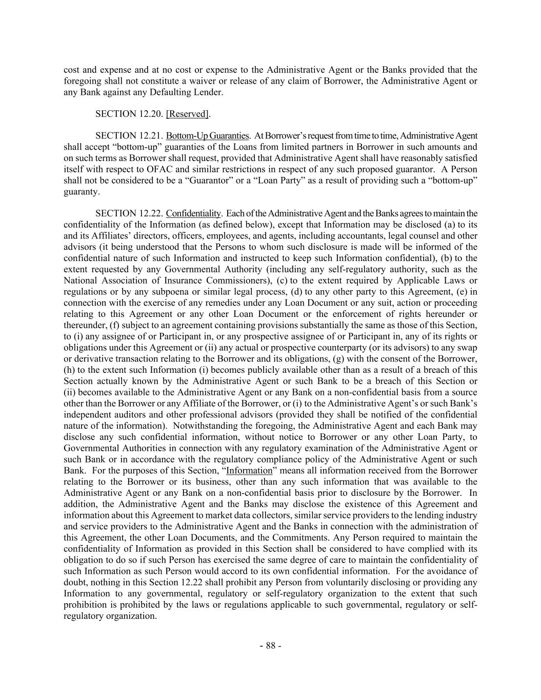 - 88 - cost and expense and at no cost or expense to the Administrative Agent or the Banks provided that the foregoing shall not constitute a waiver or release of any claim of Borrower, the Administrative Agent or any Bank against any Defaulting Lender. SECTION 12.20. [Reserved]. SECTION 12.21. Bottom-Up Guaranties. At Borrower’s request from time to time, Administrative Agent shall accept “bottom-up” guaranties of the Loans from limited partners in Borrower in such amounts and on such terms as Borrower shall request, provided that Administrative Agent shall have reasonably satisfied itself with respect to OFAC and similar restrictions in respect of any such proposed guarantor. A Person shall not be considered to be a “Guarantor” or a “Loan Party” as a result of providing such a “bottom-up” guaranty. SECTION 12.22. Confidentiality. Each of the Administrative Agent and the Banks agrees to maintain the confidentiality of the Information (as defined below), except that Information may be disclosed (a) to its and its Affiliates’ directors, officers, employees, and agents, including accountants, legal counsel and other advisors (it being understood that the Persons to whom such disclosure is made will be informed of the confidential nature of such Information and instructed to keep such Information confidential), (b) to the extent requested by any Governmental Authority (including any self-regulatory authority, such as the National Association of Insurance Commissioners), (c) to the extent required by Applicable Laws or regulations or by any subpoena or similar legal process, (d) to any other party to this Agreement, (e) in connection with the exercise of any remedies under any Loan Document or any suit, action or proceeding relating to this Agreement or any other Loan Document or the enforcement of rights hereunder or thereunder, (f) subject to an agreement containing provisions substantially the same as those of this Section, to (i) any assignee of or Participant in, or any prospective assignee of or Participant in, any of its rights or obligations under this Agreement or (ii) any actual or prospective counterparty (or its advisors) to any swap or derivative transaction relating to the Borrower and its obligations, (g) with the consent of the Borrower, (h) to the extent such Information (i) becomes publicly available other than as a result of a breach of this Section actually known by the Administrative Agent or such Bank to be a breach of this Section or (ii) becomes available to the Administrative Agent or any Bank on a non-confidential basis from a source other than the Borrower or any Affiliate of the Borrower, or (i) to the Administrative Agent’s or such Bank’s independent auditors and other professional advisors (provided they shall be notified of the confidential nature of the information). Notwithstanding the foregoing, the Administrative Agent and each Bank may disclose any such confidential information, without notice to Borrower or any other Loan Party, to Governmental Authorities in connection with any regulatory examination of the Administrative Agent or such Bank or in accordance with the regulatory compliance policy of the Administrative Agent or such Bank. For the purposes of this Section, “Information” means all information received from the Borrower relating to the Borrower or its business, other than any such information that was available to the Administrative Agent or any Bank on a non-confidential basis prior to disclosure by the Borrower. In addition, the Administrative Agent and the Banks may disclose the existence of this Agreement and information about this Agreement to market data collectors, similar service providers to the lending industry and service providers to the Administrative Agent and the Banks in connection with the administration of this Agreement, the other Loan Documents, and the Commitments. Any Person required to maintain the confidentiality of Information as provided in this Section shall be considered to have complied with its obligation to do so if such Person has exercised the same degree of care to maintain the confidentiality of such Information as such Person would accord to its own confidential information. For the avoidance of doubt, nothing in this Section 12.22 shall prohibit any Person from voluntarily disclosing or providing any Information to any governmental, regulatory or self-regulatory organization to the extent that such prohibition is prohibited by the laws or regulations applicable to such governmental, regulatory or self- regulatory organization.
