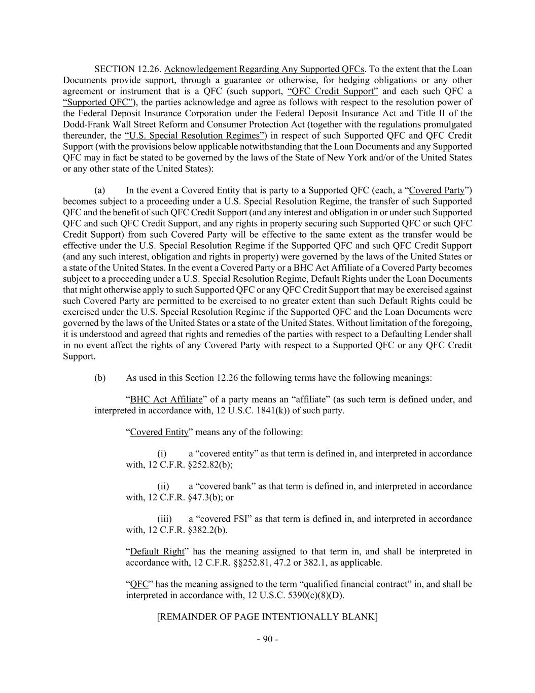 - 90 - SECTION 12.26. Acknowledgement Regarding Any Supported QFCs. To the extent that the Loan Documents provide support, through a guarantee or otherwise, for hedging obligations or any other agreement or instrument that is a QFC (such support, “QFC Credit Support” and each such QFC a “Supported QFC”), the parties acknowledge and agree as follows with respect to the resolution power of the Federal Deposit Insurance Corporation under the Federal Deposit Insurance Act and Title II of the Dodd-Frank Wall Street Reform and Consumer Protection Act (together with the regulations promulgated thereunder, the “U.S. Special Resolution Regimes”) in respect of such Supported QFC and QFC Credit Support (with the provisions below applicable notwithstanding that the Loan Documents and any Supported QFC may in fact be stated to be governed by the laws of the State of New York and/or of the United States or any other state of the United States): (a) In the event a Covered Entity that is party to a Supported QFC (each, a “Covered Party”) becomes subject to a proceeding under a U.S. Special Resolution Regime, the transfer of such Supported QFC and the benefit of such QFC Credit Support (and any interest and obligation in or under such Supported QFC and such QFC Credit Support, and any rights in property securing such Supported QFC or such QFC Credit Support) from such Covered Party will be effective to the same extent as the transfer would be effective under the U.S. Special Resolution Regime if the Supported QFC and such QFC Credit Support (and any such interest, obligation and rights in property) were governed by the laws of the United States or a state of the United States. In the event a Covered Party or a BHC Act Affiliate of a Covered Party becomes subject to a proceeding under a U.S. Special Resolution Regime, Default Rights under the Loan Documents that might otherwise apply to such Supported QFC or any QFC Credit Support that may be exercised against such Covered Party are permitted to be exercised to no greater extent than such Default Rights could be exercised under the U.S. Special Resolution Regime if the Supported QFC and the Loan Documents were governed by the laws of the United States or a state of the United States. Without limitation of the foregoing, it is understood and agreed that rights and remedies of the parties with respect to a Defaulting Lender shall in no event affect the rights of any Covered Party with respect to a Supported QFC or any QFC Credit Support. (b) As used in this Section 12.26 the following terms have the following meanings: “BHC Act Affiliate” of a party means an “affiliate” (as such term is defined under, and interpreted in accordance with, 12 U.S.C. 1841(k)) of such party. “Covered Entity” means any of the following: (i) a “covered entity” as that term is defined in, and interpreted in accordance with, 12 C.F.R. §252.82(b); (ii) a “covered bank” as that term is defined in, and interpreted in accordance with, 12 C.F.R. §47.3(b); or (iii) a “covered FSI” as that term is defined in, and interpreted in accordance with, 12 C.F.R. §382.2(b). “Default Right” has the meaning assigned to that term in, and shall be interpreted in accordance with, 12 C.F.R. §§252.81, 47.2 or 382.1, as applicable. “QFC” has the meaning assigned to the term “qualified financial contract” in, and shall be interpreted in accordance with, 12 U.S.C. 5390(c)(8)(D). [REMAINDER OF PAGE INTENTIONALLY BLANK]