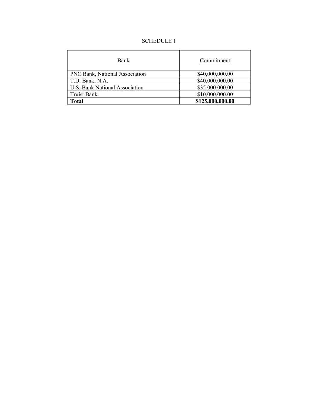 SCHEDULE 1 Bank Commitment PNC Bank, National Association $40,000,000.00 T.D. Bank, N.A. $40,000,000.00 U.S. Bank National Association $35,000,000.00 Truist Bank $10,000,000.00 Total $125,000,000.00