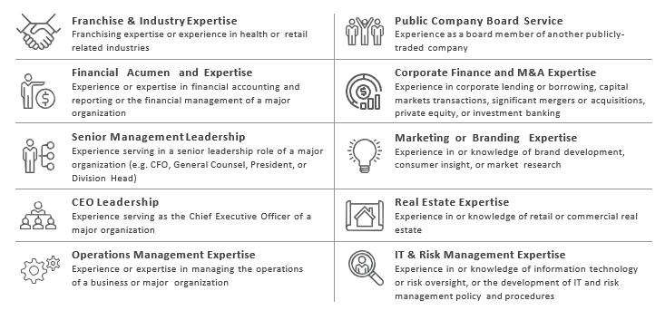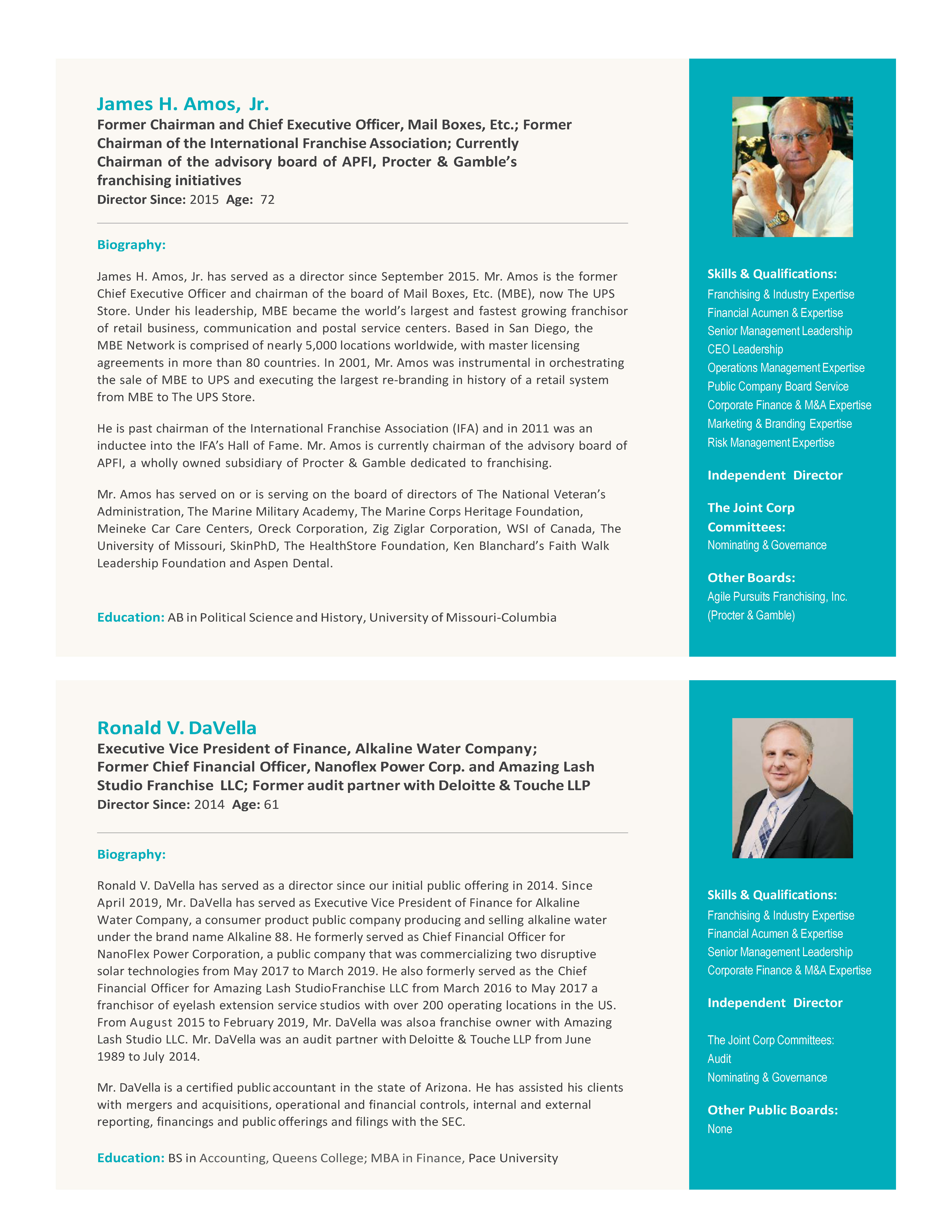 | James H. Amos, Jr. | 73 | 2015 | Current Chairman of the advisory board of APFI, Procter and Gamble’s franchising initiatives; former Chairman and Chief Executive Officer of Mail Boxes, Etc.; former Chairman of the International Franchise Association
