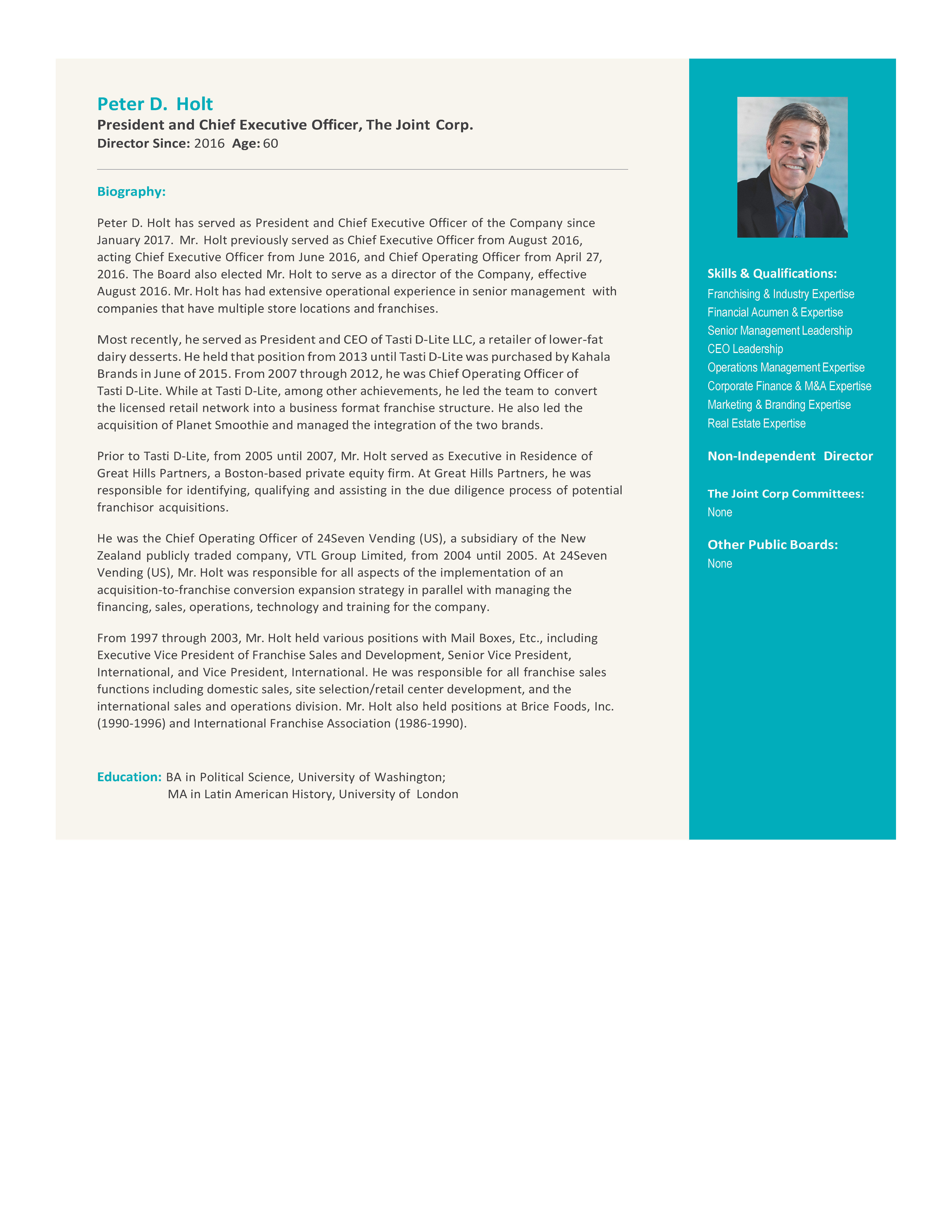 | Peter D. Holt | 60 | 2016 | President and Chief Executive Officer, The Joint Corp.
