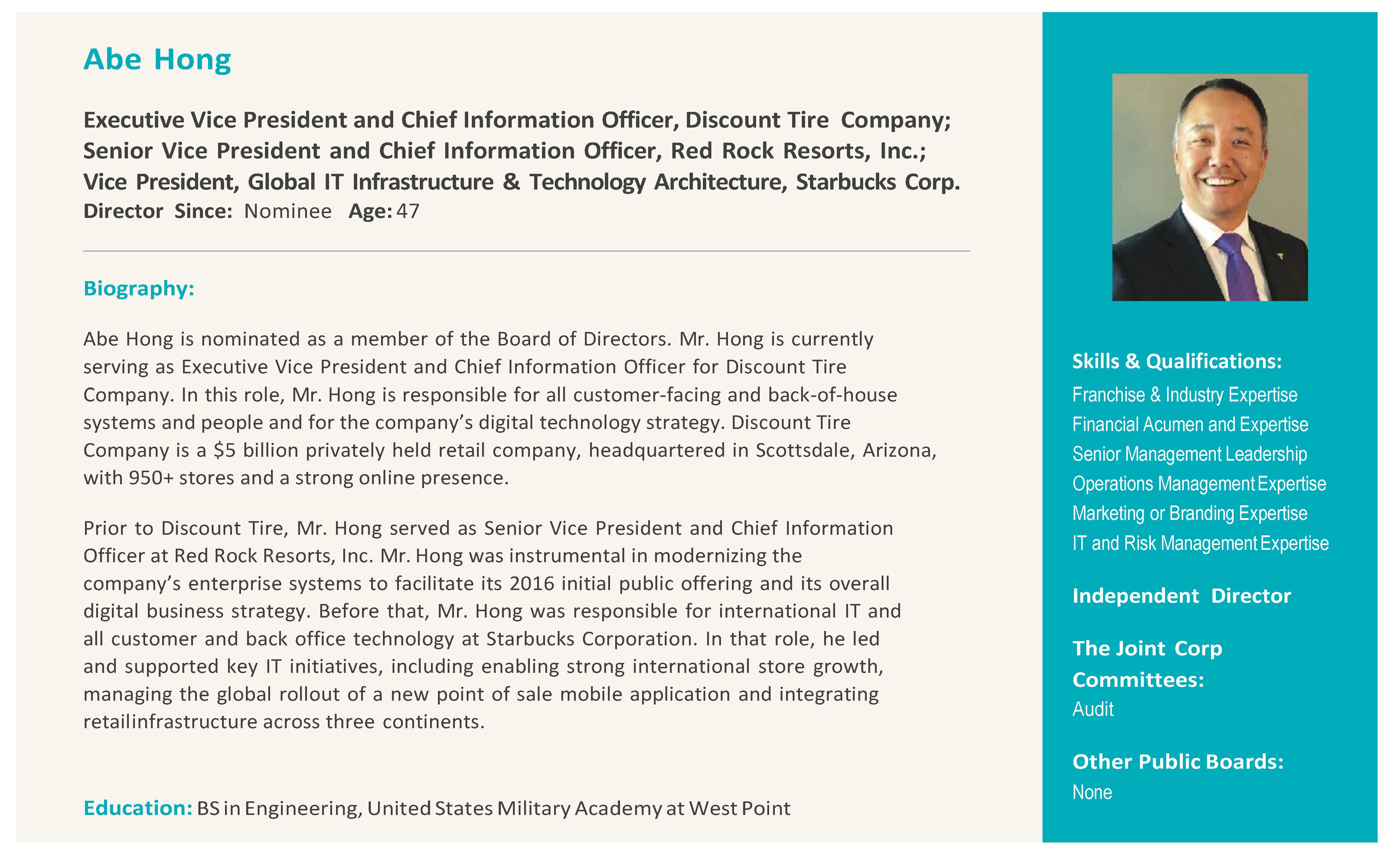 | Abe Hong | 47 | 2018 | Executive Vice President & Chief Information Officer at Discount Tire Company