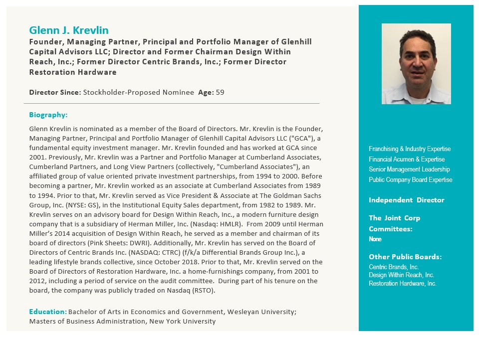 | Glenn J. Krevlin | 59 | — | Former Founder, Managing Partner, Principal and Portfolio Manager of Glenhill Capital Advisors LLC