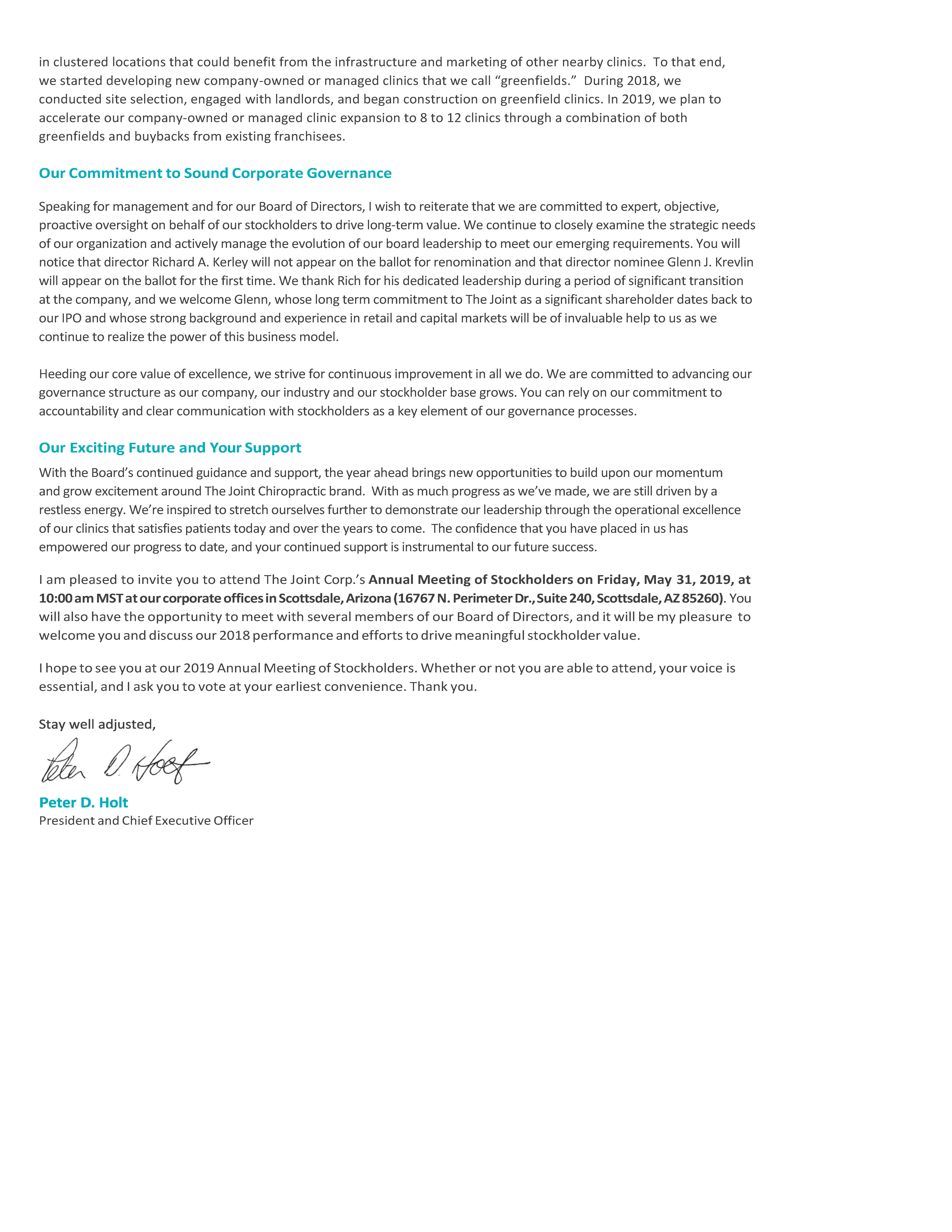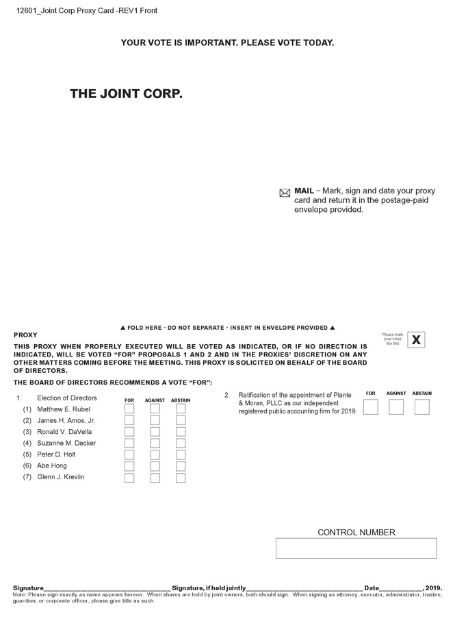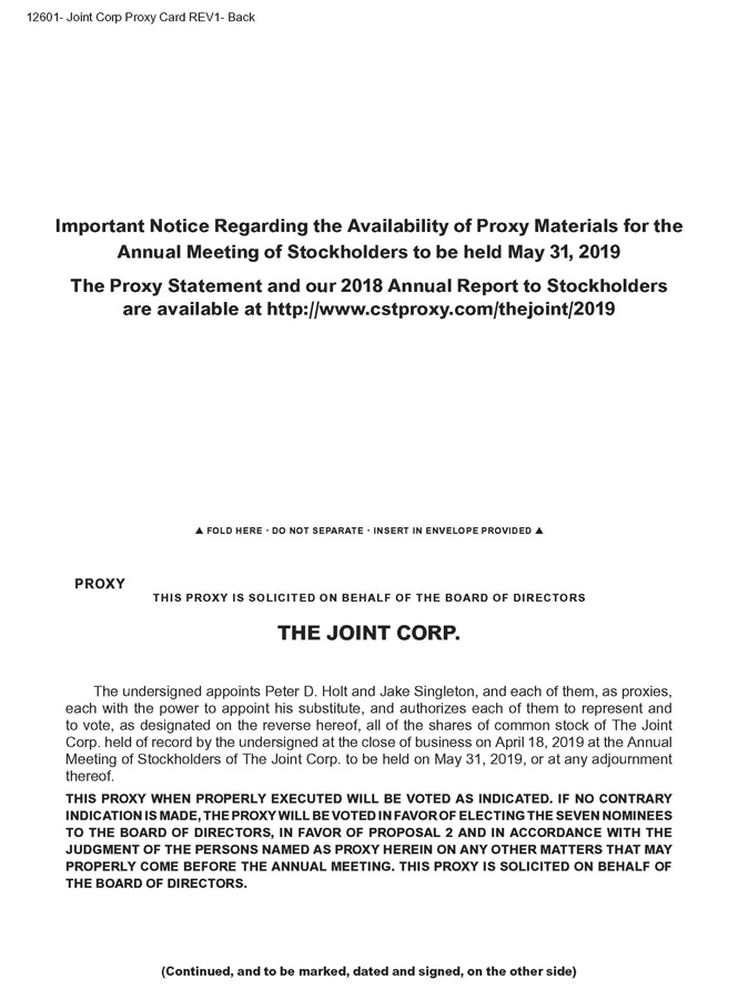 The Board of Directors of The Joint Corp. is soliciting proxies to vote shares of our stock at the 2019 Annual Meeting of Stockholders (the “Annual Meeting”) to be held on Friday, May 31, 2019 at 10:00 a.m. Mountain Standard Time at our executive offices located at 16767 N. Perimeter Drive, Suite 240, Scottsdale, Arizona 85260.