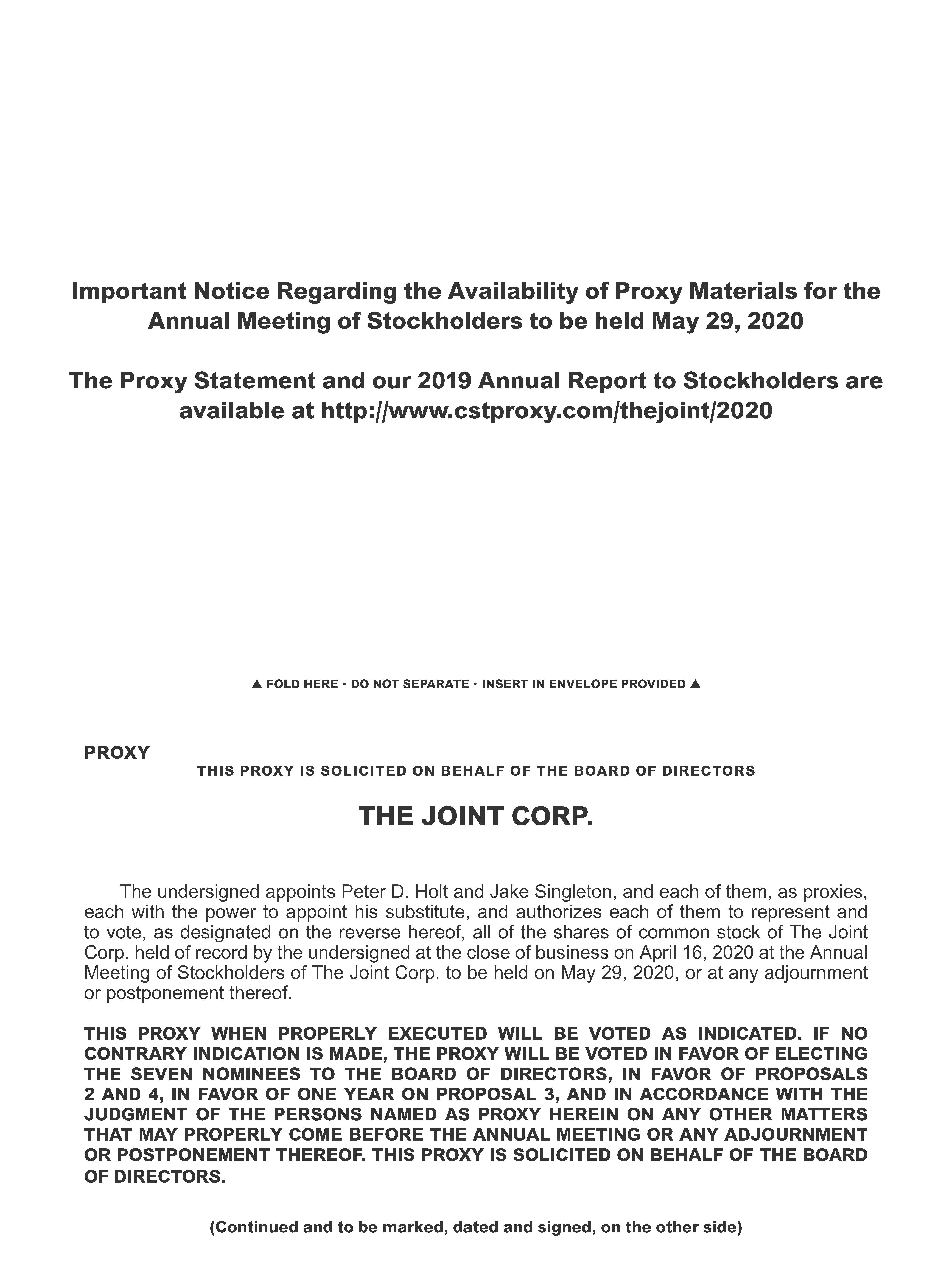 After much deliberation, the Board of the Company has decided to still hold our annual meeting as scheduled at our corporate offices in Scottsdale, Arizona. However, in light of the serious nature and health risks from the spread of COVID-19 in larger gatherings, we are taking the unusual step of asking that you seriously consider not attending the annual meeting. Therefore, we ask that you promptly return your proxy or vote electronically as described in the proxy materials provided to you. For the convenience of our stockholders of record who do not plan to attend the Annual Meeting in person, but who want their shares voted, we have enclosed a proxy card. If you do not plan to attend the Annual Meeting, please complete and return the proxy card in the envelope provided, or go to www.cstproxy.com/thejoint/2020 and follow the instructions. If you return your proxy card and later decide to attend the Annual Meeting in person, or if for any other reason you want to revoke your proxy, you may do so at any time before your proxy is voted. If you hold your shares through a broker, bank, or other nominee, please see the instructions in the General Information section on how to vote your shares, either by written instruction or in person at the meeting. Please read carefully the enclosed information and our 2019 Annual Report, which includes our Form 10-K for the year ended December 31, 2019, before voting your proxy.