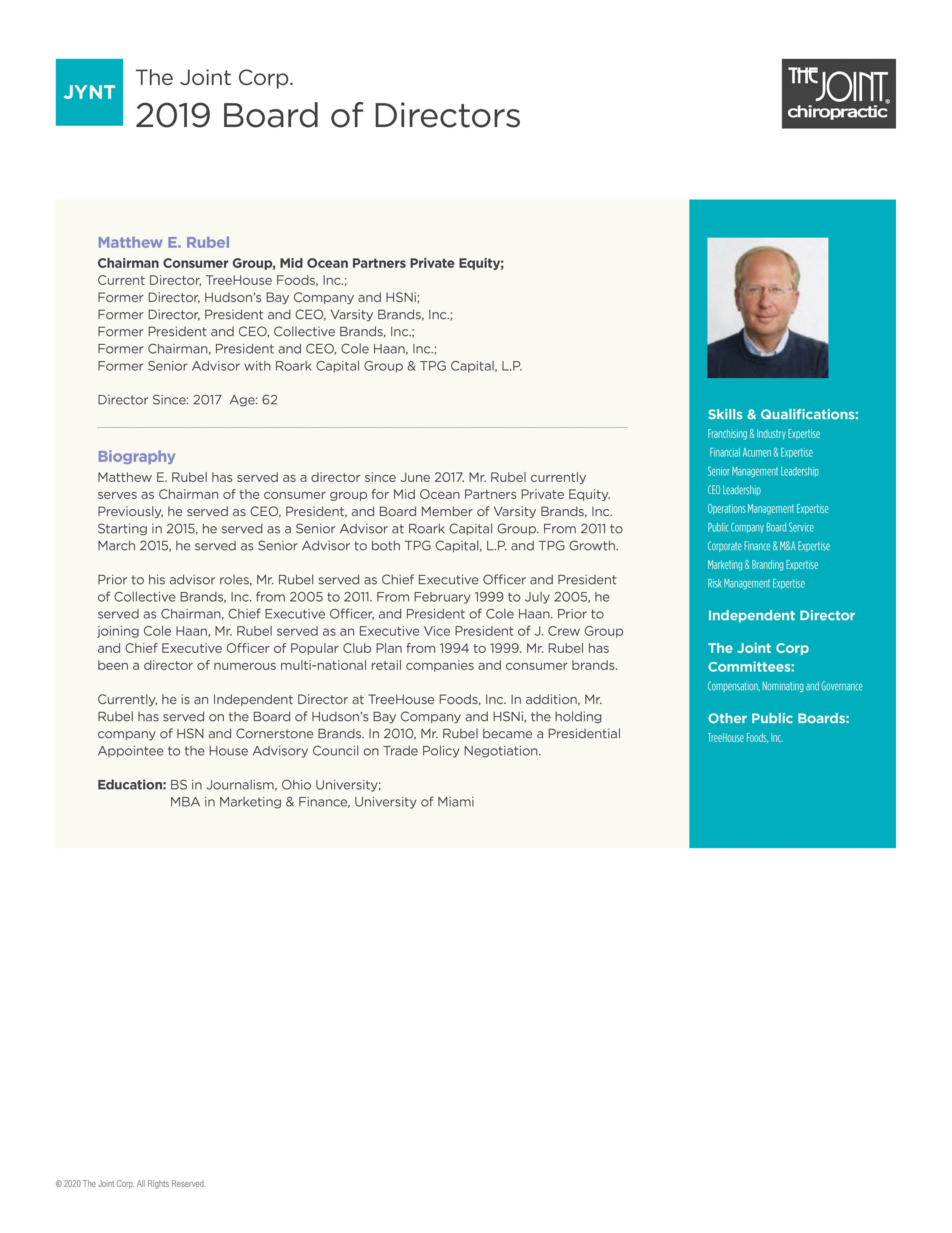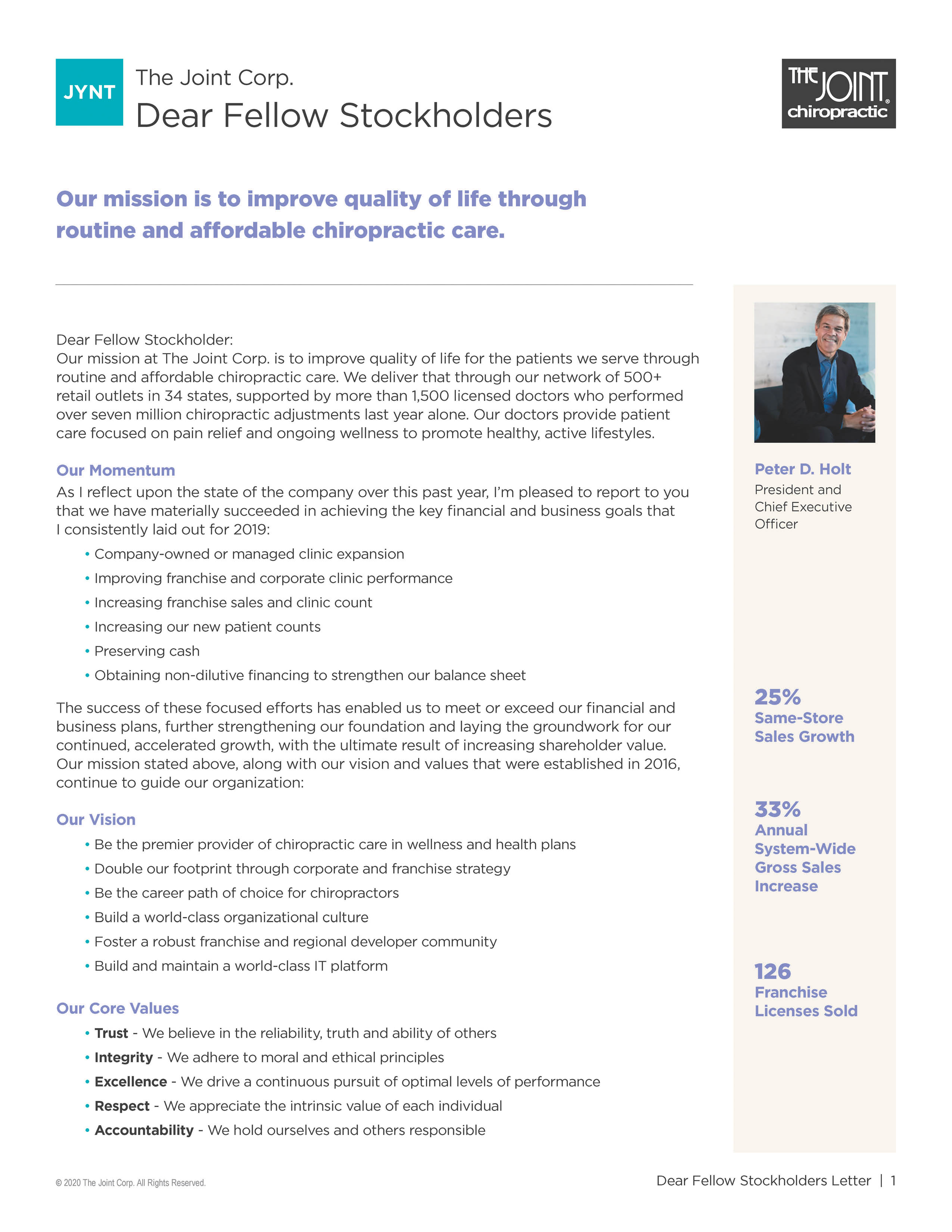 Dear Fellow Stockholder: Our mission at The Joint Corp. is to improve quality of life for the patients we serve through routine and affordable chiropractic care. We deliver that through our network of 500+ retail outlets in 34 states, supported by more than 1,500 licensed doctors who performed over seven million chiropractic adjustments last year alone. Our doctors provide patient care focused on pain relief and ongoing wellness to promote healthy, active lifestyles. Our Momentum As I reflect upon the state of the company over this past year, I’m pleased to report to you that we have materially succeeded in achieving the key financial and business goals that I consistently laid out for 2019: • Company - owned or managed clinic expansion • Improving franchise and corporate clinic performance • Increasing franchise sales and clinic count • Increasing our new patient counts • Preserving cash • Obtaining non - dilutive financing to strengthen our balance sheet The success of these focused efforts has enabled us to meet or exceed our financial and business plans, further strengthening our foundation and laying the groundwork for our continued, accelerated growth, with the ultimate result of increasing shareholder value. Our mission stated above, along with our vision and values that were established in 2016, continue to guide our organization: Our Vision • Be the premier provider of chiropractic care in wellness and health plans • Double our footprint through corporate and franchise strategy • Be the career path of choice for chiropractors • Build a world - class organizational culture • Foster a robust franchise and regional developer community • Build and maintain a world - class IT platform Our Core Values • Trust - We believe in the reliability, truth and ability of others • Integrity - We adhere to moral and ethical principles • Excellence - We drive a continuous pursuit of optimal levels of performance • Respect - We appreciate the intrinsic value of each individual • Accountability - We hold ourselves and others responsible Our mission is to improve quality of life through routine and affordable chiropractic care. The Joint Corp. Dear Fellow Stockholders JYNT Peter D. Holt President and Chief Executive Officer 25% Same - Store Sales Growth 33% Annual S y s t em - W ide Gross Sales Increase 126 Franchise Licenses Sold Dear Fellow Stockholders Letter | 1 © 2020 The Joint Corp. All Rights Reserved.