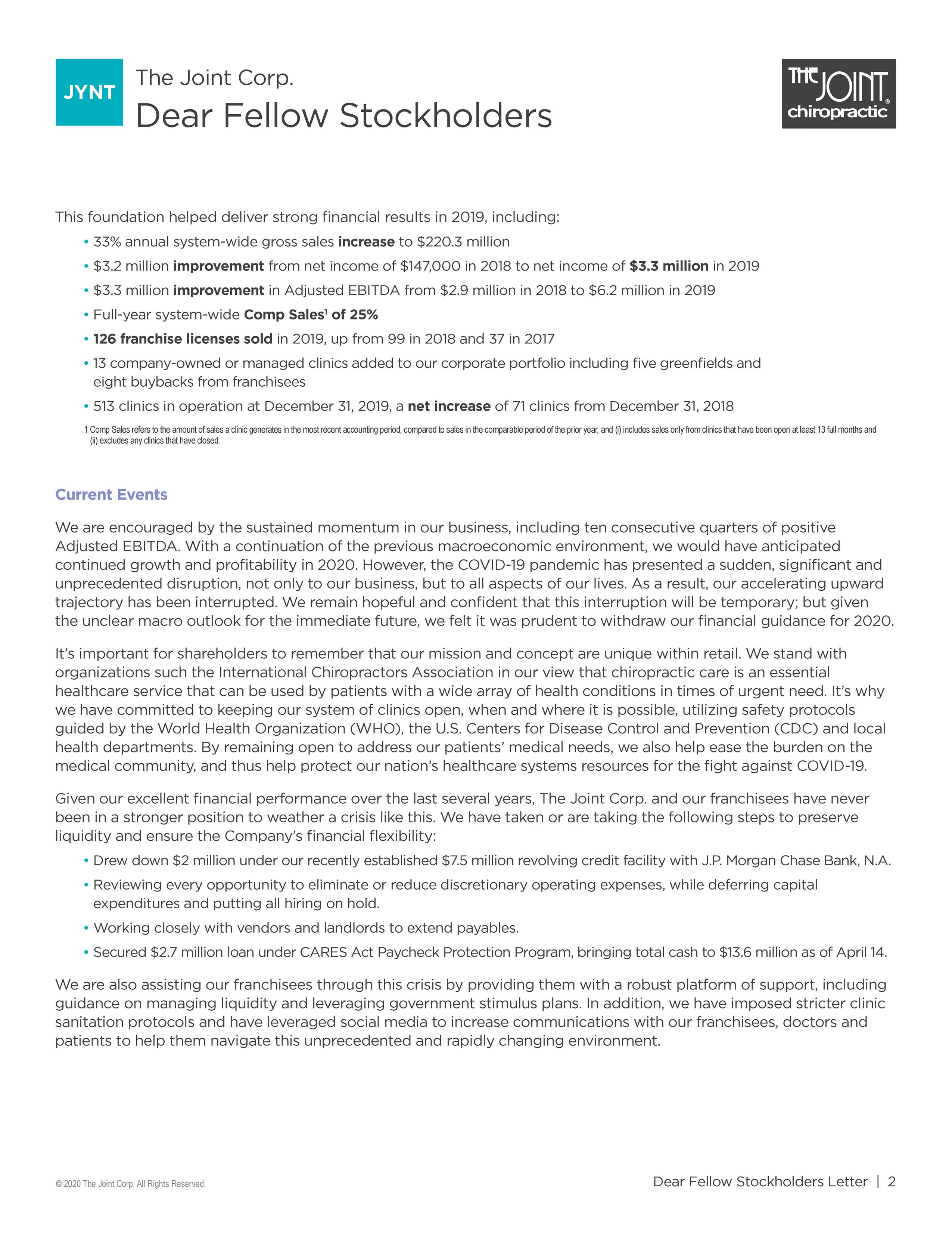 This foundation helped deliver strong financial results in 2019, including: • 33% annual system - wide gross sales increase to $220.3 million • $3.2 million improvement from net income of $147,000 in 2018 to net income of $3.3 million in 2019 • $3.3 million improvement in Adjusted EBITDA from $2.9 million in 2018 to $6.2 million in 2019 • Full - year system - wide Comp Sales 1 of 25% • 126 franchise licenses sold in 2019, up from 99 in 2018 and 37 in 2017 • 13 company - owned or managed clinics added to our corporate portfolio including five greenfields and eight buybacks from franchisees • 513 clinics in operation at December 31, 2019, a net increase of 71 clinics from December 31, 2018 1 Comp Sales refers to the amount of sales a clinic generates in the most recent accounting period, compared to sales in the comparable period of the prior year, and (i) includes sales only from clinics that have been open at least 13 full months and (ii) excludes any clinics that have closed. Current Events We are encouraged by the sustained momentum in our business, including ten consecutive quarters of positive Adjusted EBITDA. With a continuation of the previous macroeconomic environment, we would have anticipated continued growth and profitability in 2020. However, the COVID - 19 pandemic has presented a sudden, significant and unprecedented disruption, not only to our business, but to all aspects of our lives. As a result, our accelerating upward trajectory has been interrupted. We remain hopeful and confident that this interruption will be temporary; but given the unclear macro outlook for the immediate future, we felt it was prudent to withdraw our financial guidance for 2020. It’s important for shareholders to remember that our mission and concept are unique within retail. We stand with organizations such the International Chiropractors Association in our view that chiropractic care is an essential healthcare service that can be used by patients with a wide array of health conditions in times of urgent need. It’s why we have committed to keeping our system of clinics open, when and where it is possible, utilizing safety protocols guided by the World Health Organization (WHO), the U.S. Centers for Disease Control and Prevention (CDC) and local health departments. By remaining open to address our patients’ medical needs, we also help ease the burden on the medical community, and thus help protect our nation’s healthcare systems resources for the fight against COVID - 19. Given our excellent financial performance over the last several years, The Joint Corp. and our franchisees have never been in a stronger position to weather a crisis like this. We have taken the following steps to preserve liquidity and ensure the Company’s financial flexibility: • Drew down $2 million under our recently established $7.5 million revolving credit facility with J.P. Morgan Chase Bank, N.A. • Reviewing every opportunity to eliminate or reduce discretionary operating expenses, while deferring capital expenditures and put all hiring on hold. • Working closely with vendors and landlords to extend payables. • Secured $2.7 million loan under CARES Act Paycheck Protection Program, bringing total cash to $13.6 million as of April 14. We are also assisting our franchisees through this crisis by providing them with a robust platform of support, including guidance on managing liquidity and leveraging government stimulus plans. In addition, we have imposed stricter clinic sanitation protocols and have leveraged social media to increase communications with our franchisees, doctors and patients to help them navigate this unprecedented and rapidly changing environment. Dear Fellow Stockholders Letter | 2 © 2020 The Joint Corp. All Rights Reserved. The Joint Corp. Dear Fellow Stockholders JYNT