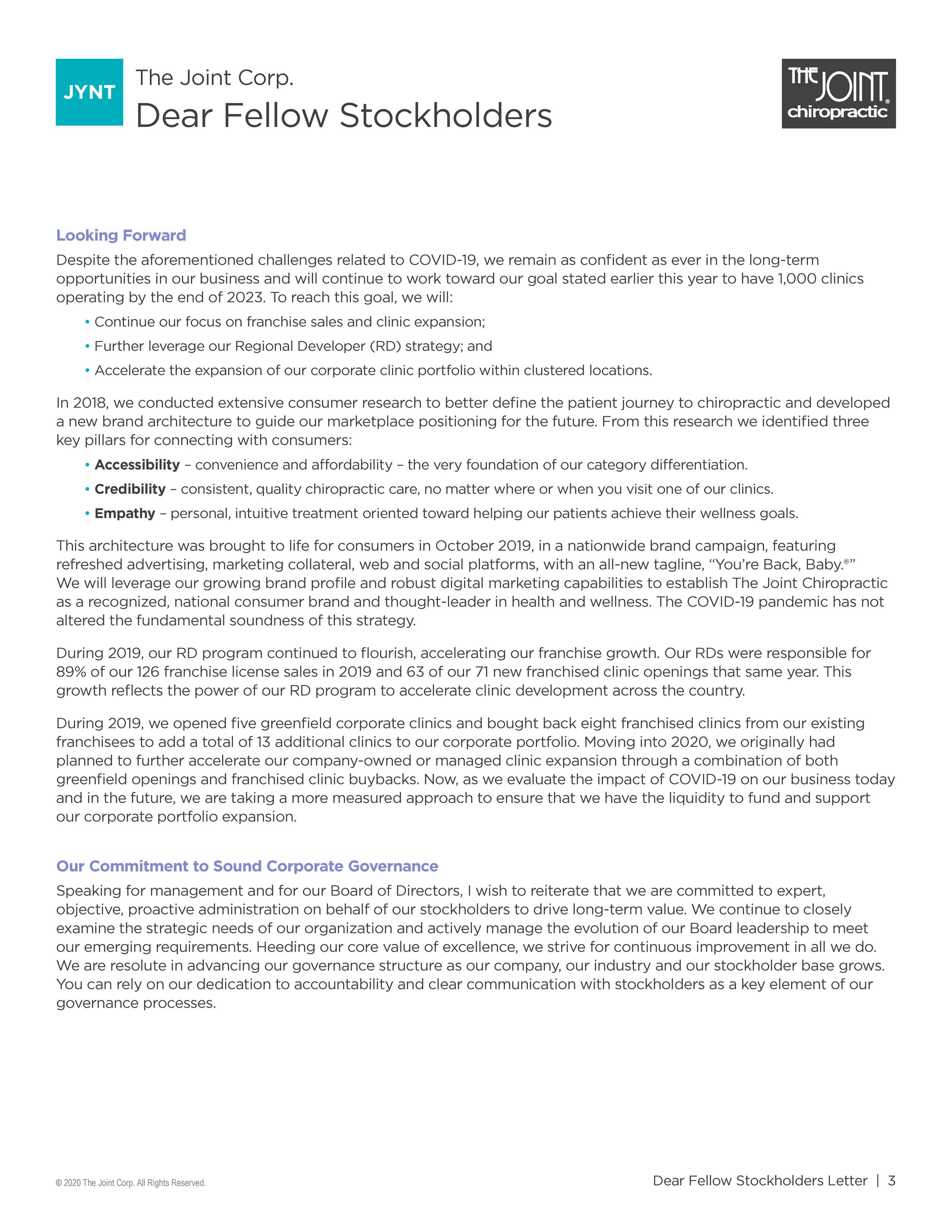 Looking Forward Despite the aforementioned challenges related to COVID - 19, we remain as confident as ever in the long - term opportunities in our business and will continue to work toward our goal stated earlier this year to have 1,000 clinics operating by the end of 2023. To reach this goal, we will: • Continue our focus on franchise sales and clinic expansion; • Further leverage our Regional Developer (RD) strategy; and • Accelerate the expansion of our corporate clinic portfolio within clustered locations. In 2018, we conducted extensive consumer research to better define the patient journey to chiropractic and developed a new brand architecture to guide our marketplace positioning for the future. From this research we identified three key pillars for connecting with consumers: • Accessibility – convenience and affordability – the very foundation of our category differentiation. • Credibility – consistent, quality chiropractic care, no matter where or when you visit one of our clinics. • Empathy – personal, intuitive treatment oriented toward helping our patients achieve their wellness goals. This architecture was brought to life for consumers in October 2019 , in a nationwide brand campaign, featuring refreshed advertising, marketing collateral, web and social platforms, with an all - new tagline, “You’re Back, Baby . ®” We will leverage our growing brand profile and robust digital marketing capabilities to establish The Joint Chiropractic as a recognized, national consumer brand and thought - leader in health and wellness . The COVID - 19 pandemic has not altered the fundamental soundness of this strategy . During 2019, our RD program continued to flourish, accelerating our franchise growth. Our RDs were responsible for 89% of our 126 franchise license sales in 2019 and 63 of our 71 new franchised clinic openings that same year. This growth reflects the power of our RD program to accelerate clinic development across the country. During 2019, we opened five greenfield corporate clinics and bought back eight franchised clinics from our existing franchisees to add a total of 13 additional clinics to our corporate portfolio. Moving into 2020, we originally had planned to accelerate our company - owned or managed clinic expansion through a combination of both greenfield openings and franchised clinic buybacks. Now, as we evaluate the impact of COVID - 19 on our business today and in the future, we are taking a more measured approach to ensure that we have the liquidity to fund and support our corporate portfolio expansion. Our Commitment to Sound Corporate Governance Speaking for management and for our Board of Directors, I wish to reiterate that we are committed to expert, objective, proactive administration on behalf of our stockholders to drive long - term value. We continue to closely examine the strategic needs of our organization and actively manage the evolution of our Board leadership to meet our emerging requirements. Heeding our core value of excellence, we strive for continuous improvement in all we do. We are resolute in advancing our governance structure as our company, our industry and our stockholder base grows. You can rely on our dedication to accountability and clear communication with stockholders as a key element of our governance processes. The Joint Corp. Dear Fellow Stockholders JYNT further Dear Fellow Stockholders Letter | 3 © 2020 The Joint Corp. All Rights Reserved.