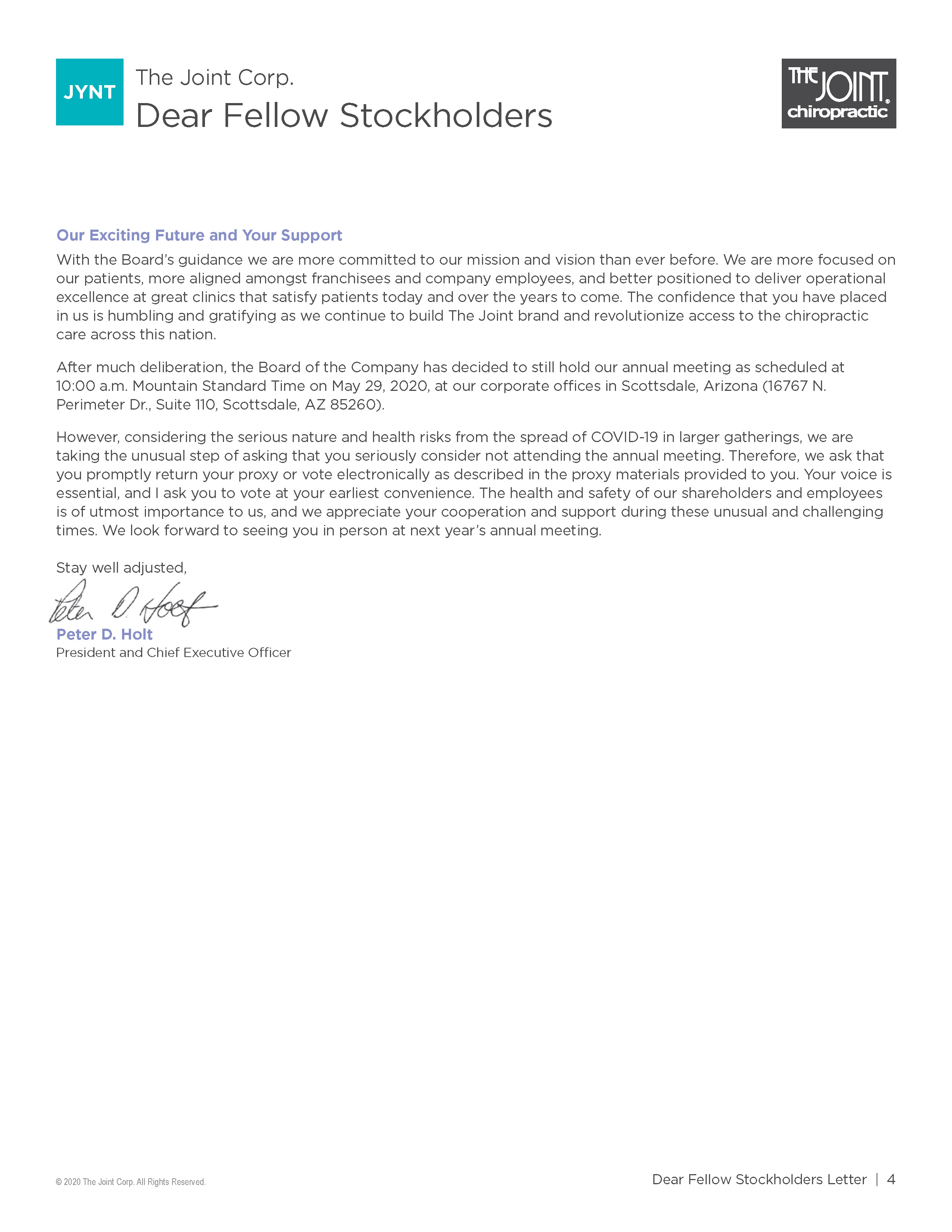 The Joint Corp. Dear Fellow Stockholders JYNT Our Exciting Future and Your Support With the Board’s guidance we are more committed to our mission and vision than ever before. We are more focused on our patients, more aligned amongst franchisees and company employees, and better positioned to deliver operational excellence at great clinics that satisfy patients today and over the years to come. The confidence that you have placed in us is humbling and gratifying as we continue to build The Joint brand and revolutionize access to the chiropractic care across this nation. After much deliberation, the Board of the Company has decided to still hold our annual meeting as scheduled at 10:00 a.m. Mountain Standard Time on May 29, 2020, at our corporate offices in Scottsdale, Arizona (16767 N. Perimeter Dr., Suite 110, Scottsdale, AZ 85260). However, considering the serious nature and health risks from the spread of COVID - 19 in larger gatherings, we are taking the unusual step of asking that you seriously consider not attending the annual meeting. Therefore, we ask that you promptly return your proxy or vote electronically as described in the proxy materials provided to you. Your voice is essential, and I ask you to vote at your earliest convenience. The health and safety of our shareholders and employees is of utmost importance to us, and we appreciate your cooperation and support during these unusual and challenging times. We look forward to seeing you in person at next year’s annual meeting. Stay well adjusted, Dear Fellow Stockholders Letter | 4 © 2020 The Joint Corp. All Rights Reserved. Peter D. Holt President and Chief Executive Officer