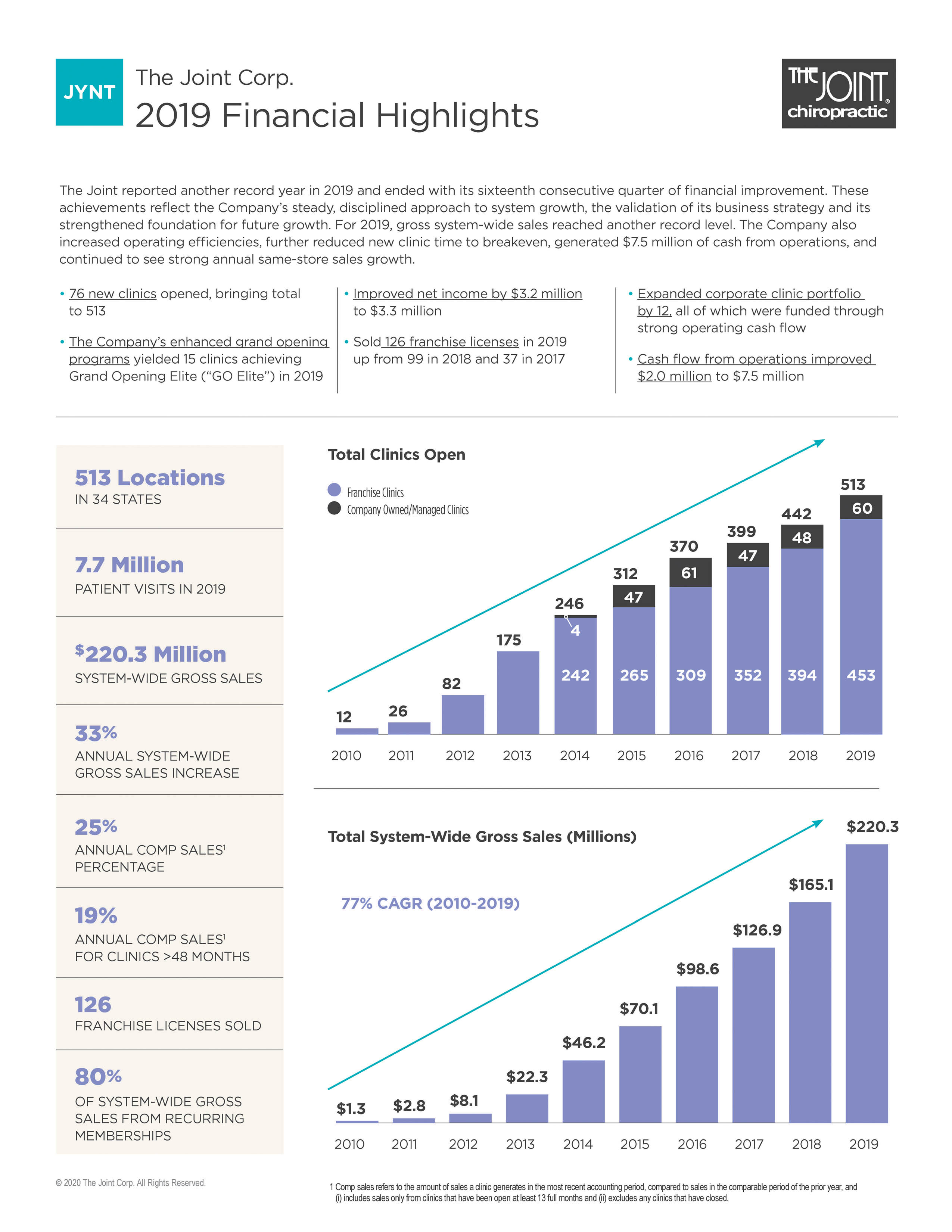 © 2020 The Joint Corp. All Rights Reserved. 1 Comp sales refers to the amount of sales a clinic generates in the most recent accounting period, compared to sales in the comparable period of the prior year, and (i) includes sales only from clinics that have been open at least 13 full months and (ii) excludes any clinics that have closed. Total System - Wide Gross Sales (Millions) 77% CAGR (2010 - 2019) The Joint Corp. 2019 Financial Highlights JYNT • 76 new clinics opened, bringing total to 513 • The Company’s enhanced grand opening programs yielded 15 clinics achieving Grand Opening Elite (“GO Elite”) in 2019 • Improved net income by $3.2 million to $3.3 million • Sold 126 franchise licenses in 2019 up from 99 in 2018 and 37 in 2017 • Expanded corporate clinic portfolio by 12 , all of which were funded through strong operating cash flow • Cash flow from operations improved $2.0 million to $7.5 million The Joint reported another record year in 2019 and ended with its sixteenth consecutive quarter of financial improvement. These achievements reflect the Company’s steady, disciplined approach to system growth, the validation of its business strategy and its strengthened foundation for future growth. For 2019, gross system - wide sales reached another record level. The Company also increased operating efficiencies, further reduced new clinic time to breakeven, generated $7.5 million of cash from operations, and continued to see strong annual same - store sales growth. Total Clinics Open Franchise Clinics Company Owned/Managed Clinics 513 Locations IN 34 STATES 7.7 Million PATIENT VISITS IN 2019 $ 220.3 Million SYSTEM - WIDE GROSS SALES 33 % ANNUAL SYSTEM - WIDE GROSS SALES INCREASE 25 % ANNUAL COMP SALES 1 PERCENTAGE 19% ANNUAL COMP SALES 1 FOR CLINICS >48 MONTHS 126 FRANCHISE LICENSES SOLD 80 % OF SYSTEM - WIDE GROSS SALES FROM RECURRING MEMBERSHIPS 2 0 1 0 2 0 11 2 0 1 2 2 0 1 3 2 0 1 4 2 0 1 5 2 0 1 6 2 0 1 7 2 0 1 8 2 0 19 1 75 2 4 6 312 370 3 9 9 26 12 82 47 61 47 442 4 242 265 309 352 394 48 $126.9 $98.6 $70.1 $46.2 $22.3 $1.3 $2.8 $8.1 2010 2011 2012 2013 2014 2015 2016 2017 2018 2019 $165 . 1 $22 0 .3 513 453 60