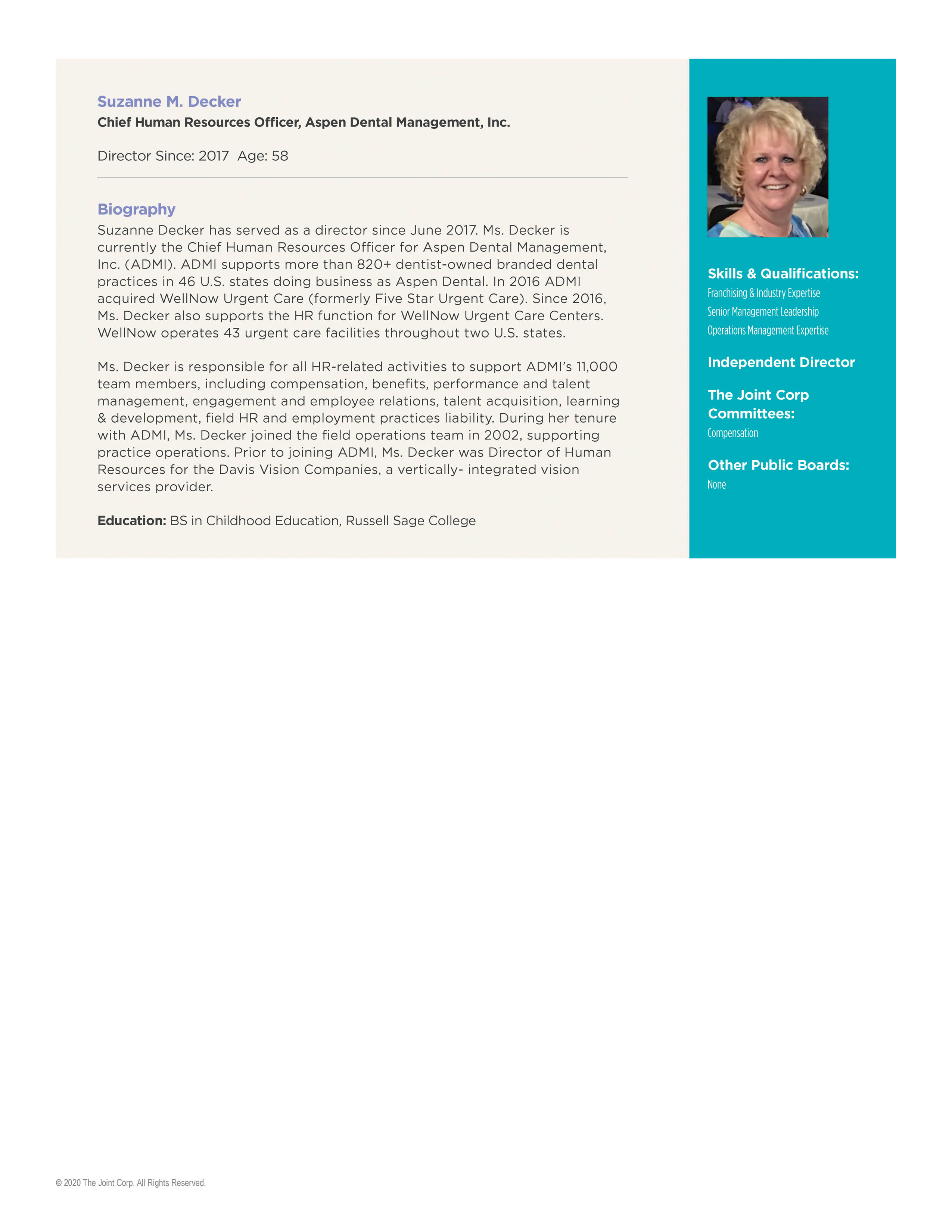 | Suzanne M. Decker | 58 | 2017 | Chief Human Resources Officer for Aspen Dental Management, Inc. | · Compensation (Chair) | ||||